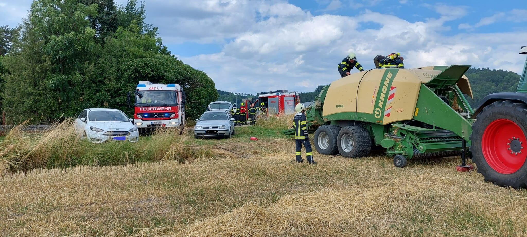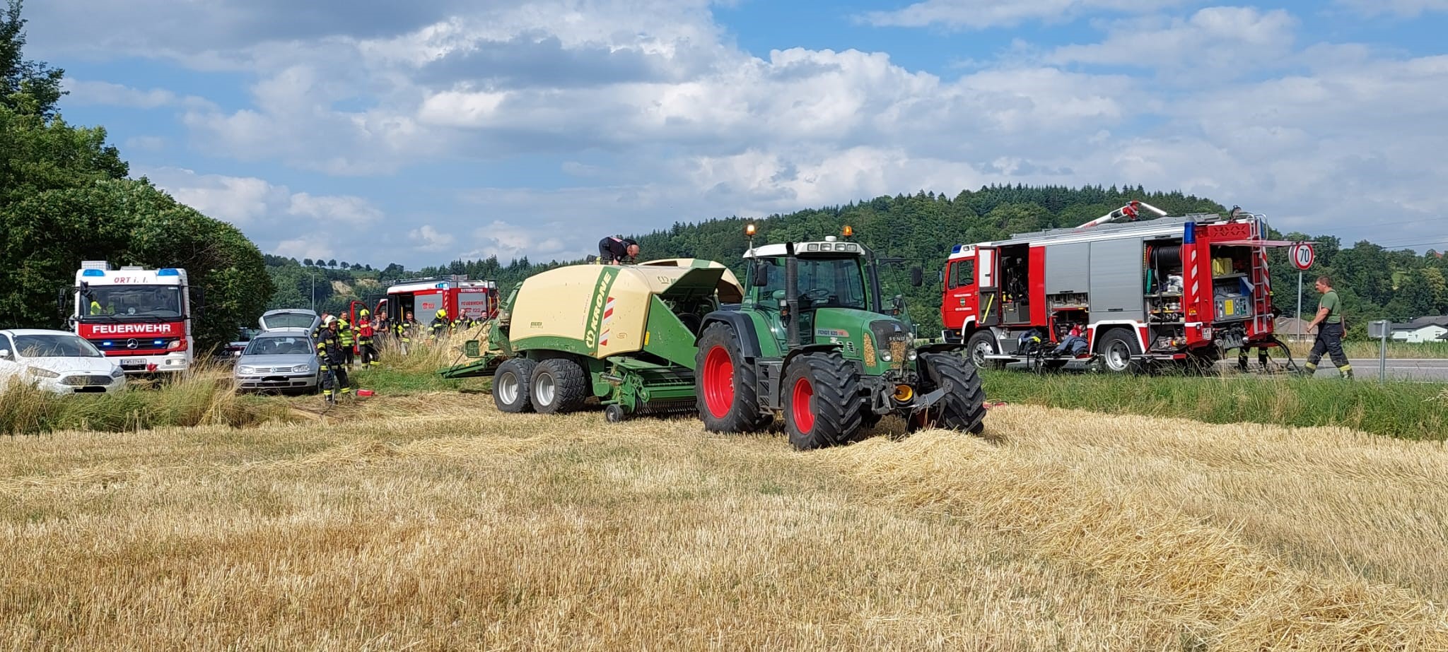 Auf einem Feld unweit der Autobahnauffahrt A8, fing eine Heuballenpresse während des Betriebes Feuer.
