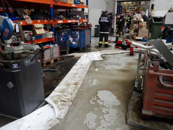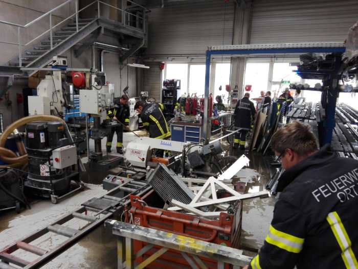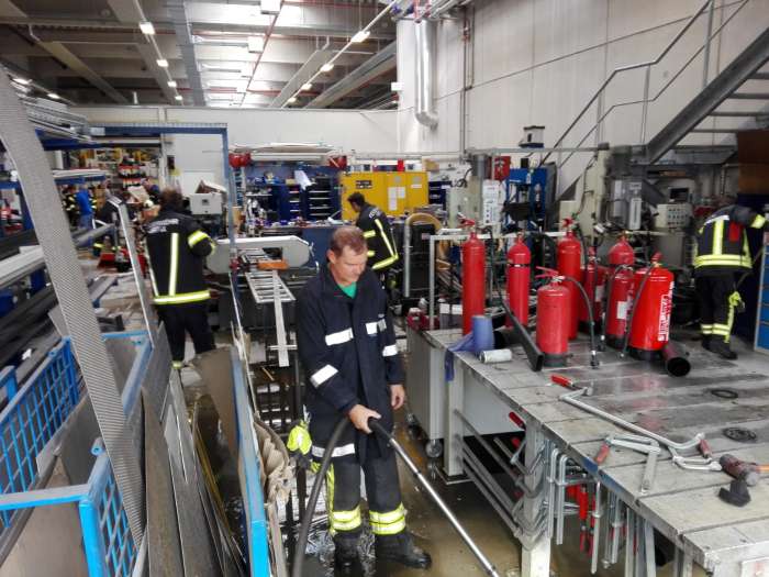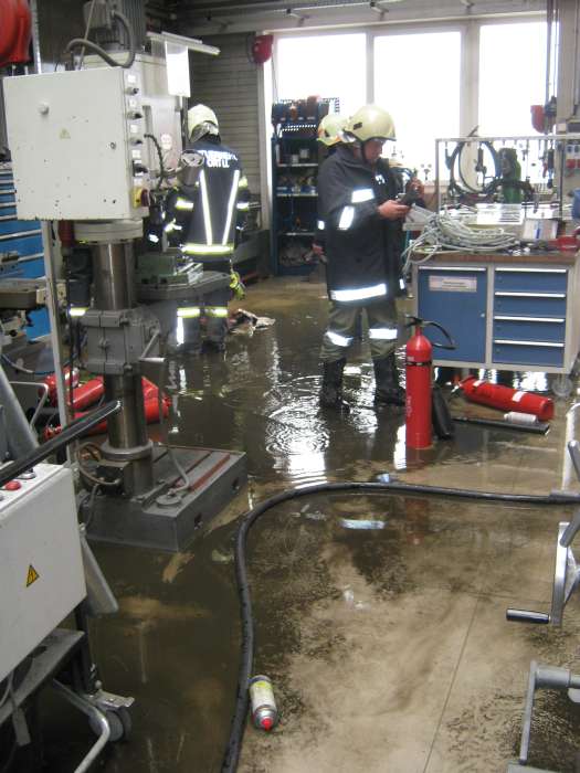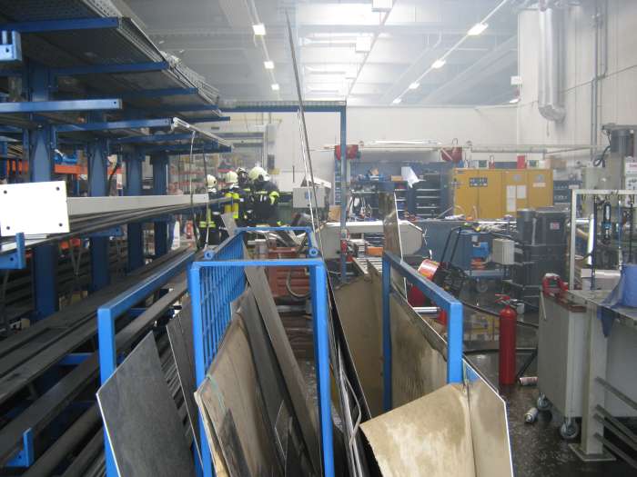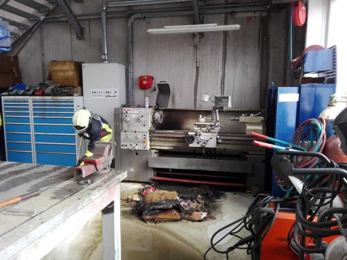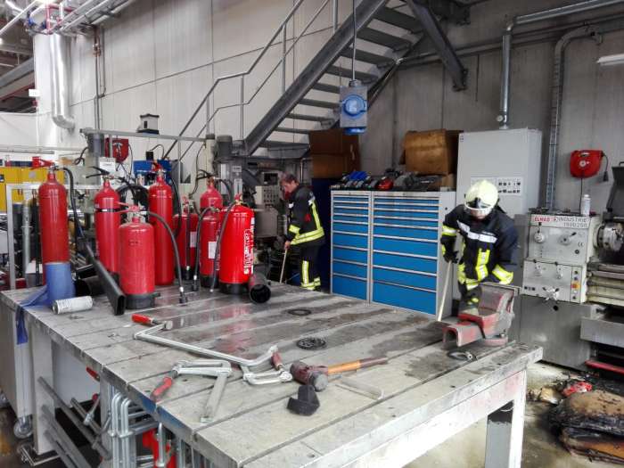 In der Werskstätte im Bereich einer Drehbank war ein Brand ausgebrochen. Ein weiteres Übergreifen der Flammen konnte durch Mitarbeiter die mittels Feuerlöscher den Brand eindämmen sowie 2 ausgelösten Sprinkler verhindert werden. Ein Mitarbeiter wurde mit Verdacht auf Rauchgasvergiftung ins Krankenhaus Ried eingeliefert. Nachlöscharbeiten und entfernen des Löschwassers mittels Naßsauger wurden vor Einsatzende noch durchgeführt.