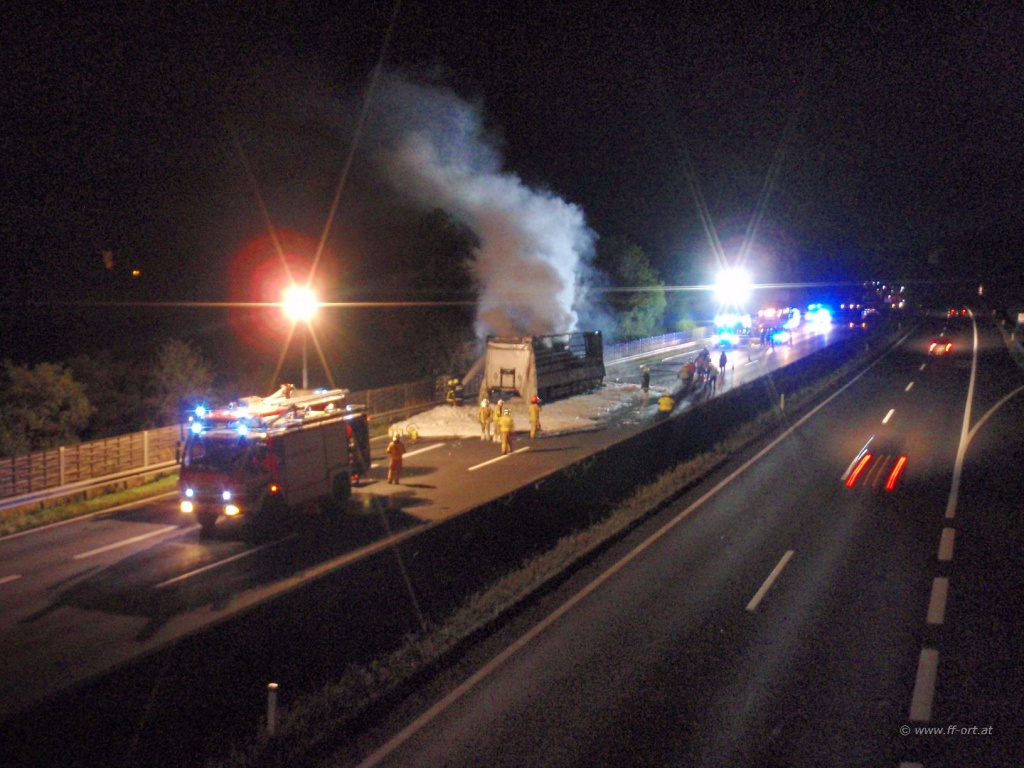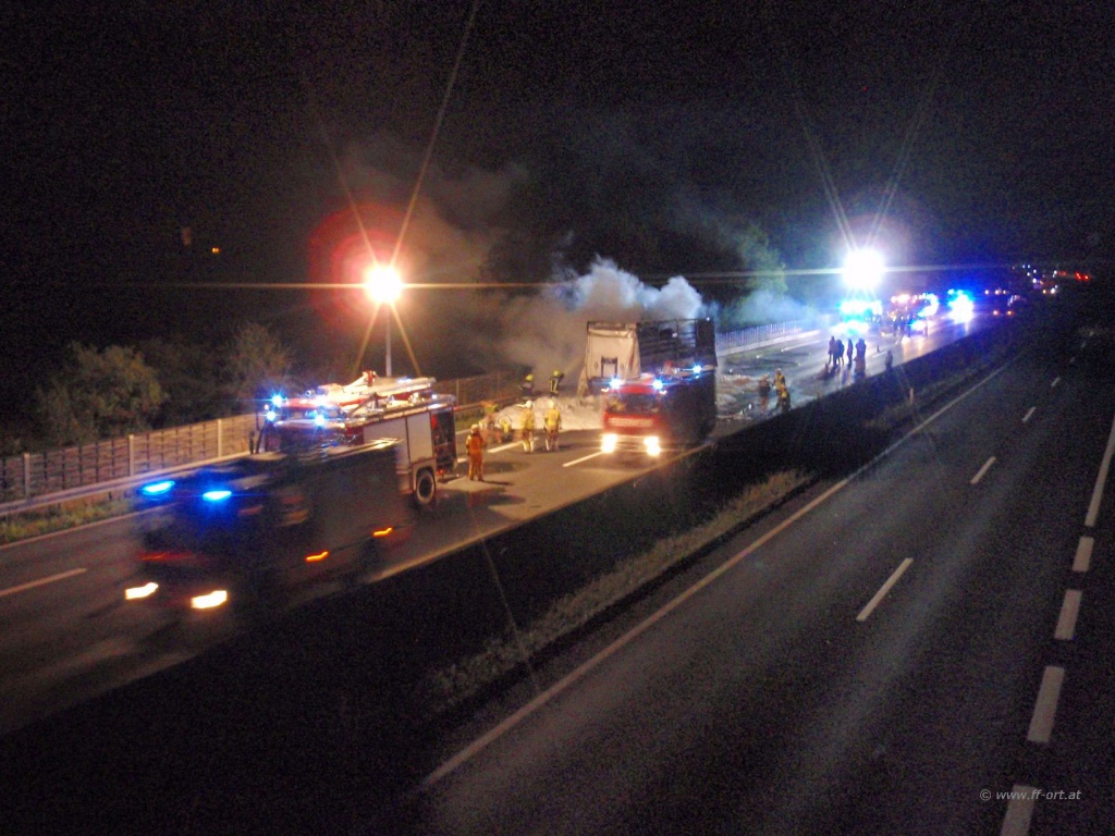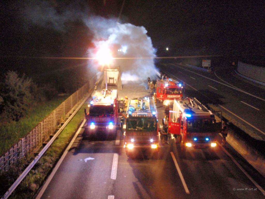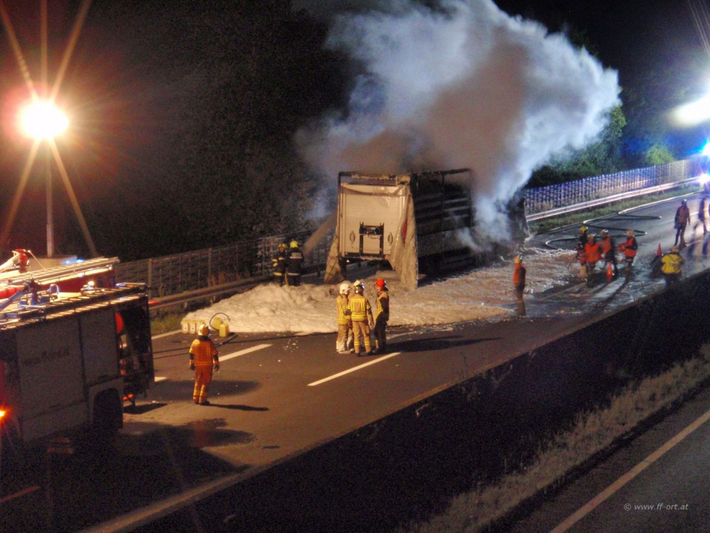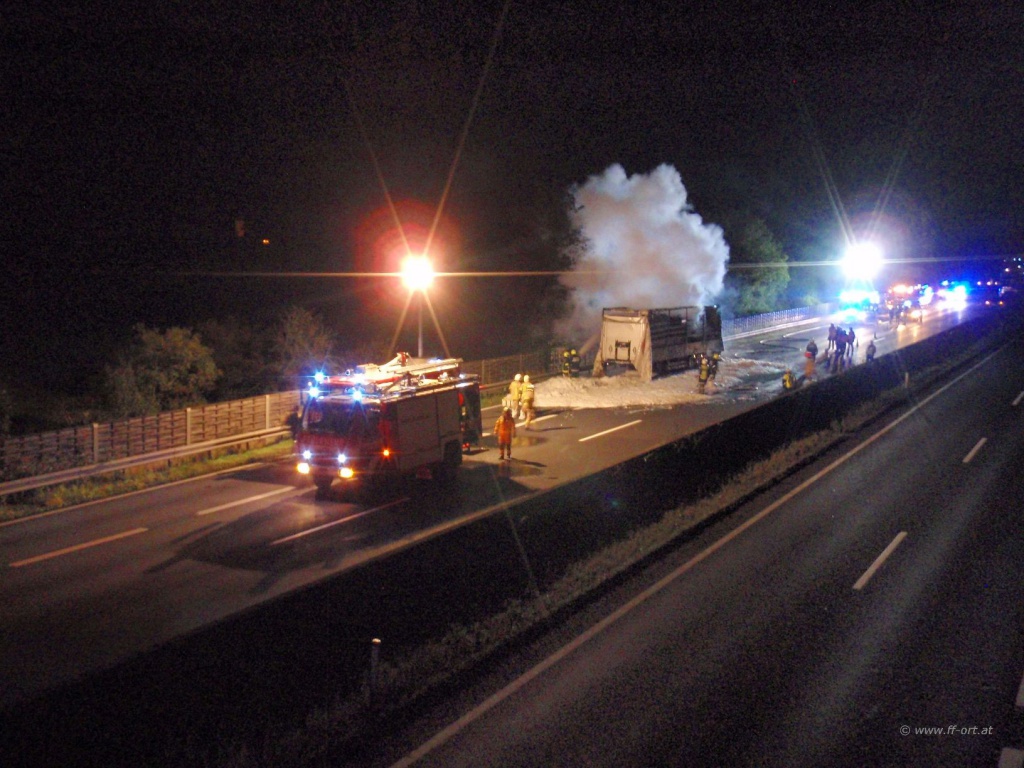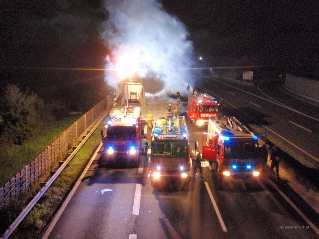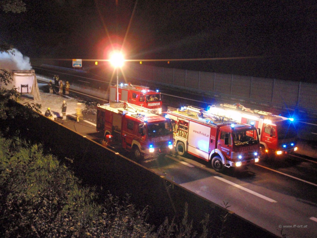Kurz nach Mitternacht wurden wir am 7. September 2015 gemeinsam mit den Feuerwehren Tumeltsham, Ried und Walchshausen zu einem Fahrzeugbrand alarmiert. Ein Sattelauflieger begann kurz vor der Ausfahrt Ort im Innkreis zu brennen.
