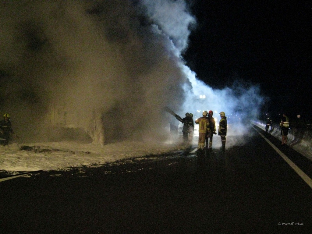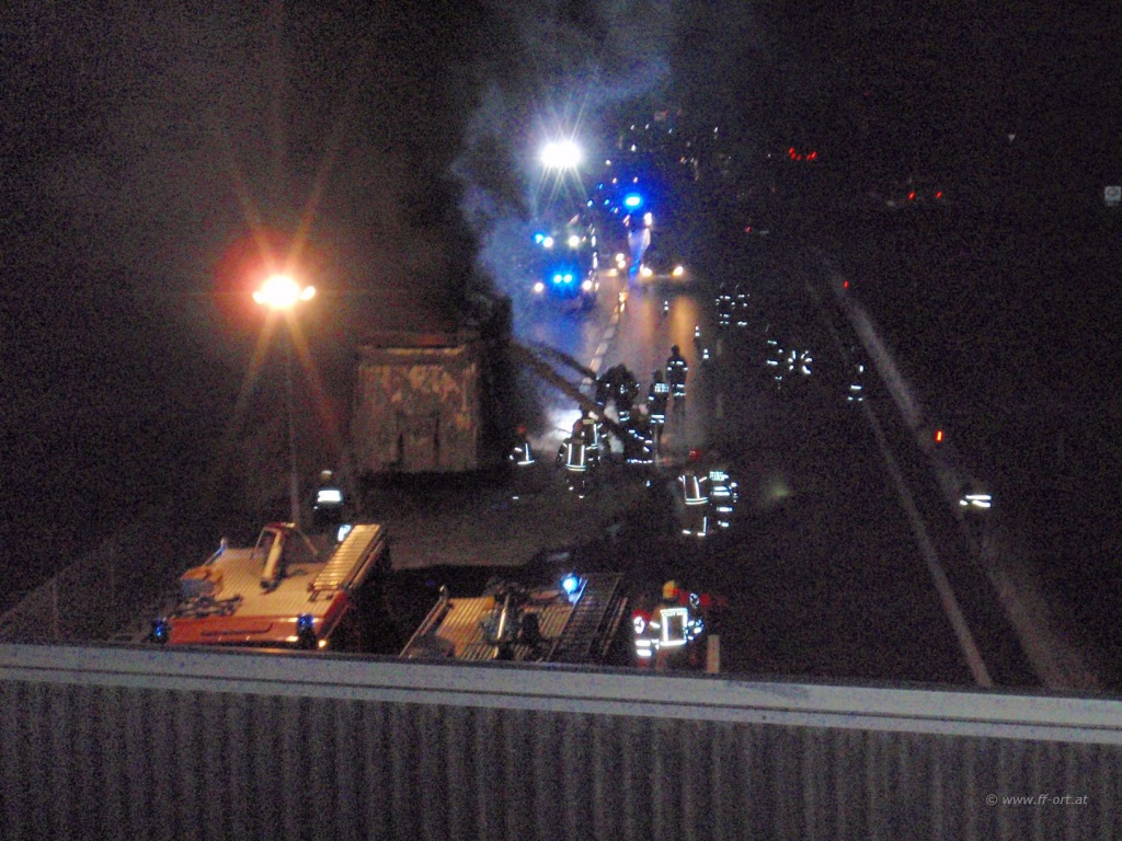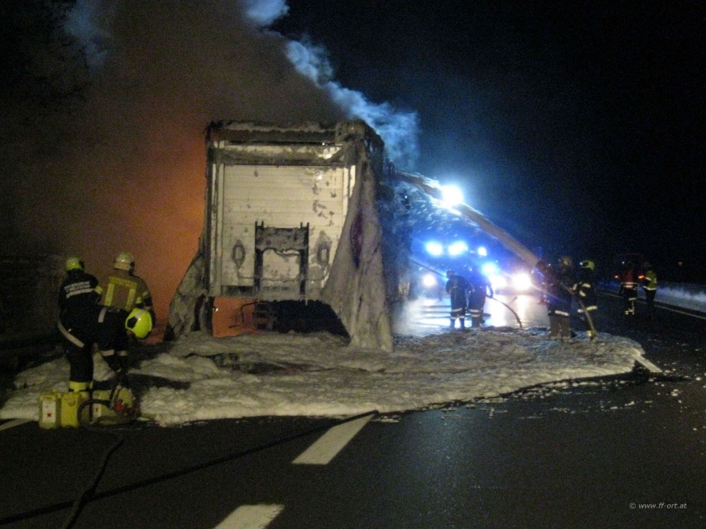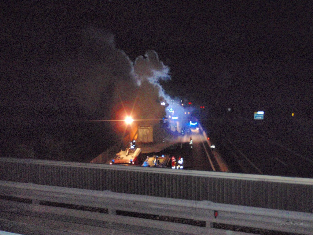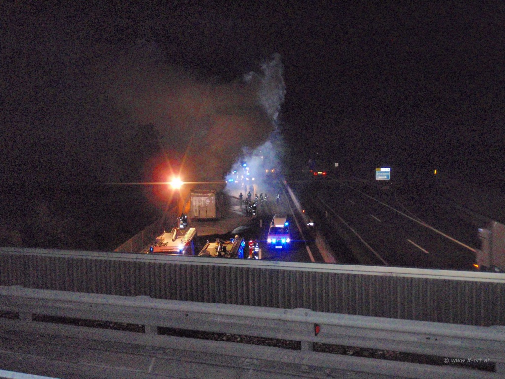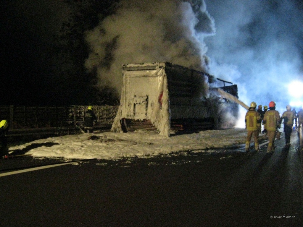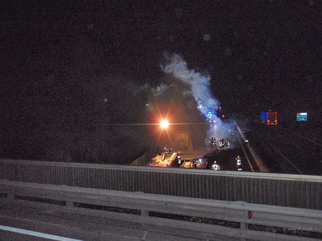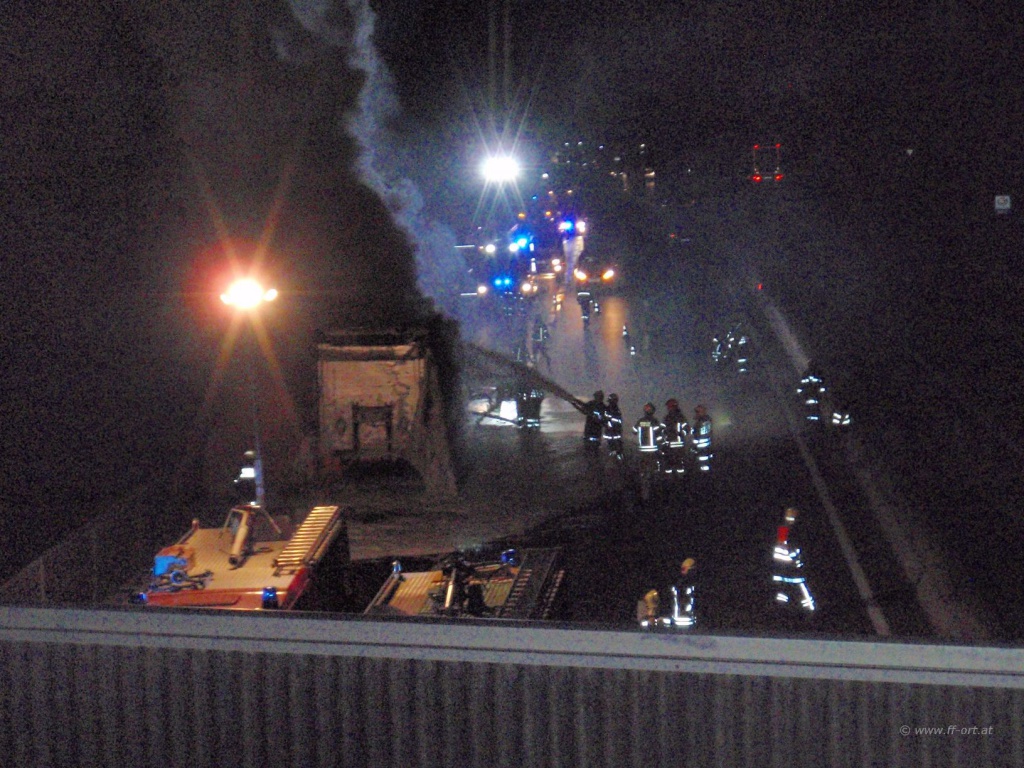 Kurz nach Mitternacht wurden wir am 7. September 2015 gemeinsam mit den Feuerwehren Tumeltsham, Ried und Walchshausen zu einem Fahrzeugbrand alarmiert. Ein Sattelauflieger begann kurz vor der Ausfahrt Ort im Innkreis zu brennen.