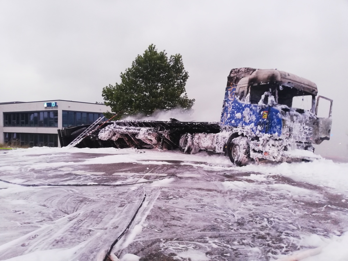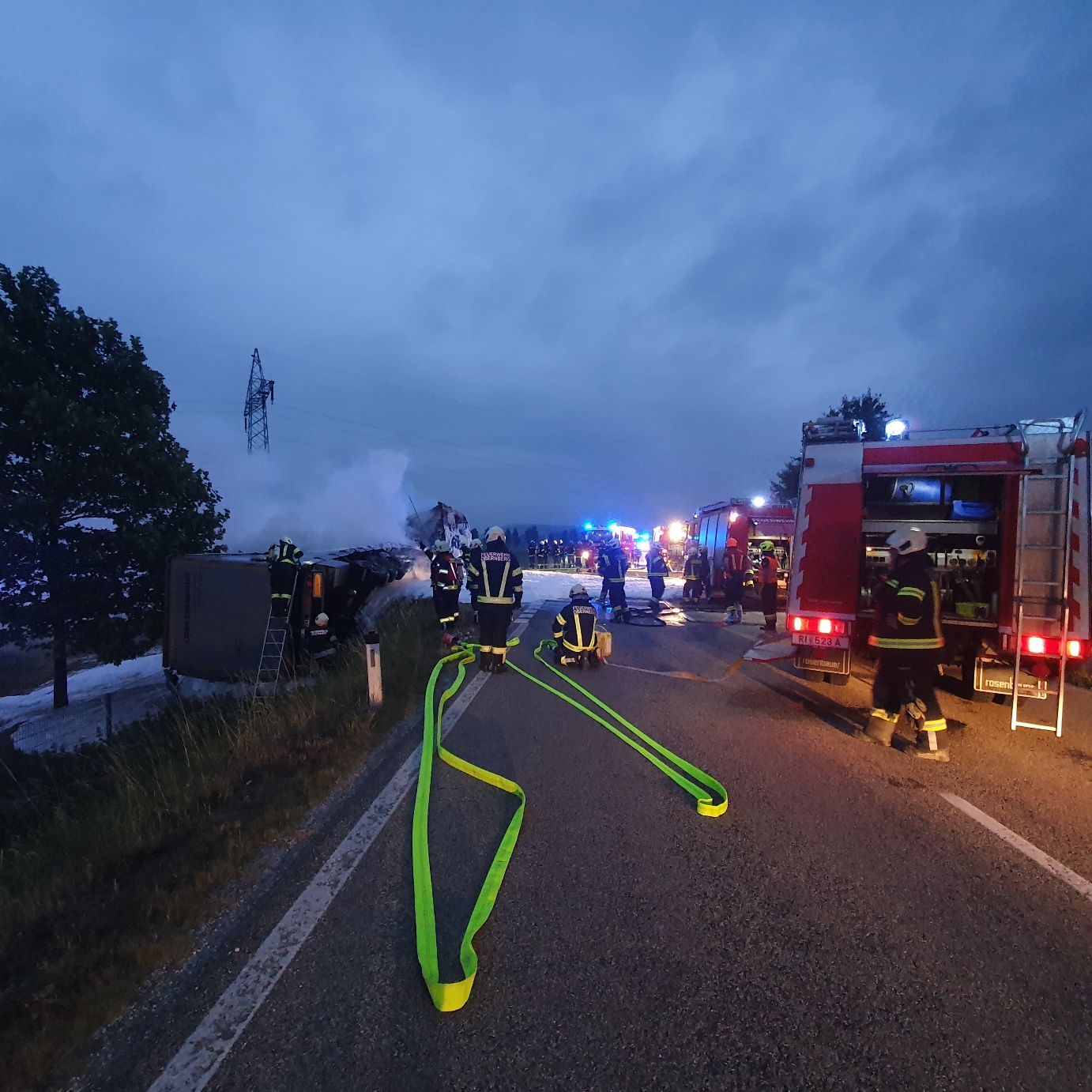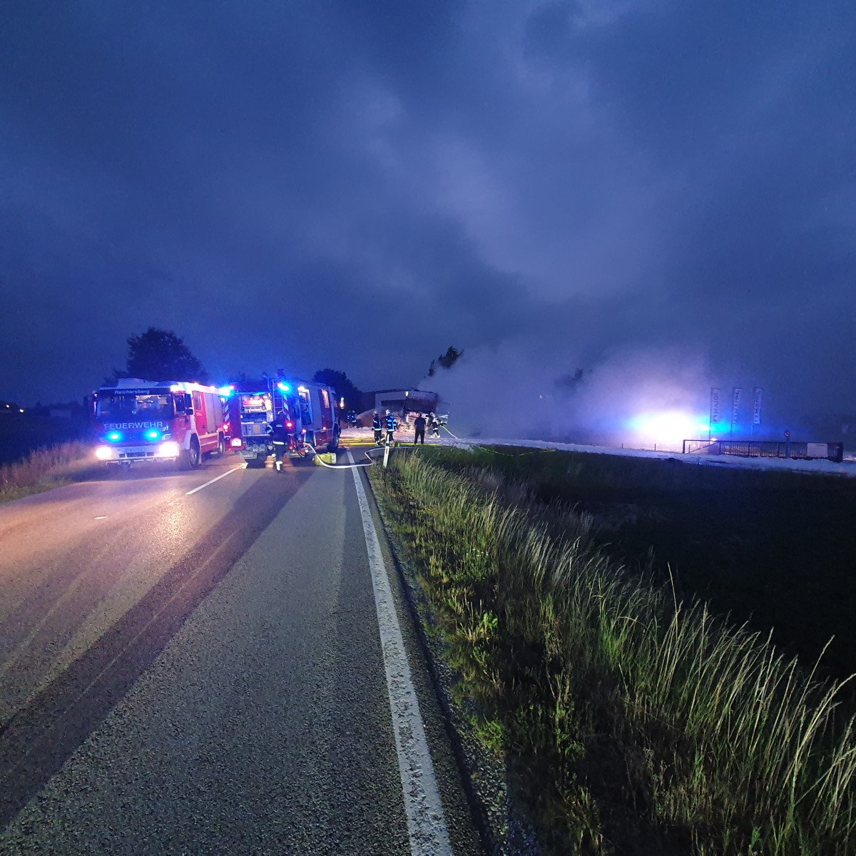 Der vermeintliche Gebäudebrand entpuppte sich als Brand eines voll beladenen Sattelkraftfahrzeuges, welches nach einem missglückten Wendemanöver in die Straßenböschung abrutschte und Feuer fing.