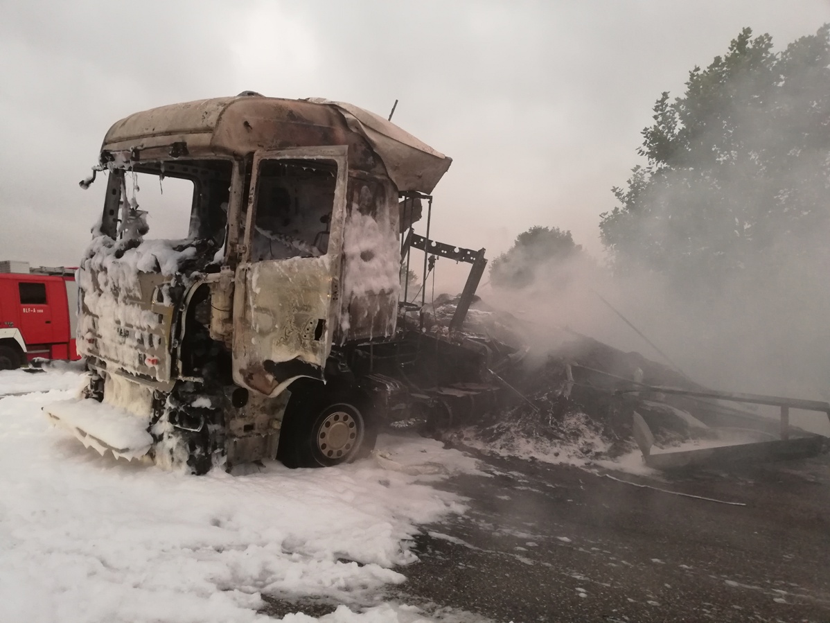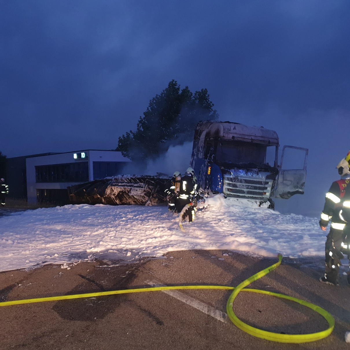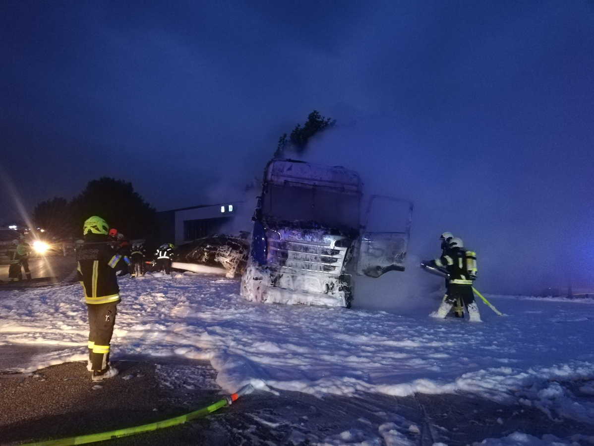 Der vermeintliche Gebäudebrand entpuppte sich als Brand eines voll beladenen Sattelkraftfahrzeuges, welches nach einem missglückten Wendemanöver in die Straßenböschung abrutschte und Feuer fing.