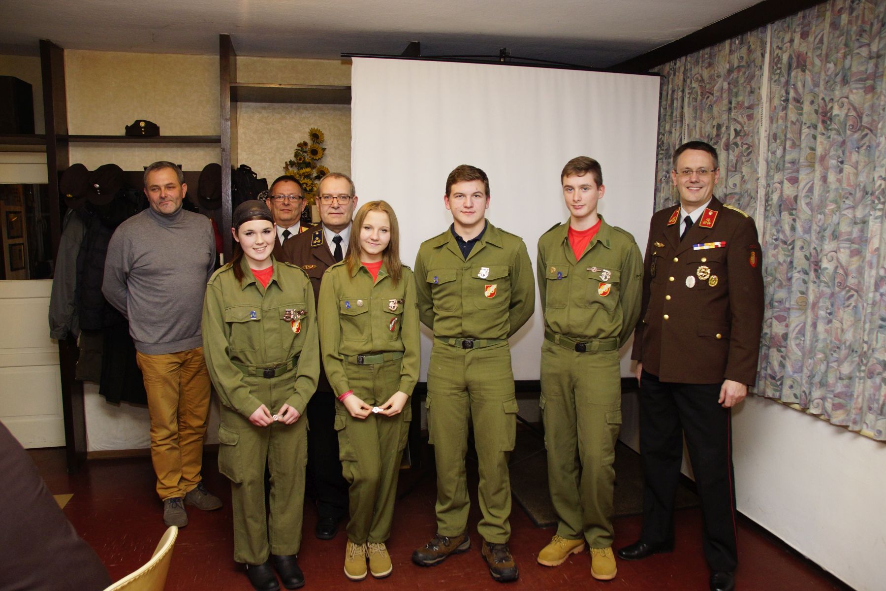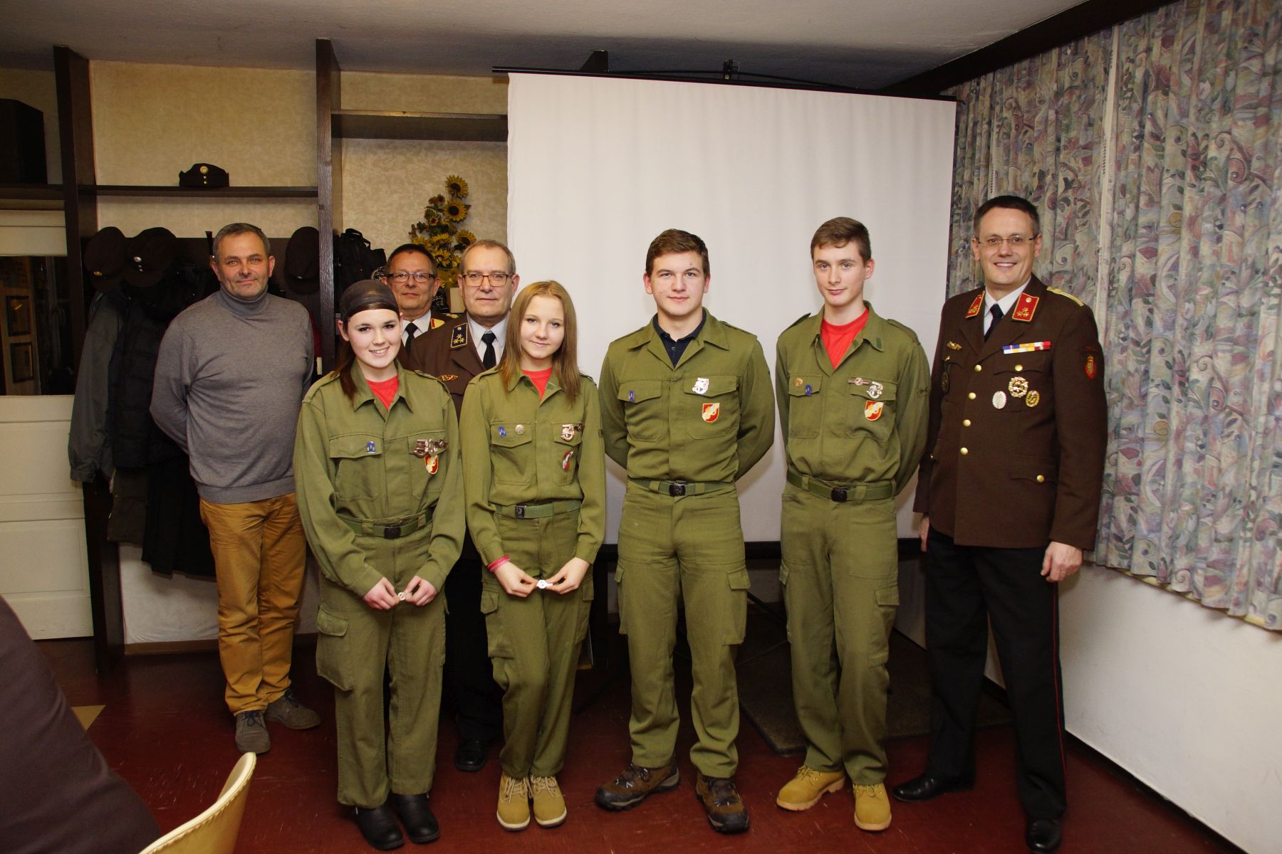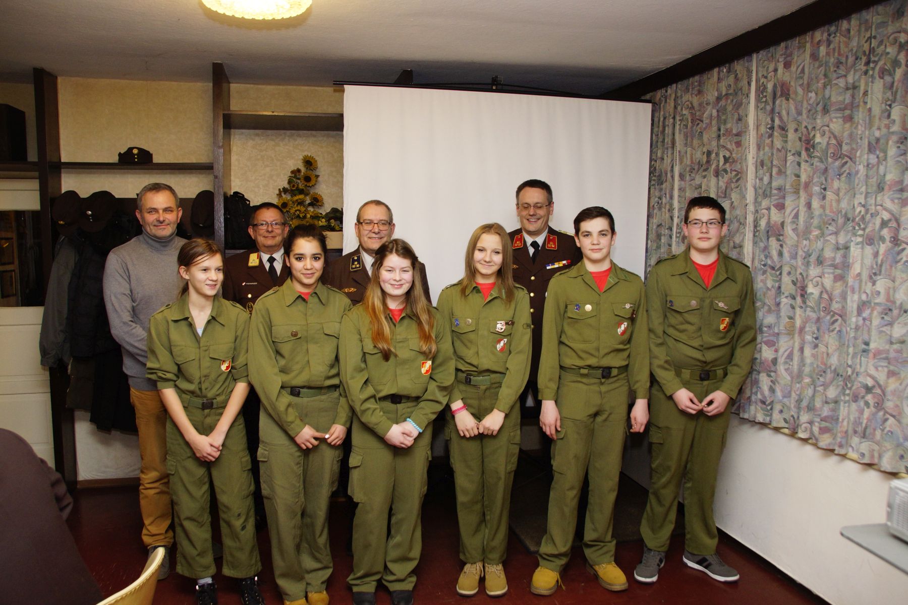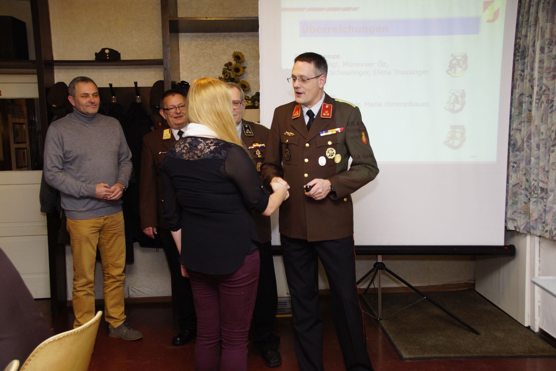 Auch die Jugend war sehr aktiv, was uns die beiden Jugendfeuerwehrmitglieder Lorenz Ranseder und Simon Salomon in ihrem Beitrag präsentieren durften. Die Jungs und Mädels investierten mit ihren Betreueren knapp 2.500 Stunden in Wissenstest, Bewerbe und weitere Aktivitäten. Ab 2016 wird die Gruppe vom neuen Jugendbetreuer Marcel Ranseder betreut. Mit einem kleinen Geschenk bedankte sich die Gruppe bei Fabian Witzmann, welcher nun die Funktion des Gruppenkommandanten von Karl Dietrich übernehmen wird.