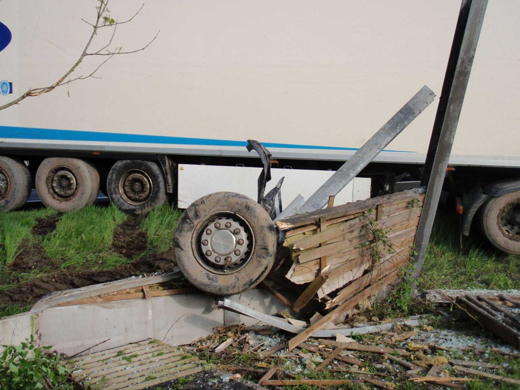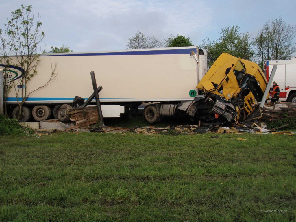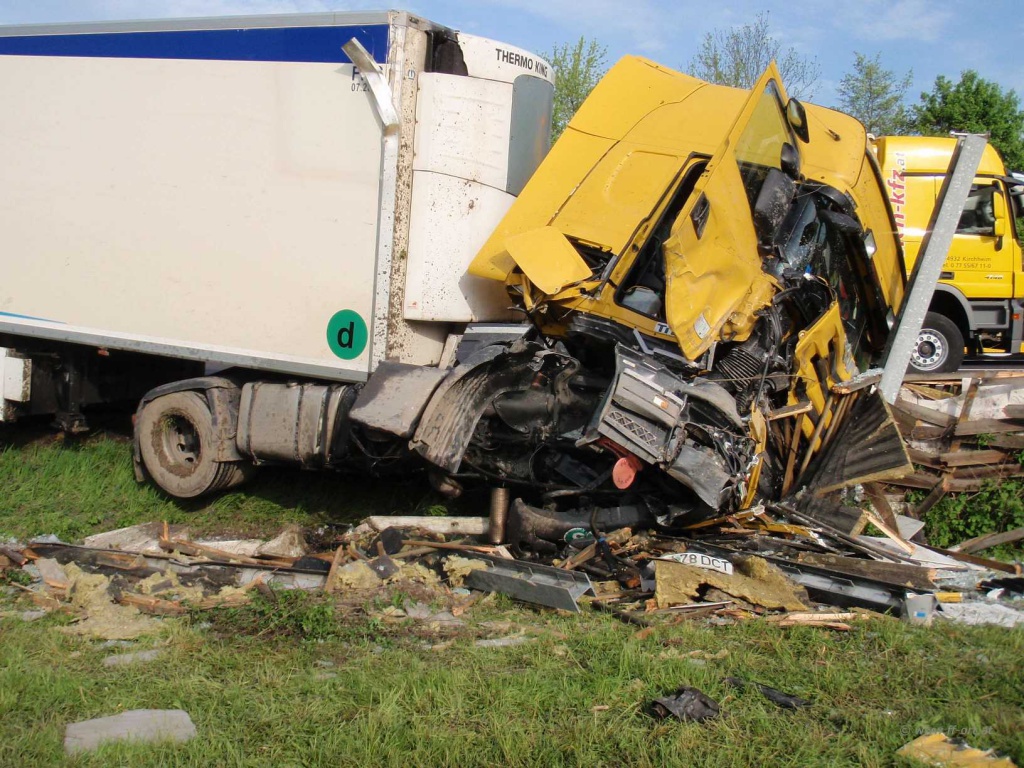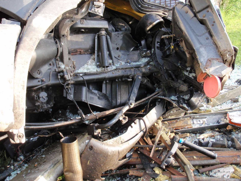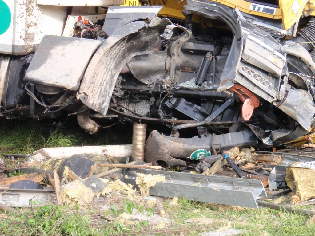 Durch die Wucht des Aufpralls wurde der Zugmaschine die Vorderachse komplett ausgerissen. Beide Dieseltanks wurde n erheblich beschädigt.
