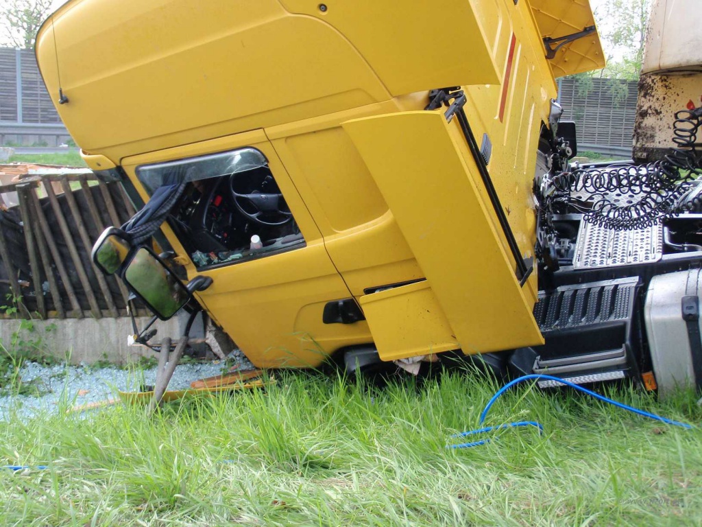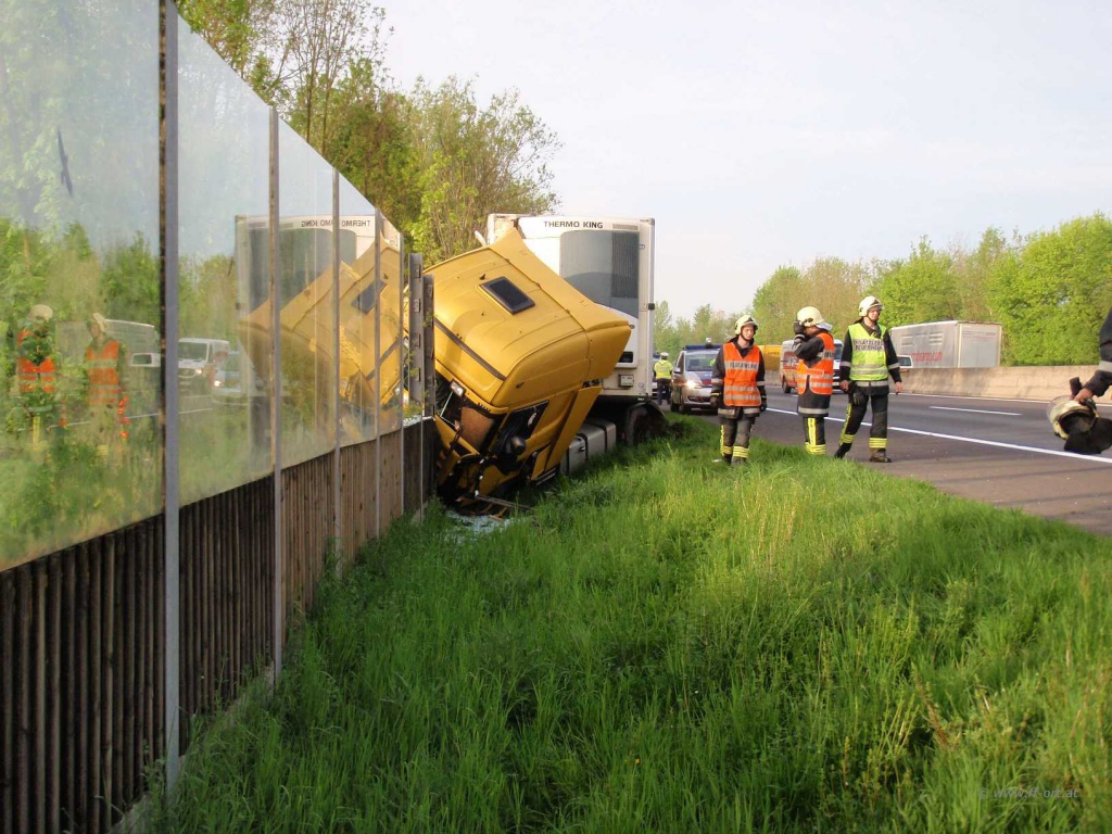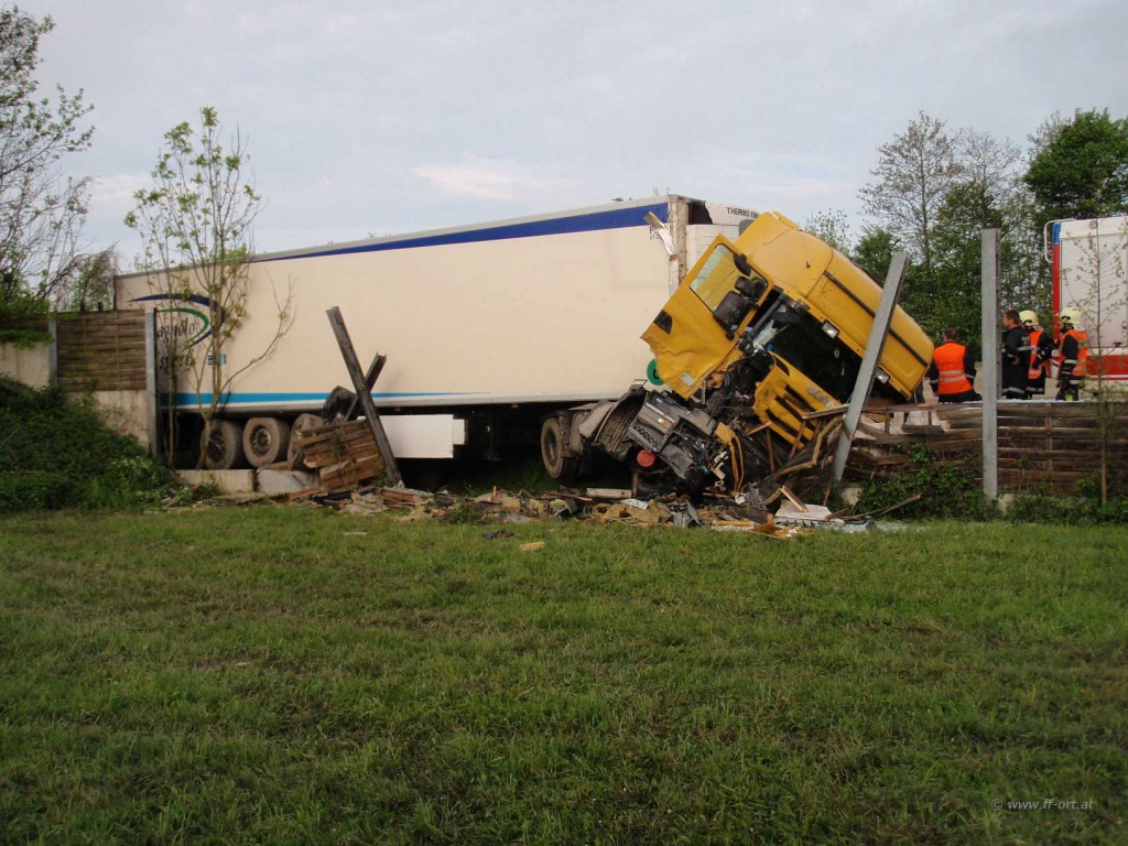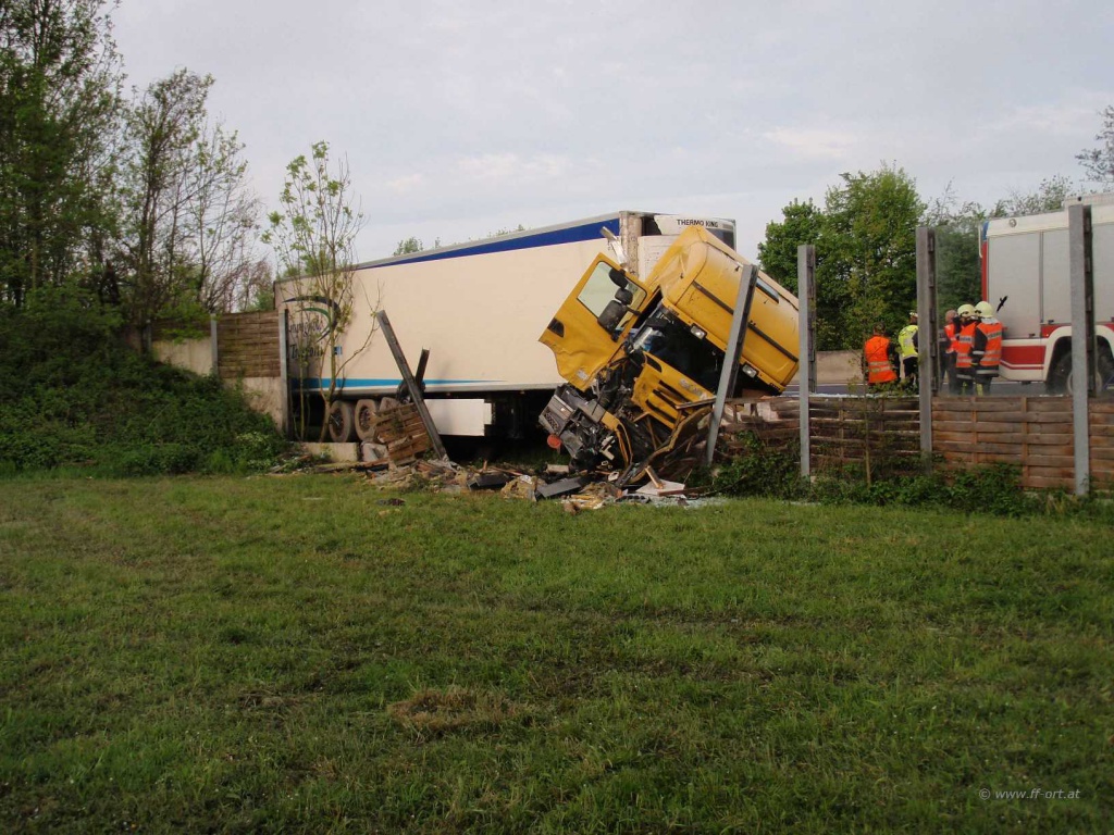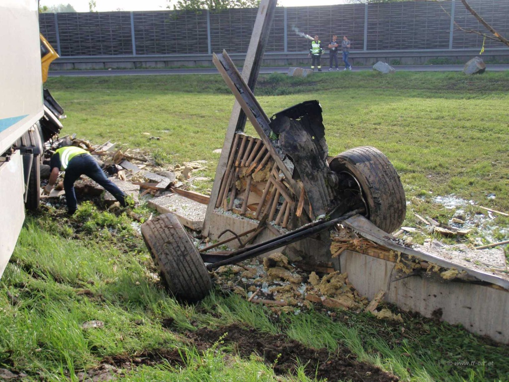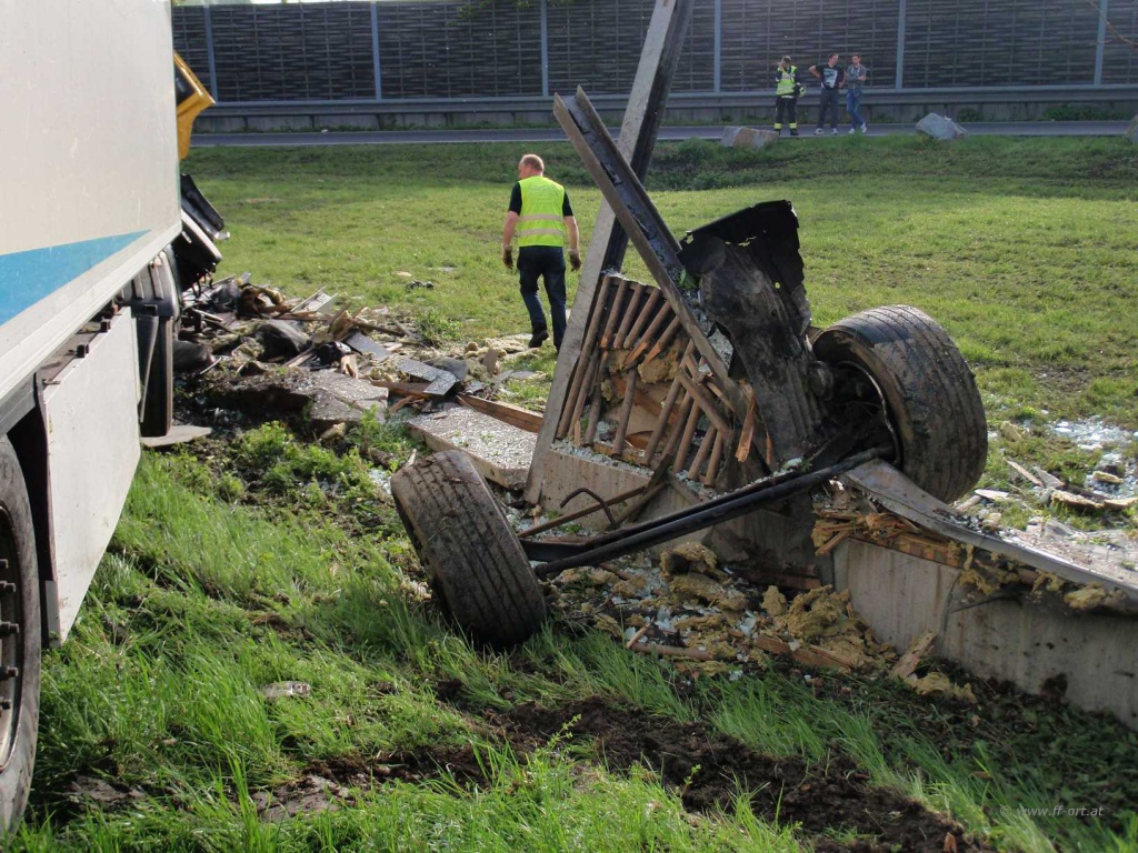 Ein Sattelschlepper war von der Autobahn abgekommen und prallte an die Lärmschutzwand, die den Parkplatz begrenzt.