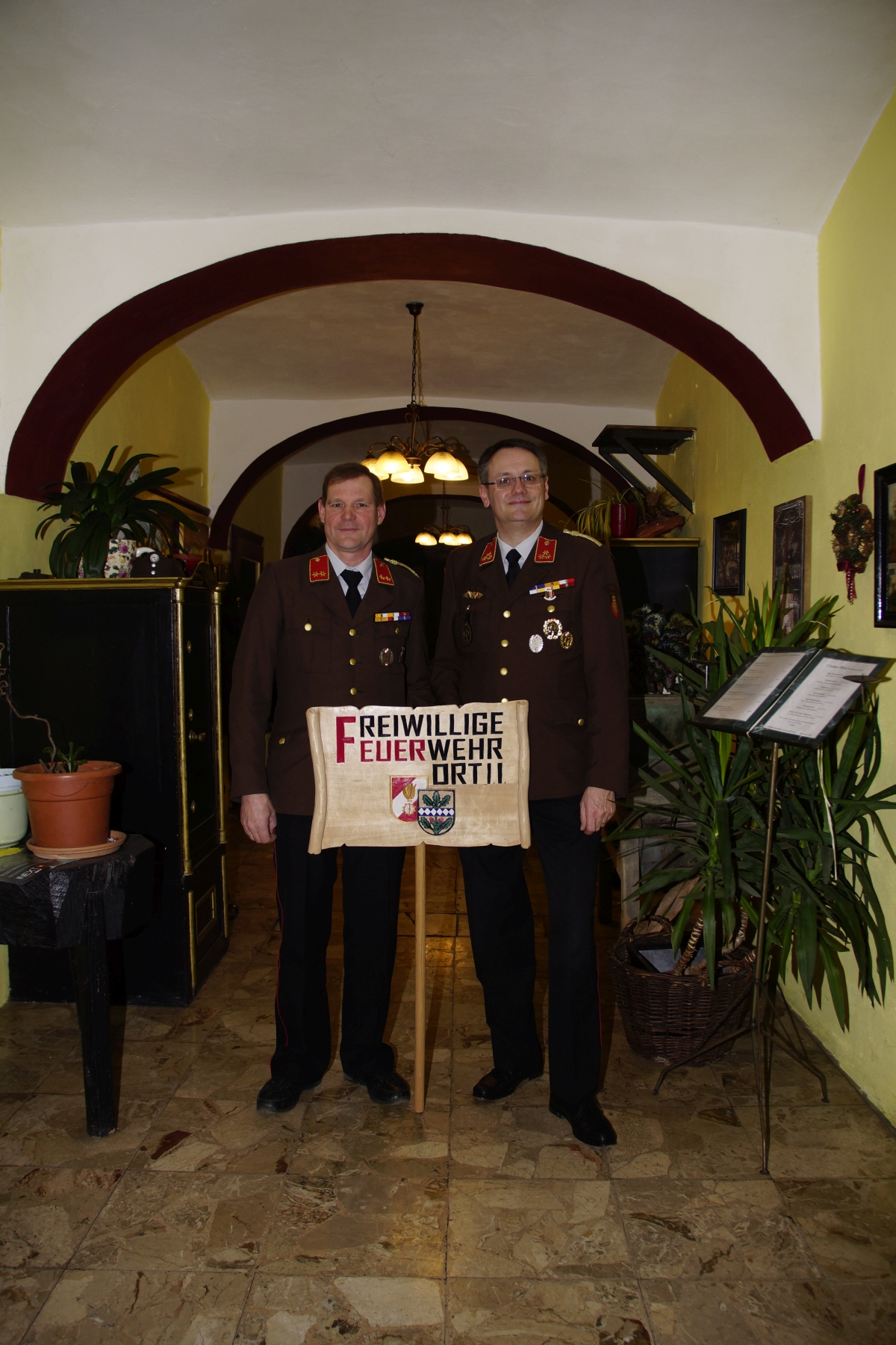Unser Kommandant-Stellvertreter Manfred Kinzlbauer sorgte bei der Versammlung für eine Überraschung und überreichte dem Kommandanten eine neue selbst angefertigte Holztafel mit dem Orter Feuerwehrlogo, welche bei festlichen Ausrückungen voran getragen wird.