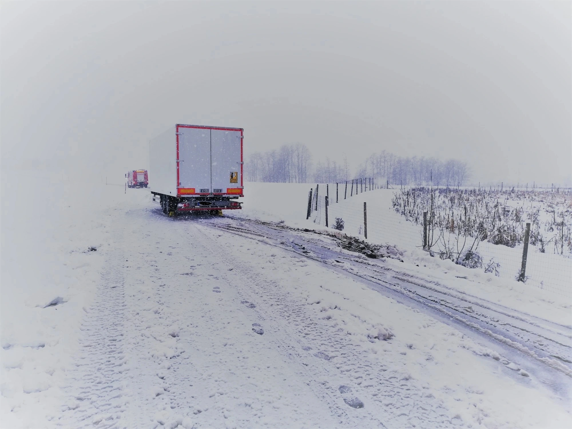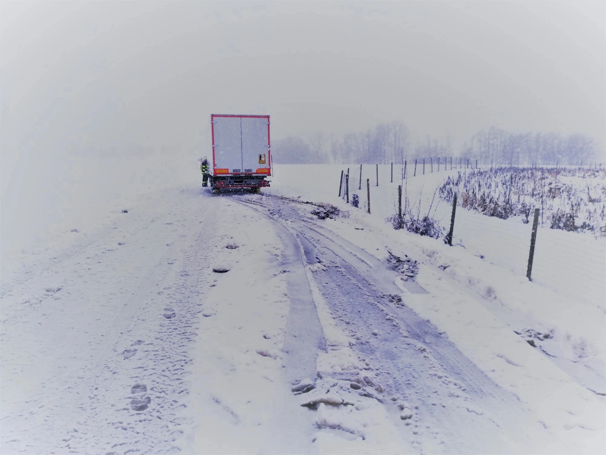 In Höhe Bachschaller Hügel blieb der Hängerzug aufgrund der winterlichen Fahrbahnverhältnisse und dem stetig ansteigenden Straßenverlauf stecken und drohte in den Straßengraben abzurutschen.