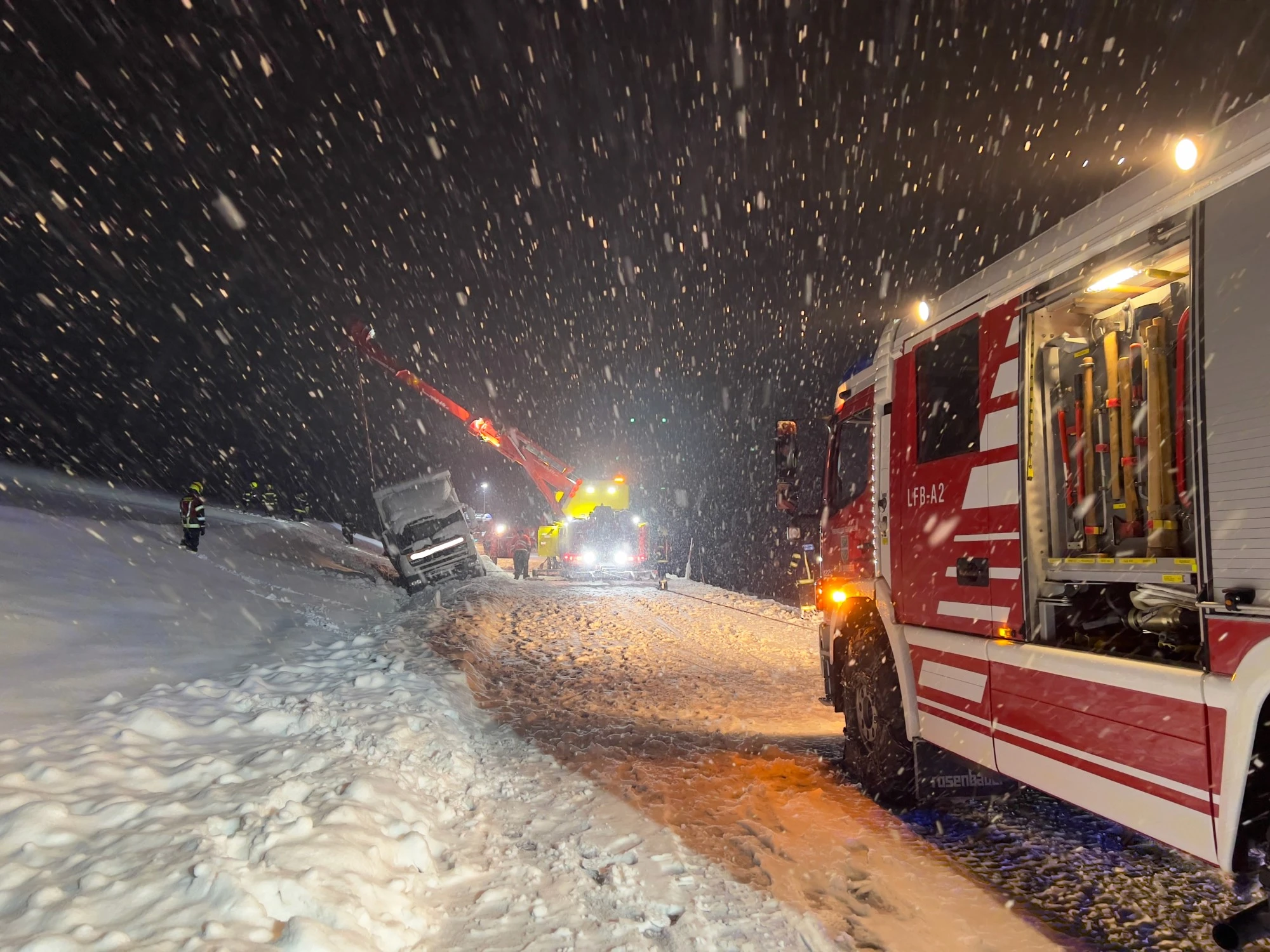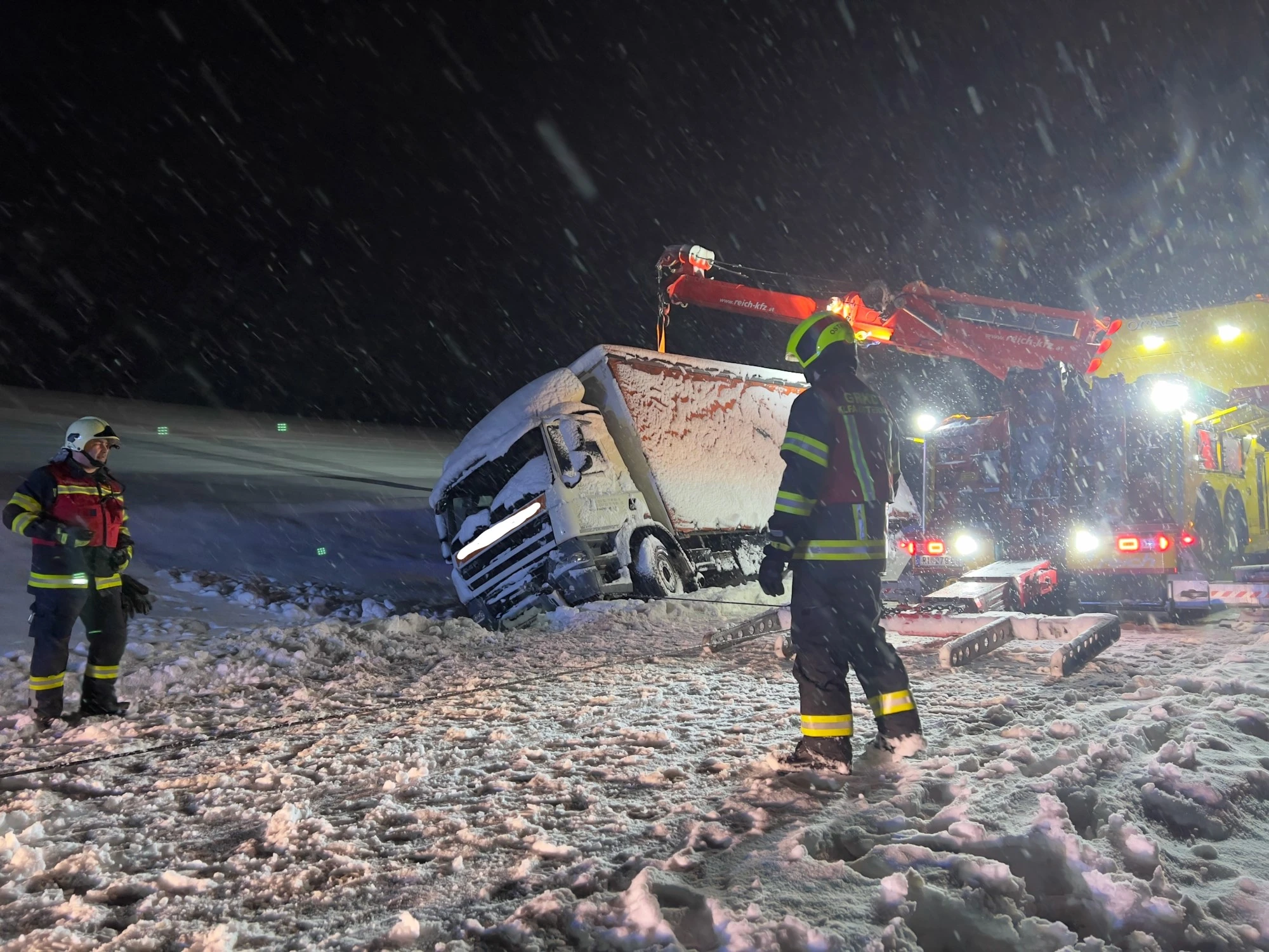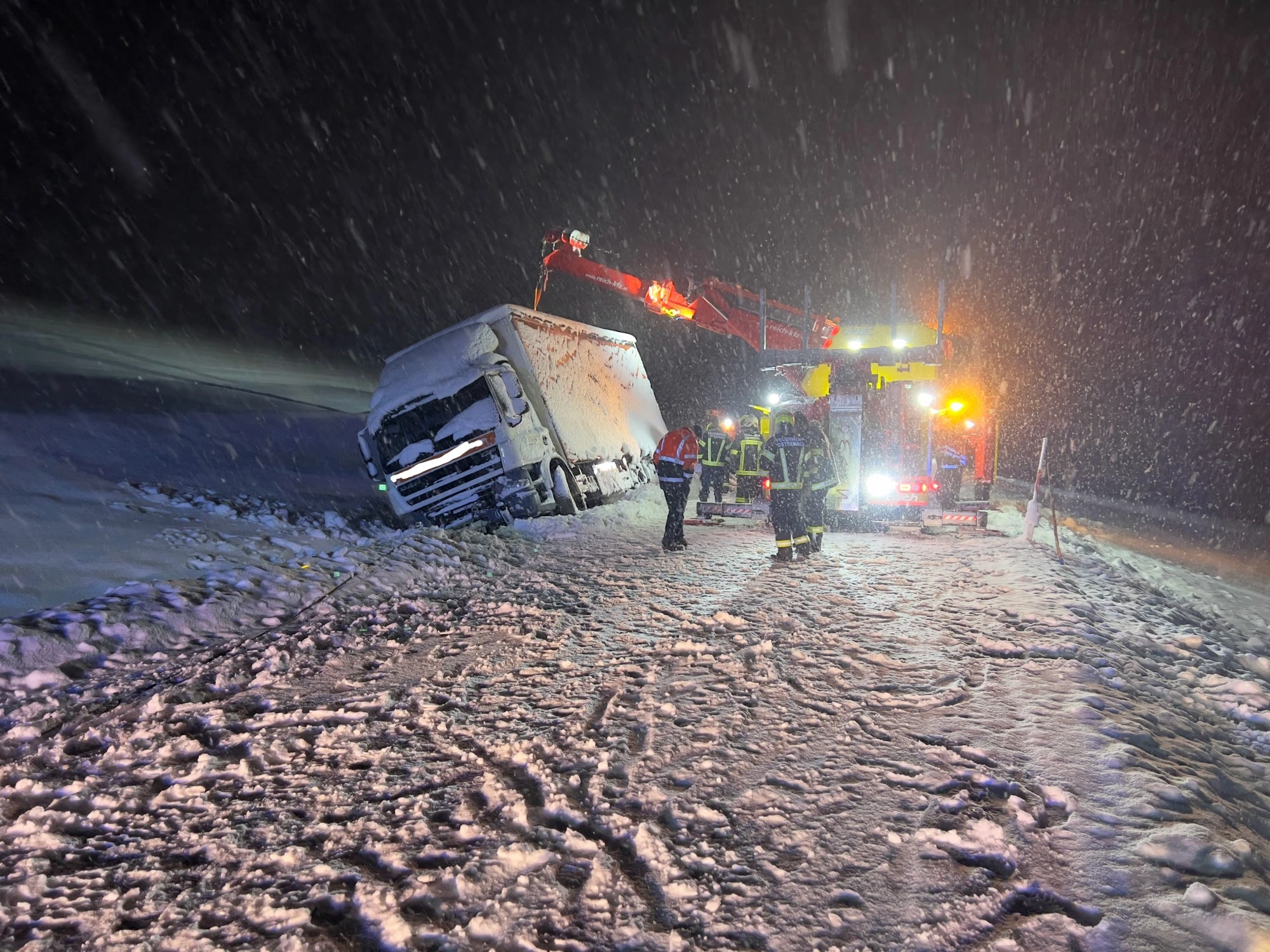 Nicht weit entfernt der Einsatzstelle vom Vormittag, kam am späten Nachmittag des 02.02.2023 ein Lastkraftwagen aufgrund der winterlichen Fahrbahnverhältnisse von der Fahrbahn ab und blieb auf Höhe Bachschaller Hügel im Straßengraben stecken.