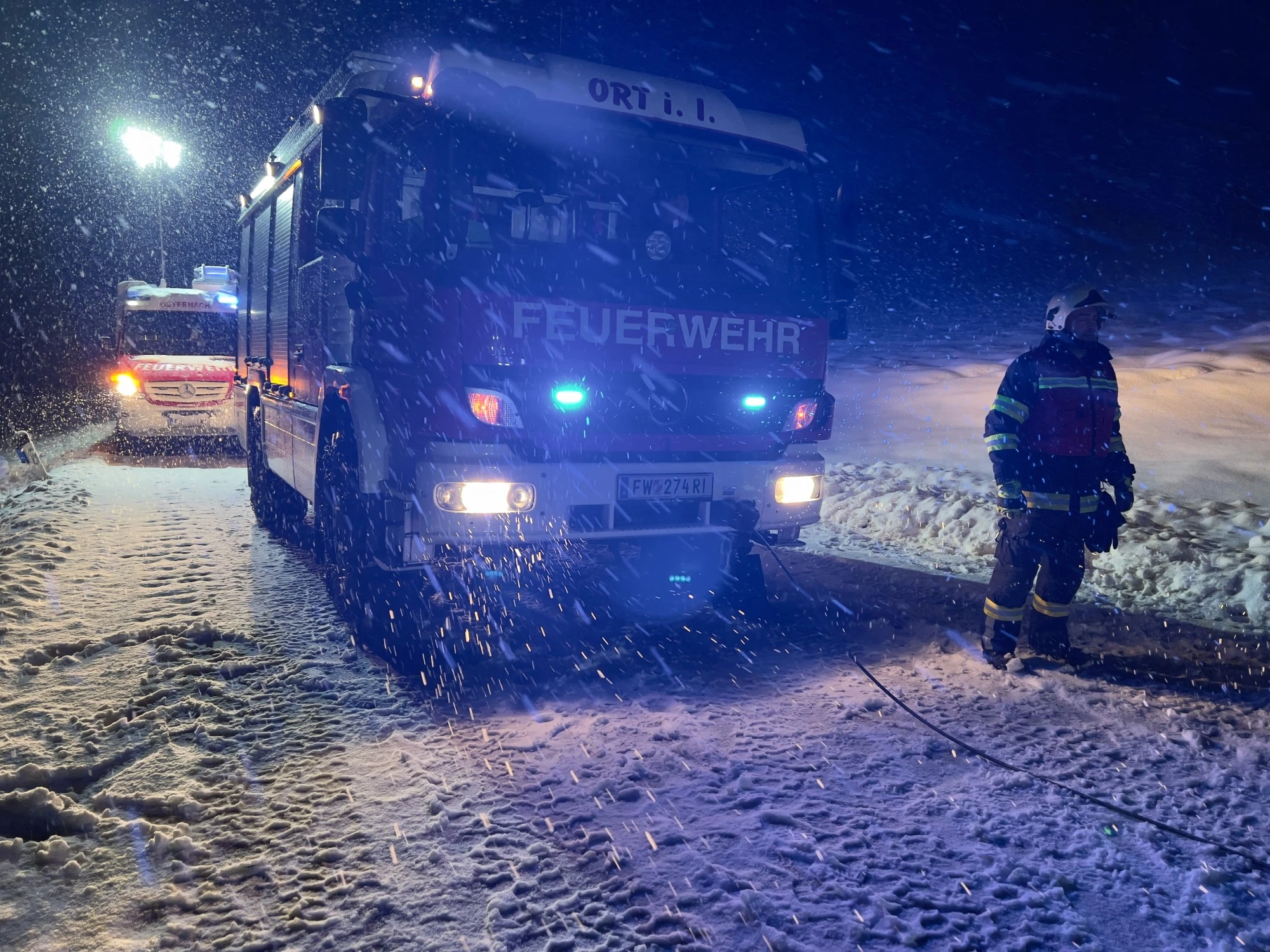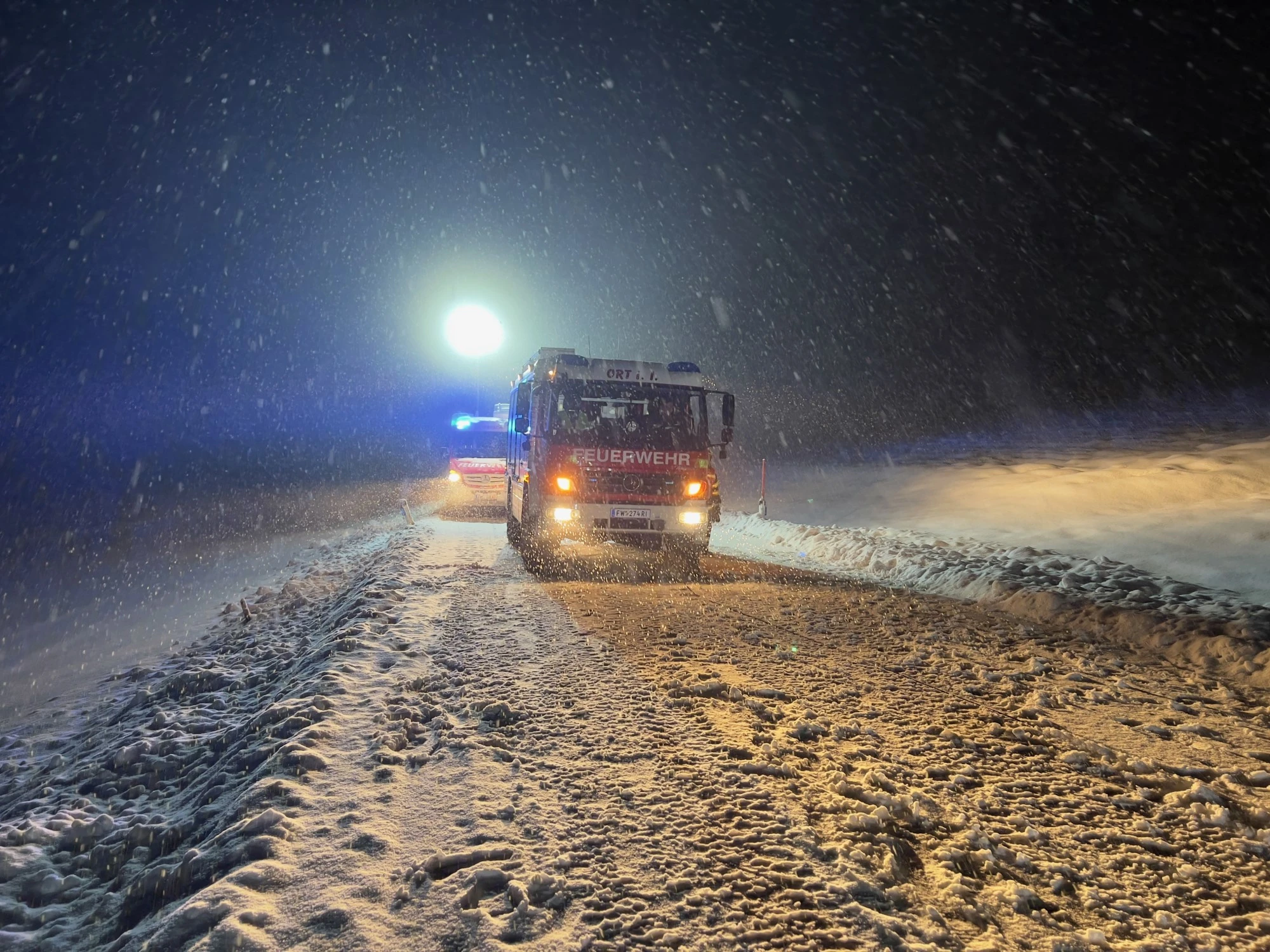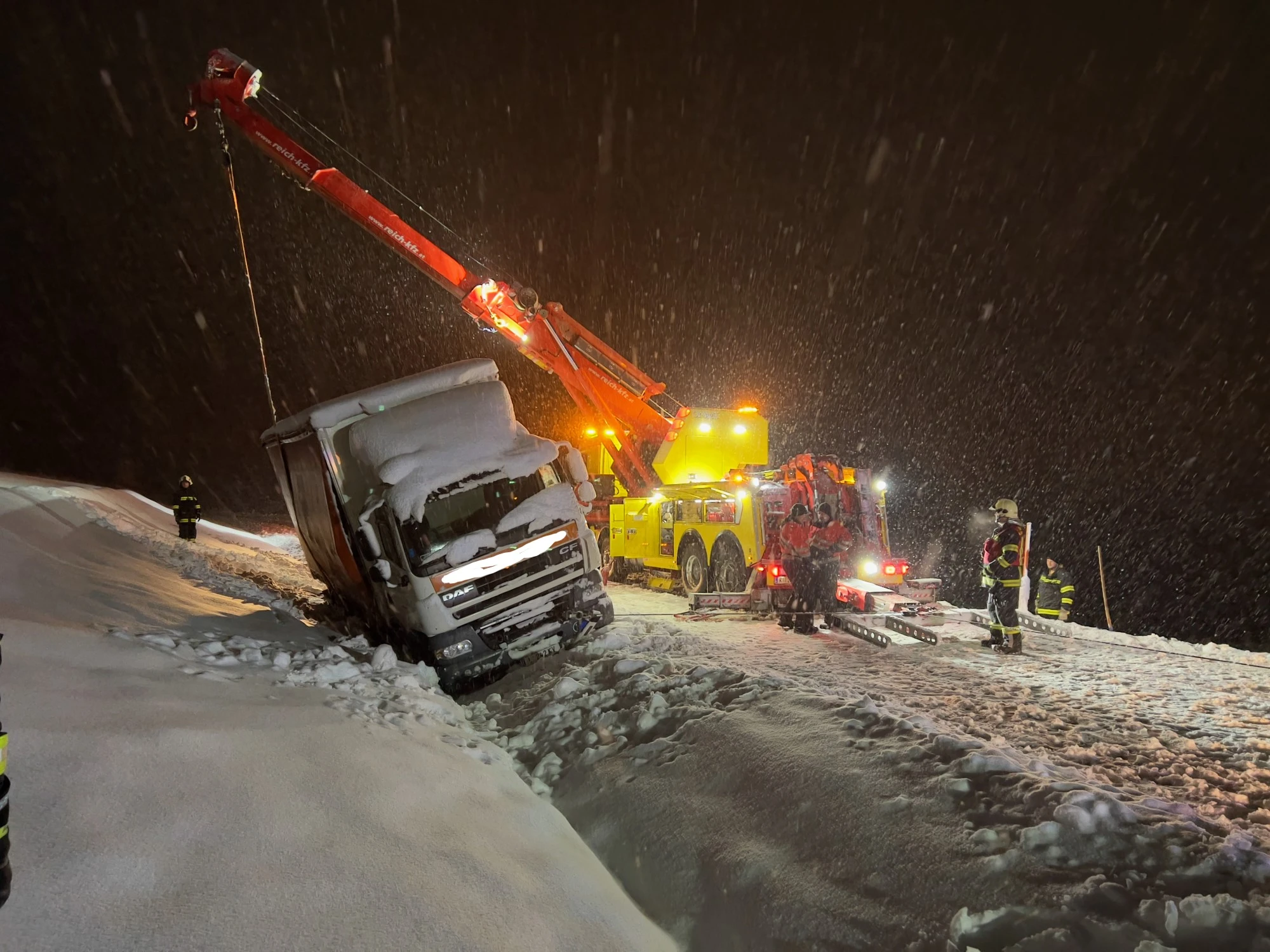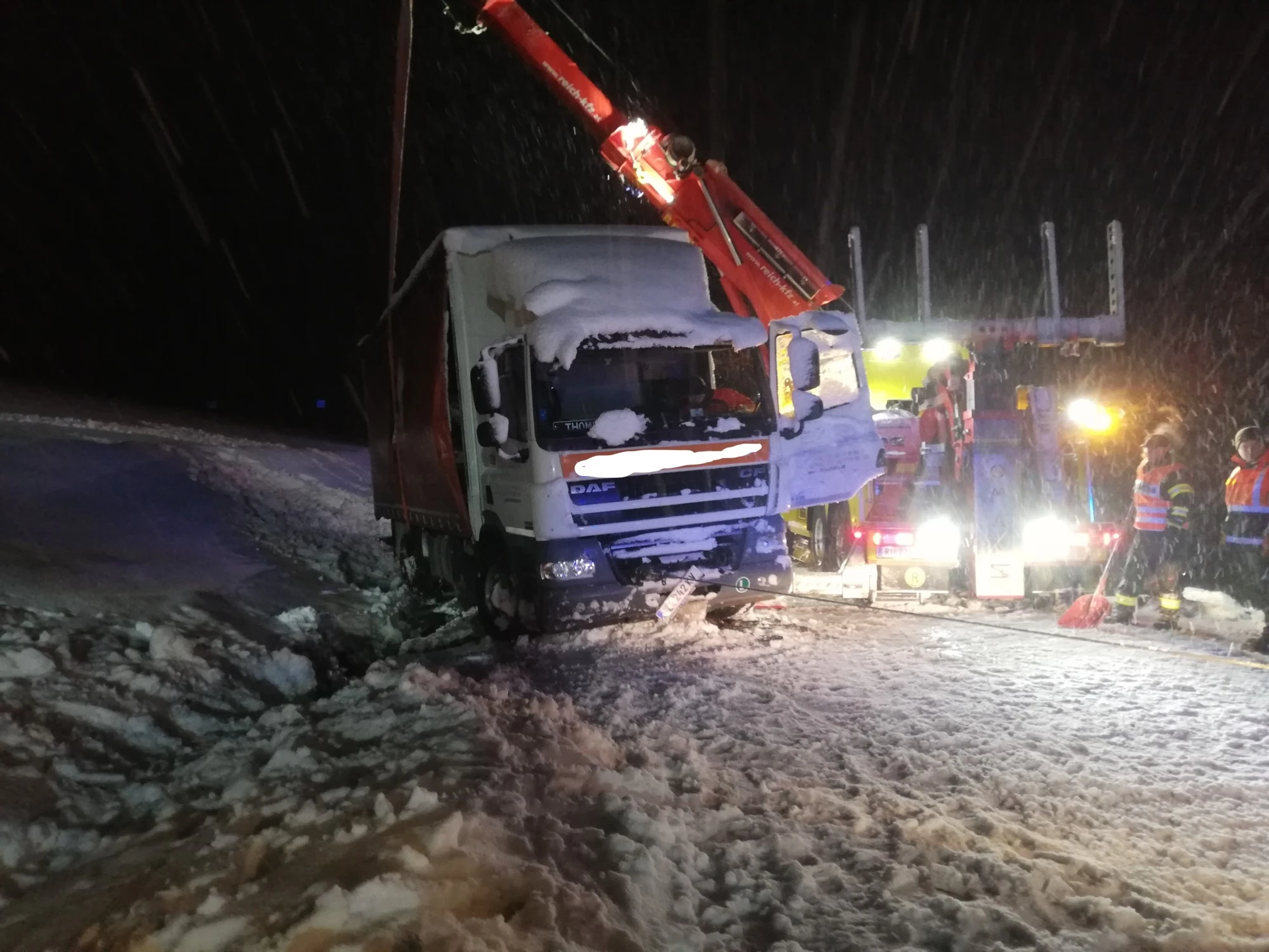 Nicht weit entfernt der Einsatzstelle vom Vormittag, kam am späten Nachmittag des 02.02.2023 ein Lastkraftwagen aufgrund der winterlichen Fahrbahnverhältnisse von der Fahrbahn ab und blieb auf Höhe Bachschaller Hügel im Straßengraben stecken.