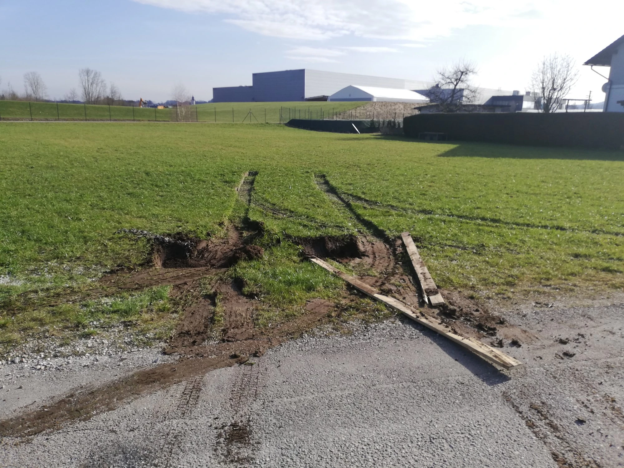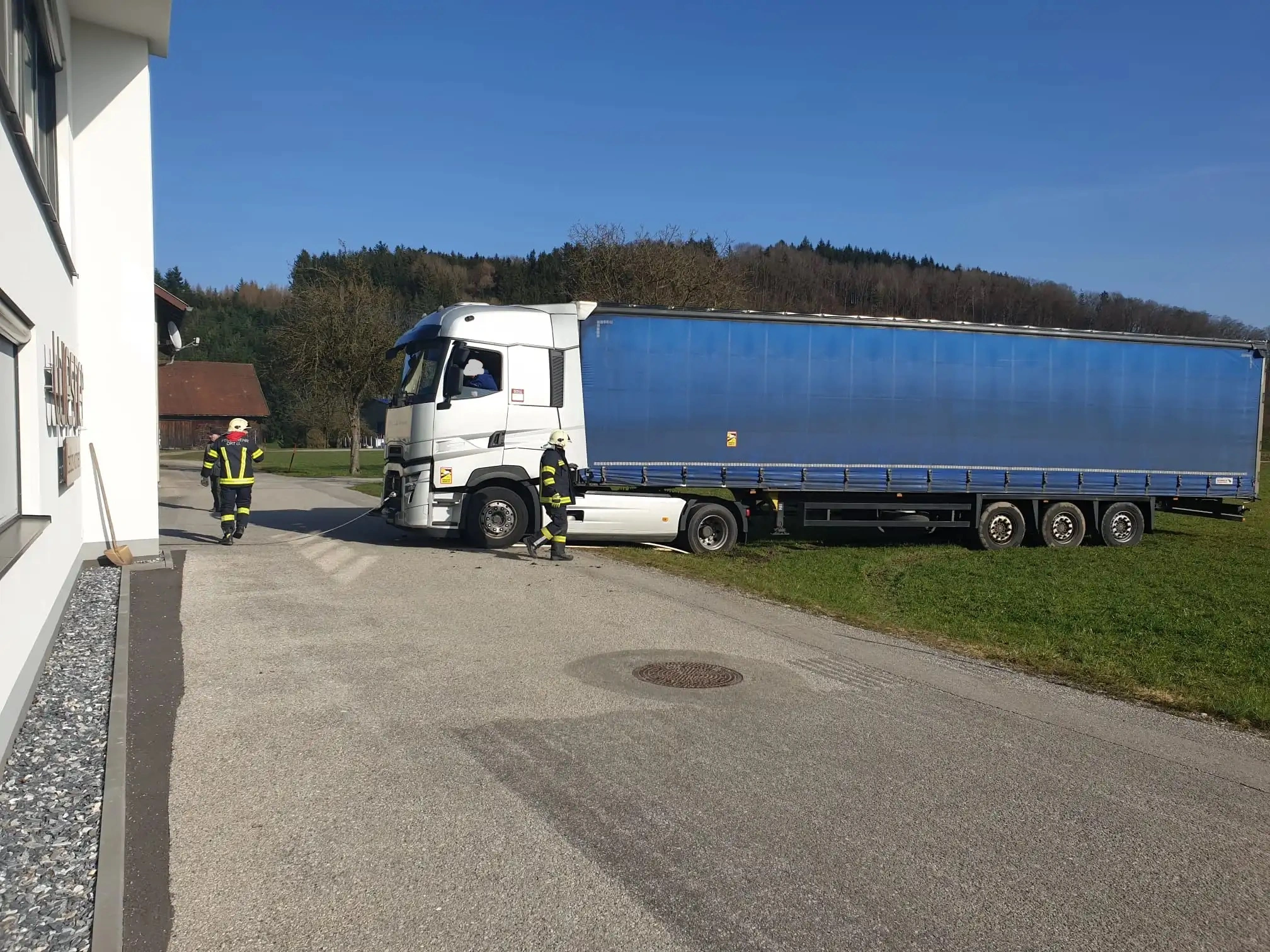 Ein ortsunkundiger LKW-Fahrer hatte sich mit seinem Sattelzug verfahren und blieb nach einem Wendemanöver in einer Wiese stecken.