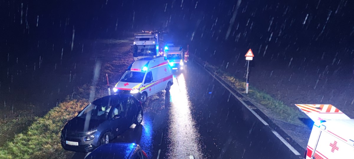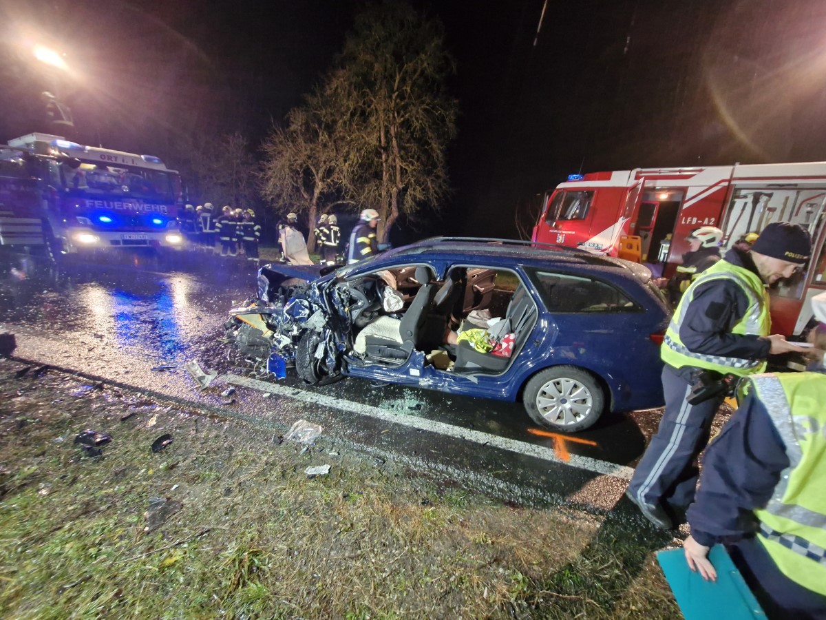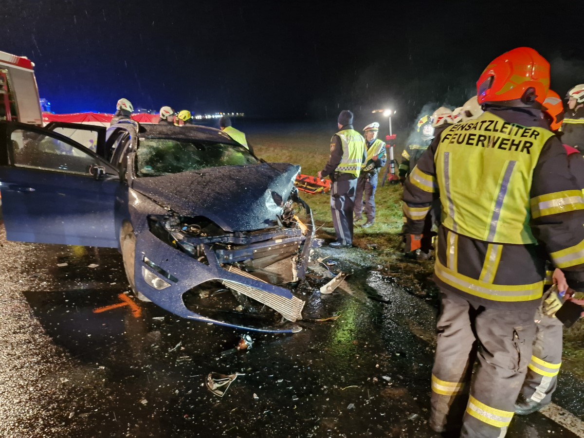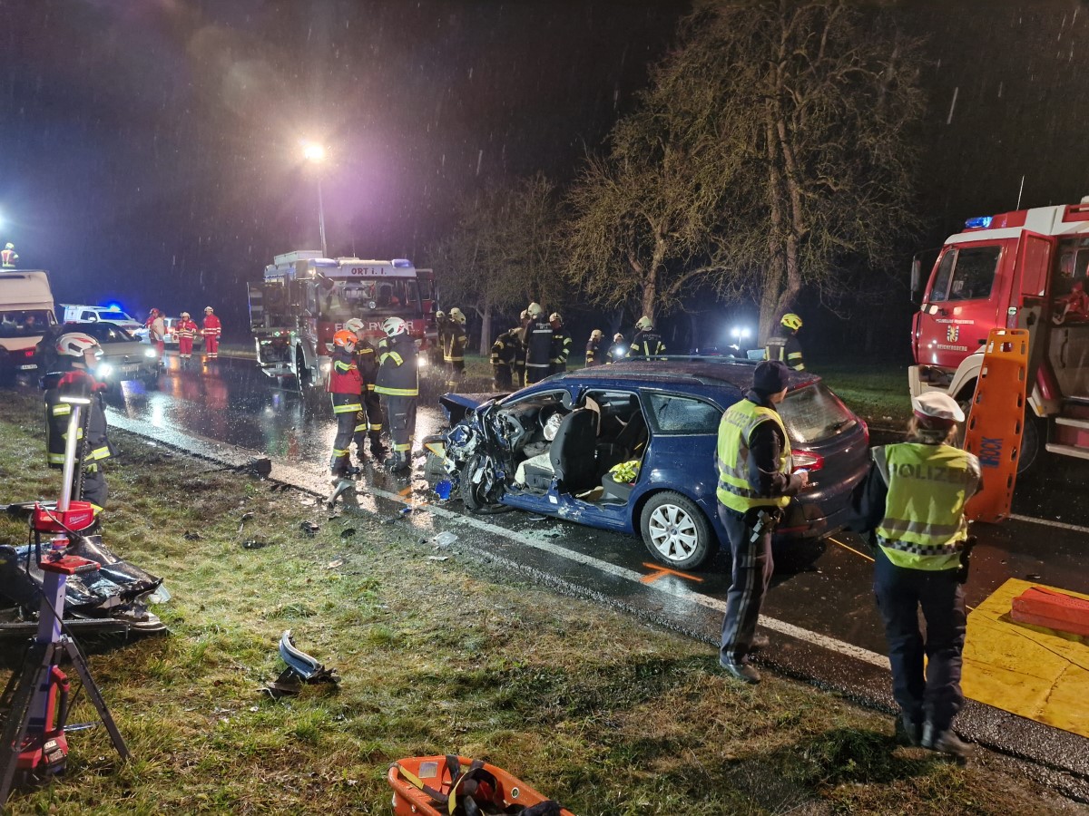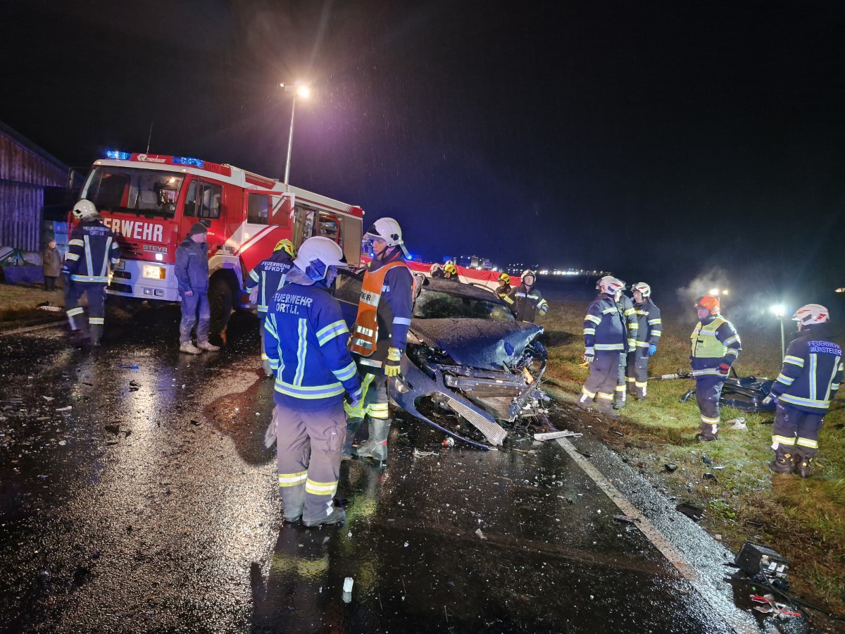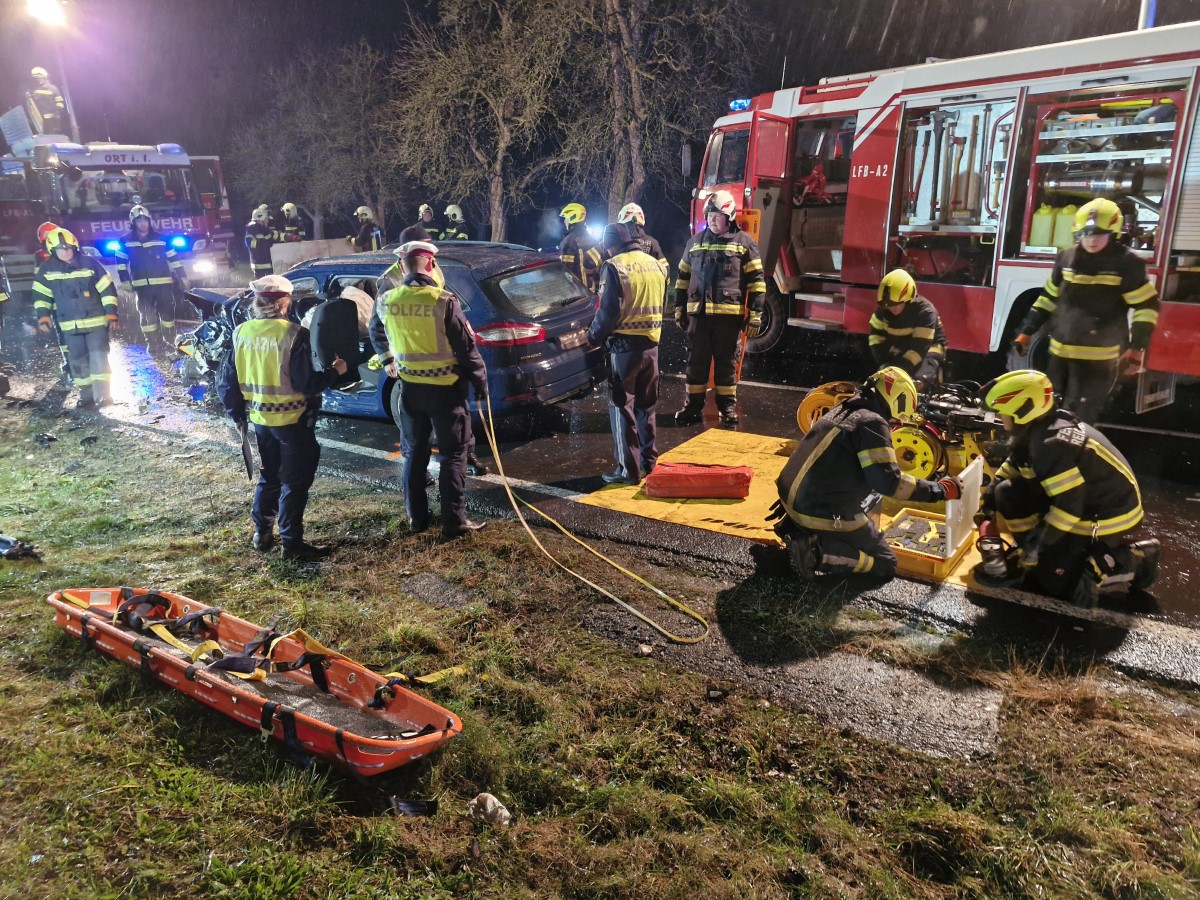 Auf regennasser Fahrbahn kollidierten zwei PKW frontal. Durch die Wucht des Aufpralls wurde ein Fahrzeug ins Bankett geschleudert, das andere kam mitten auf der Fahrbahn zum Stillstand. Beide Lenker wurden in ihren Fahrzeugen eingeklemmt und mussten von den Einsatzkräften mit hydraulischem Rettungsgerät befreit werden. Nach der Erstversorgung durch den Rettungsdienst wurden die Verletzten mit unbestimmtem Verletzungsgrad ins Krankenhaus eingeliefert.