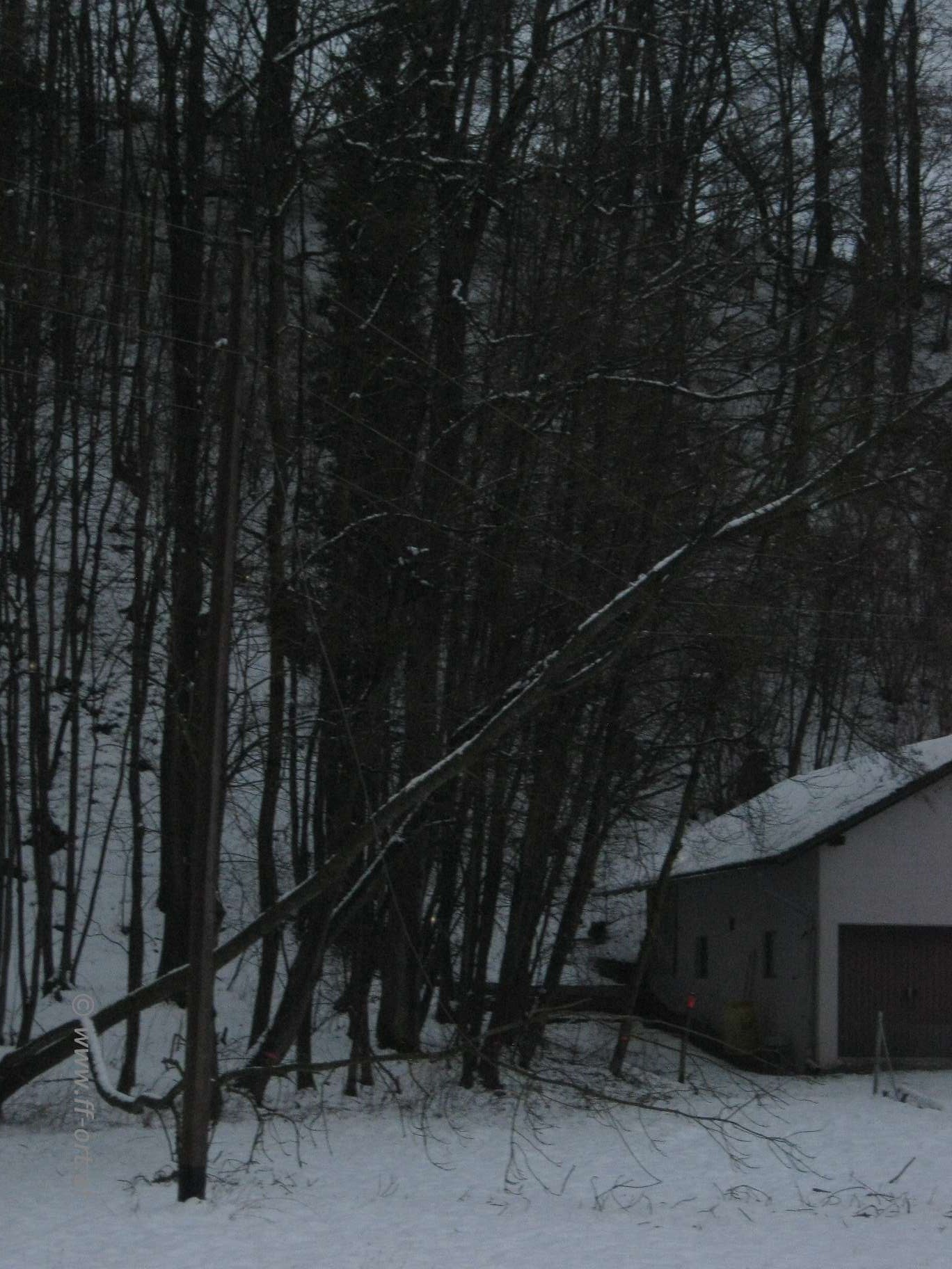 Wir rückten mit LFB und TLF zur Einsatzstelle aus und sicherten diese großräumig ab, denn bei der Lageerkundung wurde festgestellt das die Stromversorgung der betroffenen Freileitung immer noch aktiv war, obwohl eine Leitung gerissen war und mit dem Boden Kontakt hatte. Die ebenfalls alarmierte Energie AG traf rasch an der Einsatzstelle ein und nach abklären der Situation mit dem zuständigen Techniker konnten wir einrücken und die Einsatzbereitschaft herstellen.