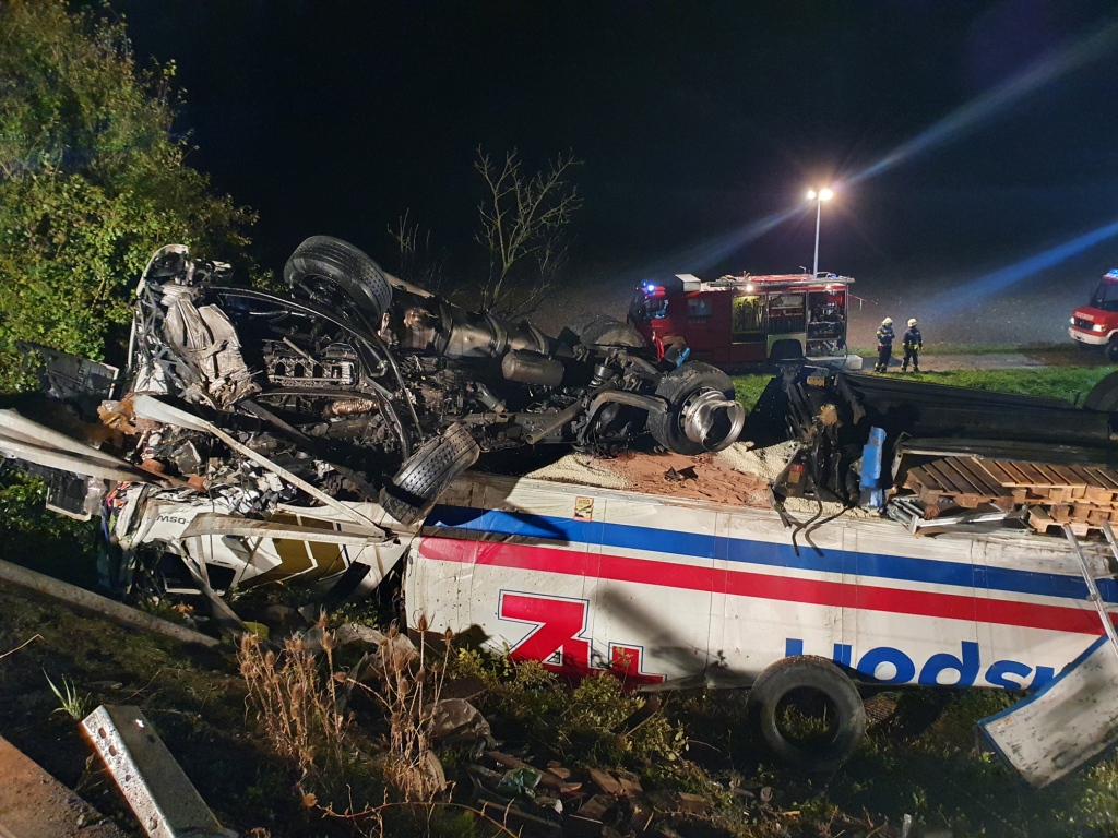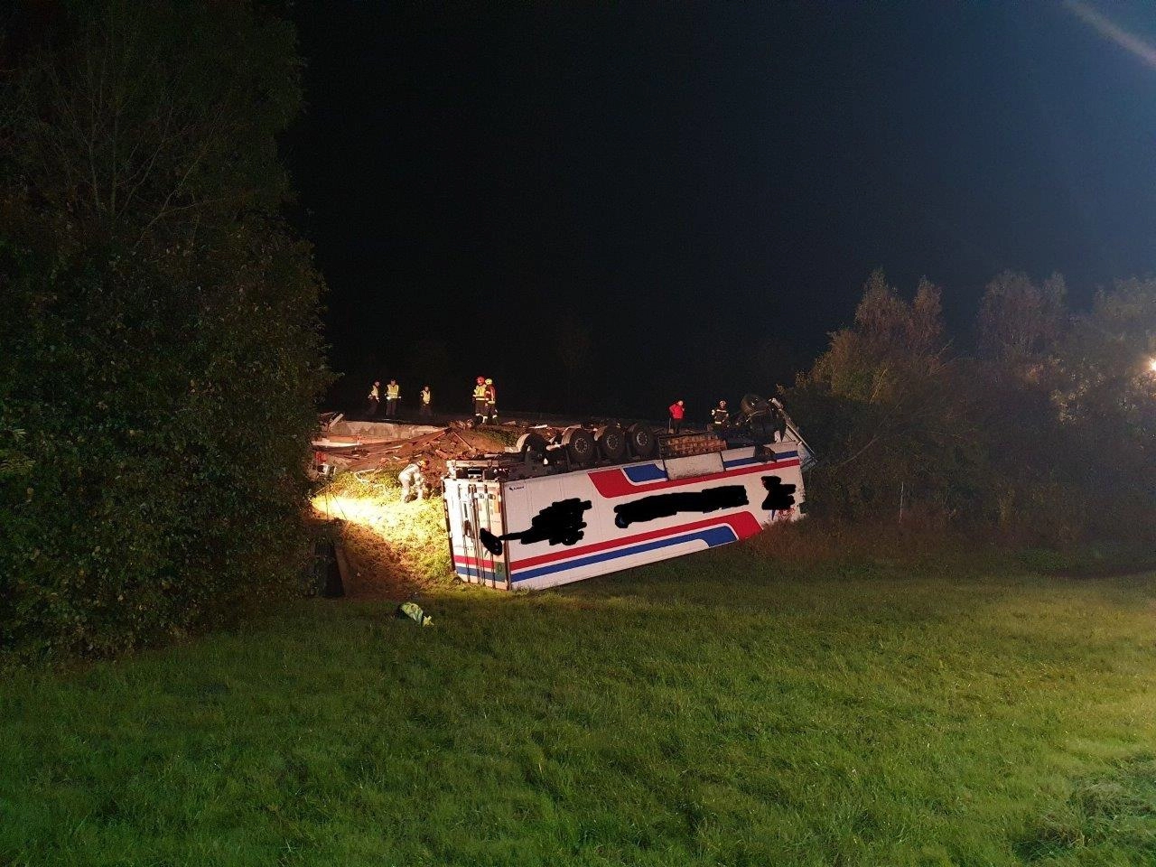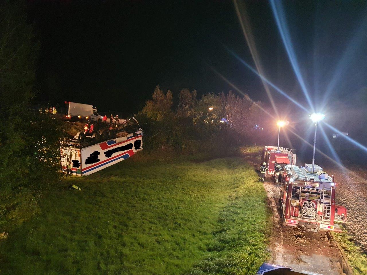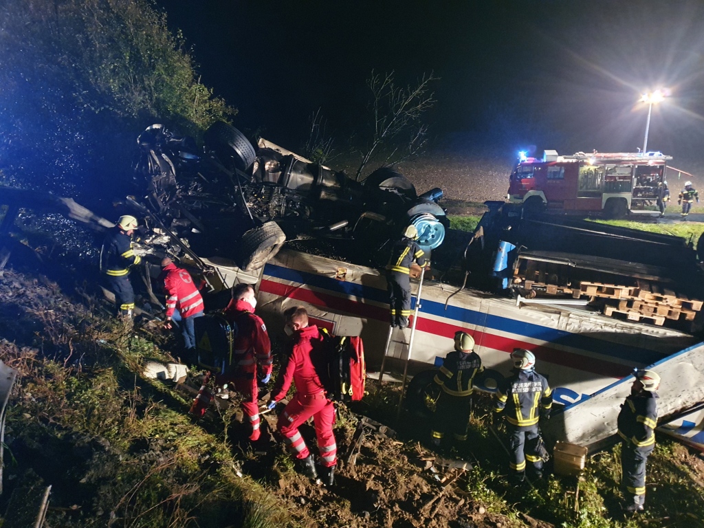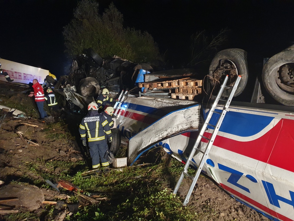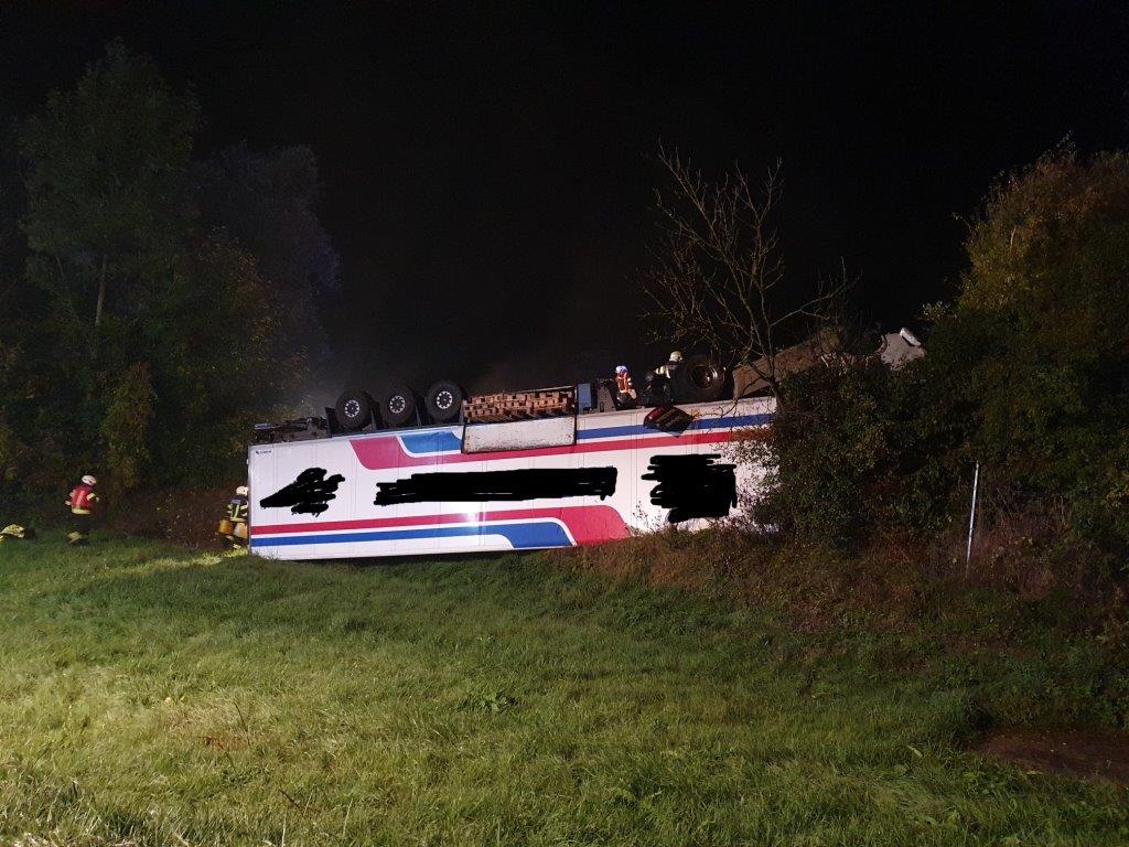 Das Sattelkraftfahrzeug überschlug sich und kam auf dem Dach liegend zum Stillstand. Beide Fahrzeuginsassen konnten sich glücklicherweise unverletzt befreien, weshalb während der Anfahrt bereits per Funkspruch bezüglich eingeklemmter Person(en) Entwarnung gegeben wurde und sich somit die Einsatzlage entsprechend auf Bergung des verunfallten Fahrzeuges und Absicherung der Unfallstelle änderte.