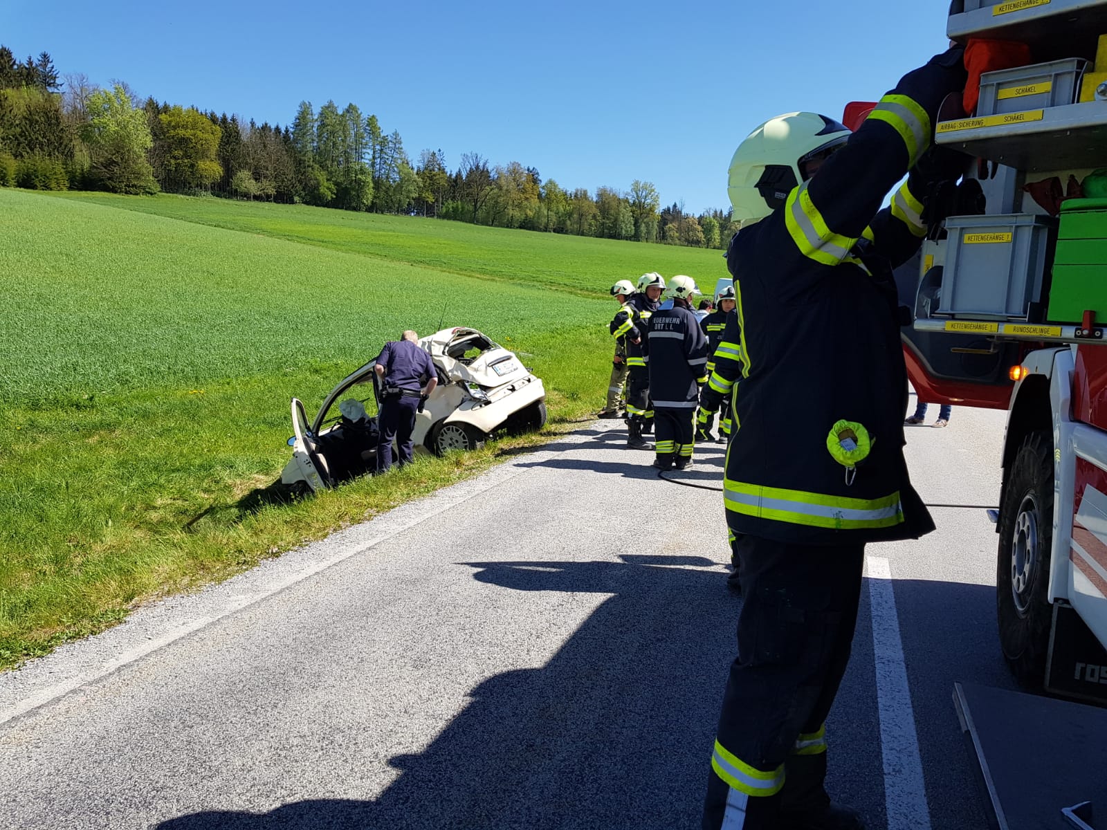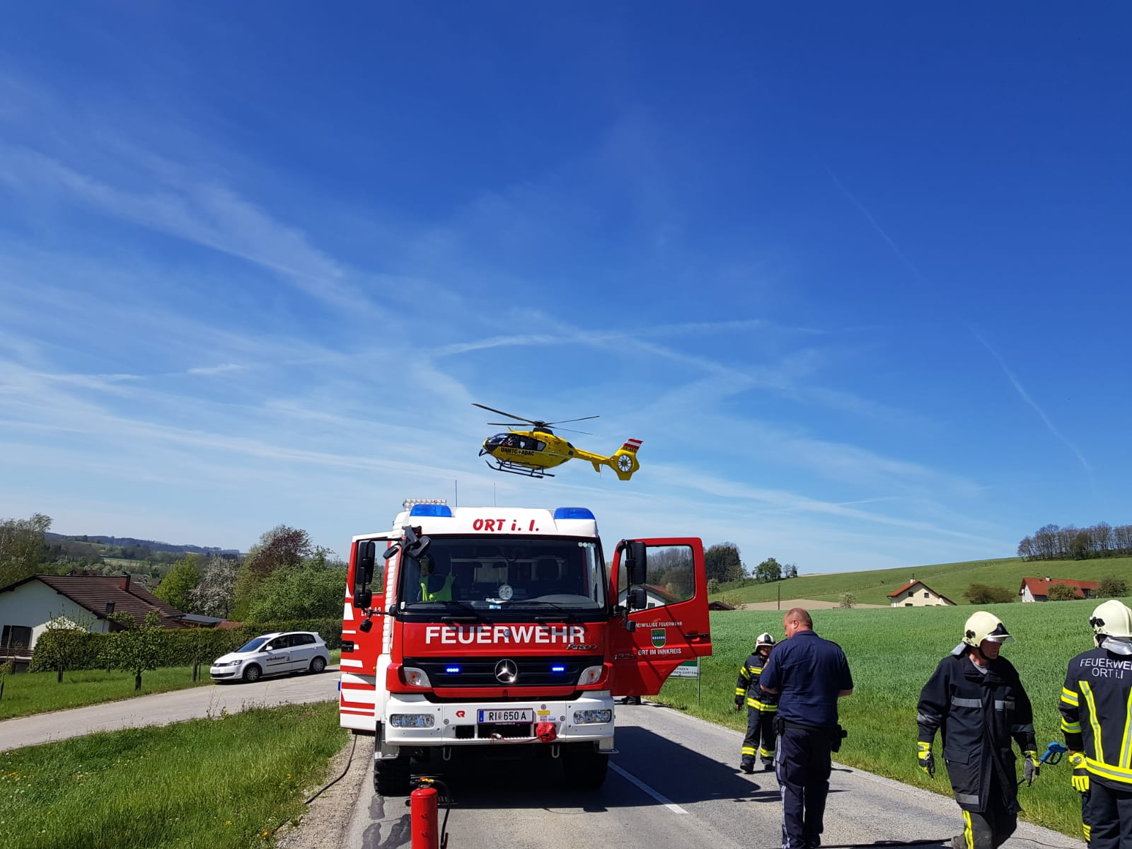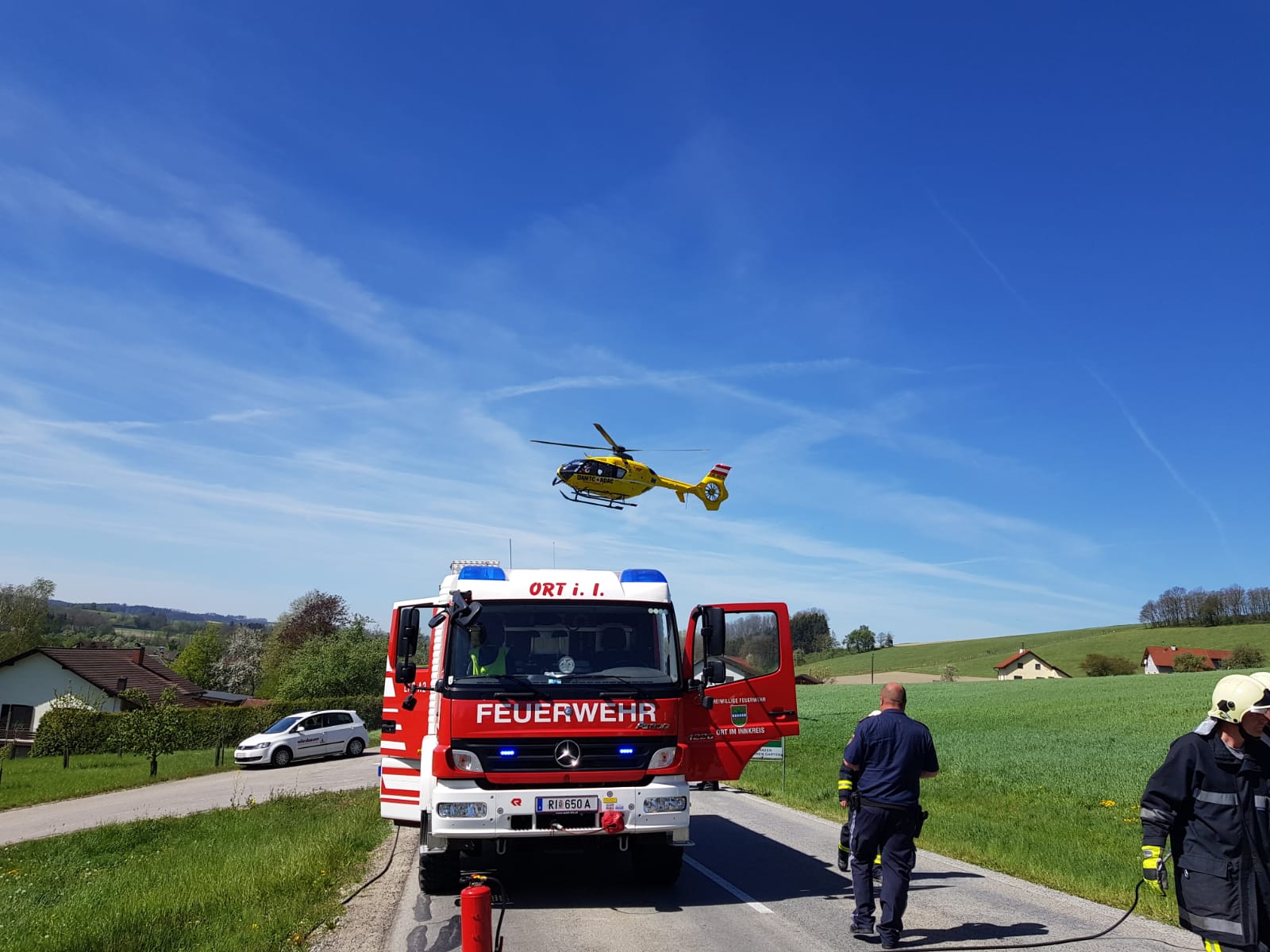Beim Eintreffen an der Einsatzstelle wurde die verletzte Person bereits durch die Besatzung des Rettungshubschrauber Europa 3 versorgt. Die Person konnte das Fahrzeug unter Hilfe selbst verlassen. Nachdem die Vollsperre der L1112 wieder aufgehoben werden konnte war unser Einsatz beendet.