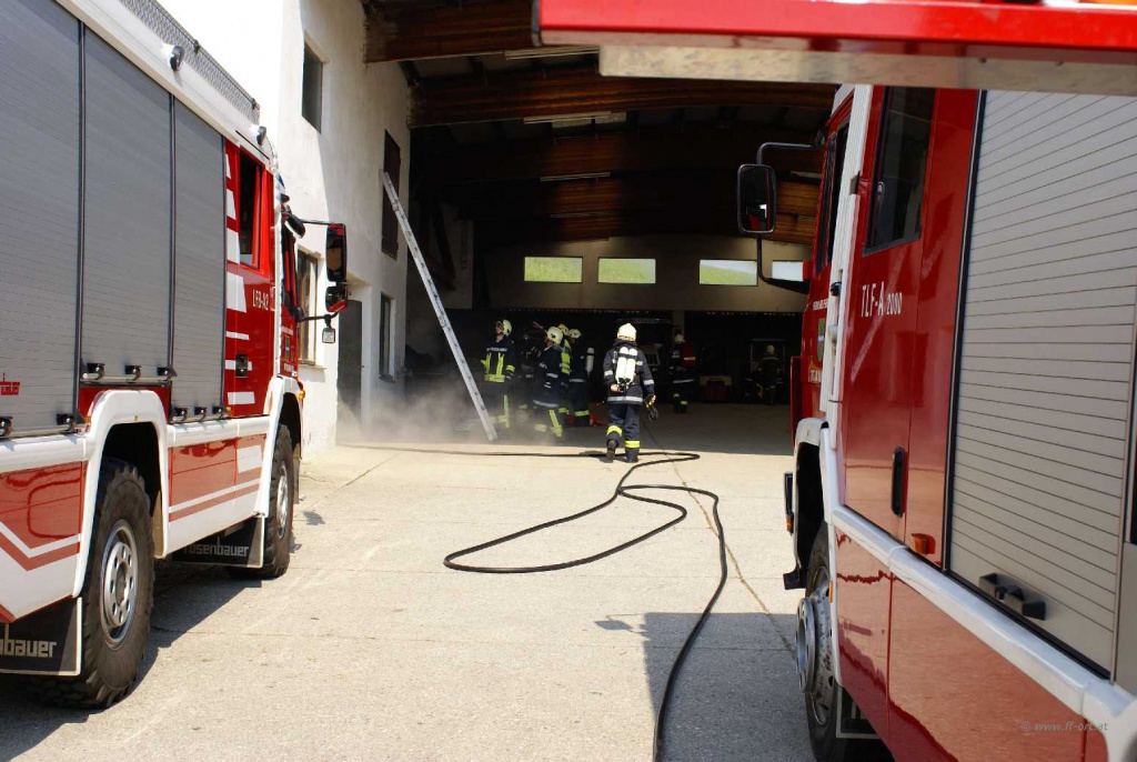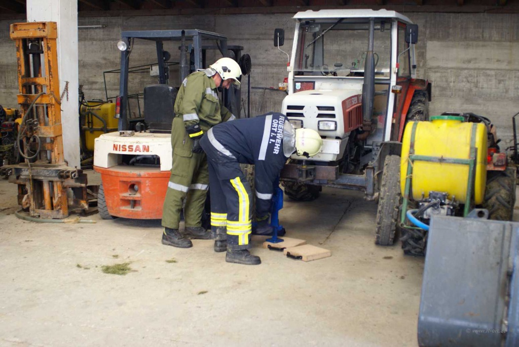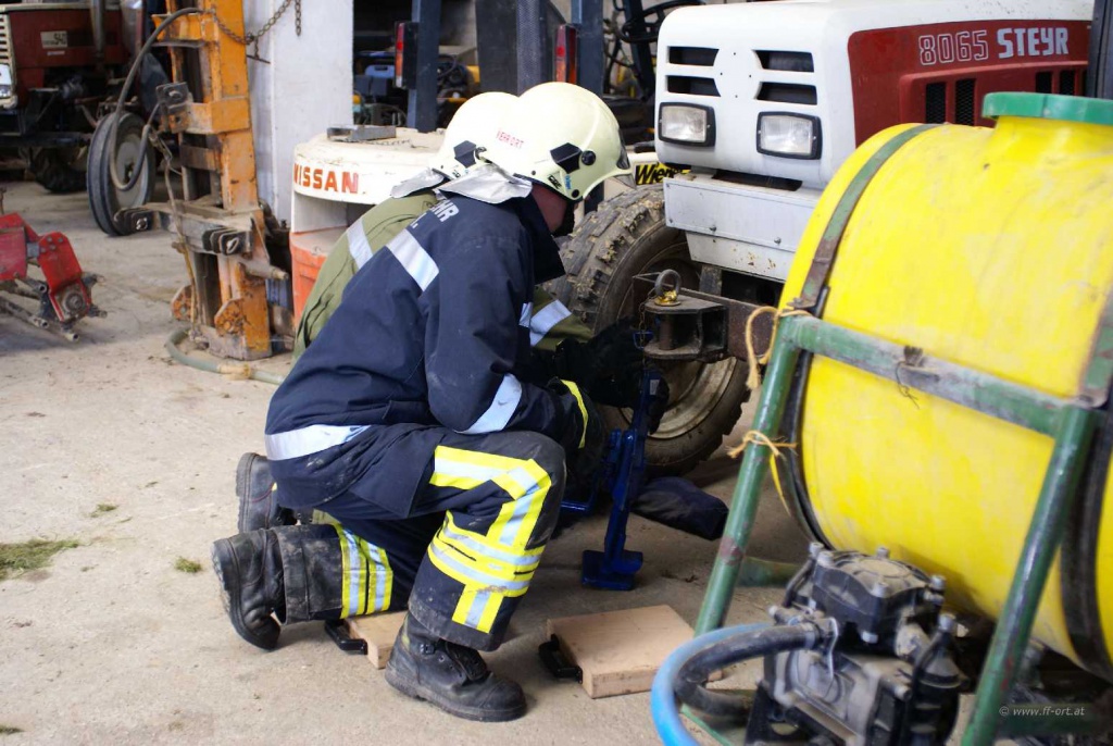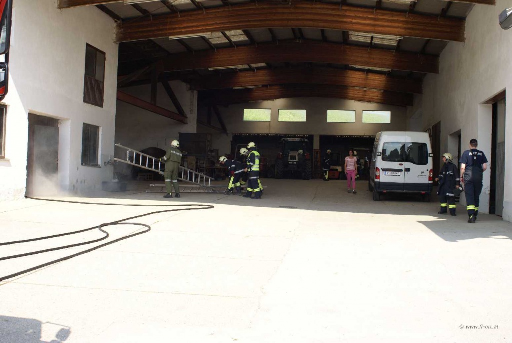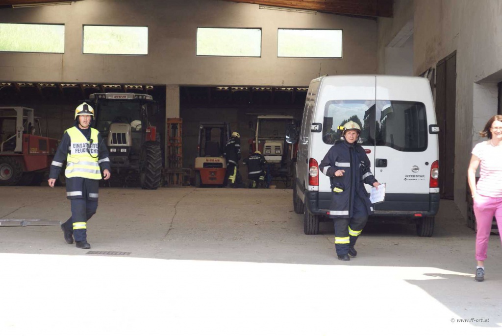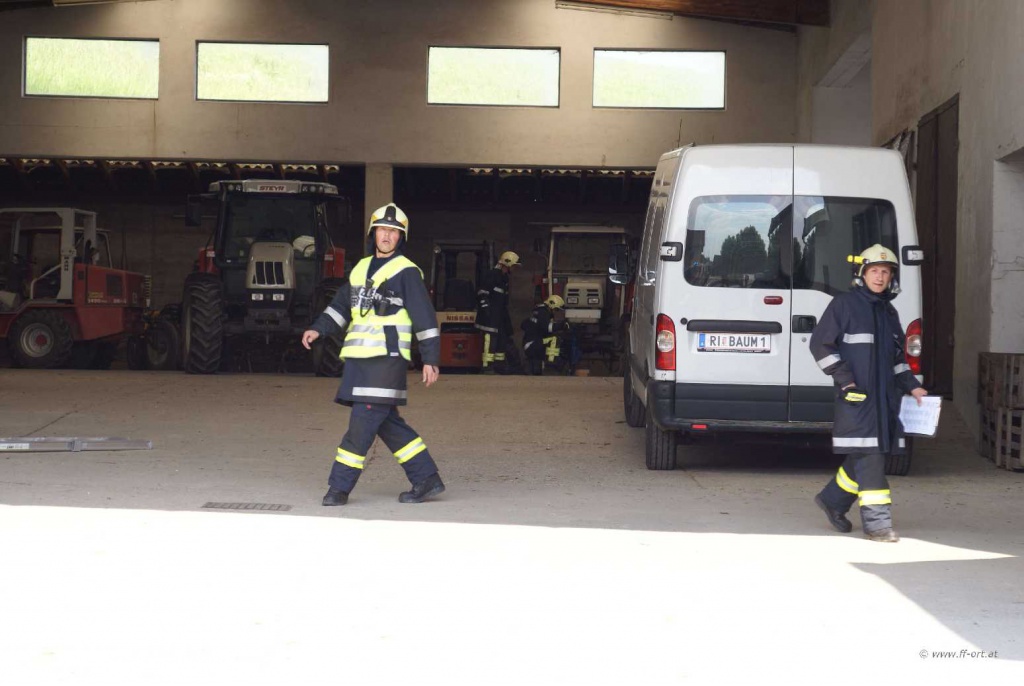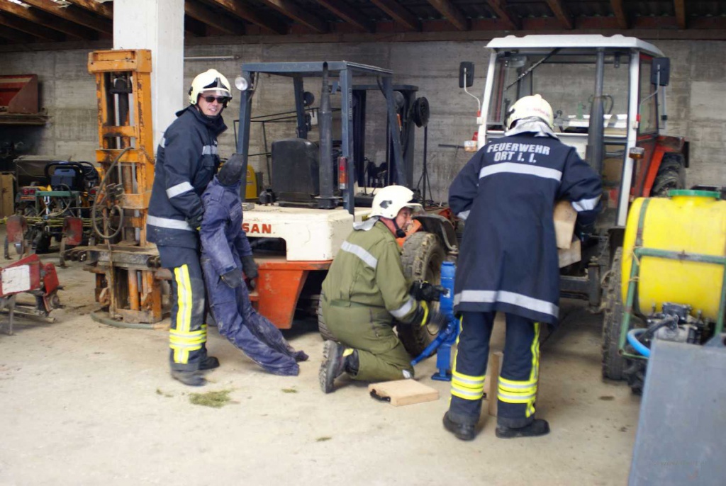 Übungsszenario war ein Brand im Heizraum bei Baumschule Gurtner in Osternach mit vermissten Personen, sowie eine eingeklemmte Person unter landwirtschaftlichen Gerät.