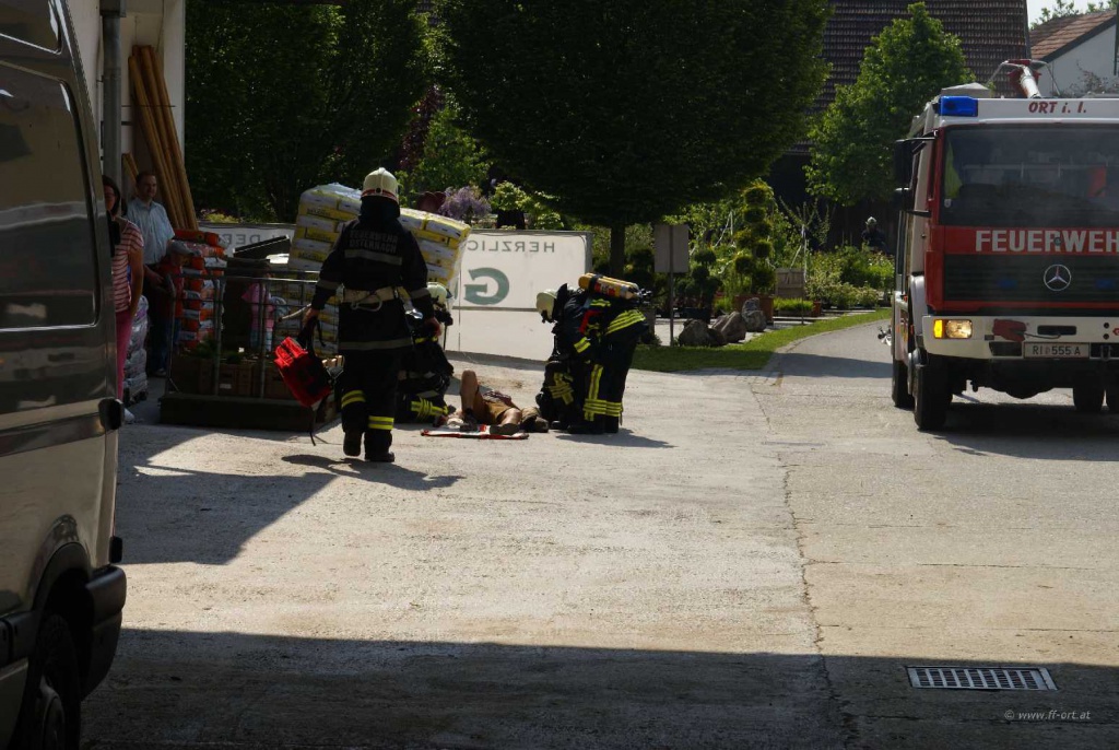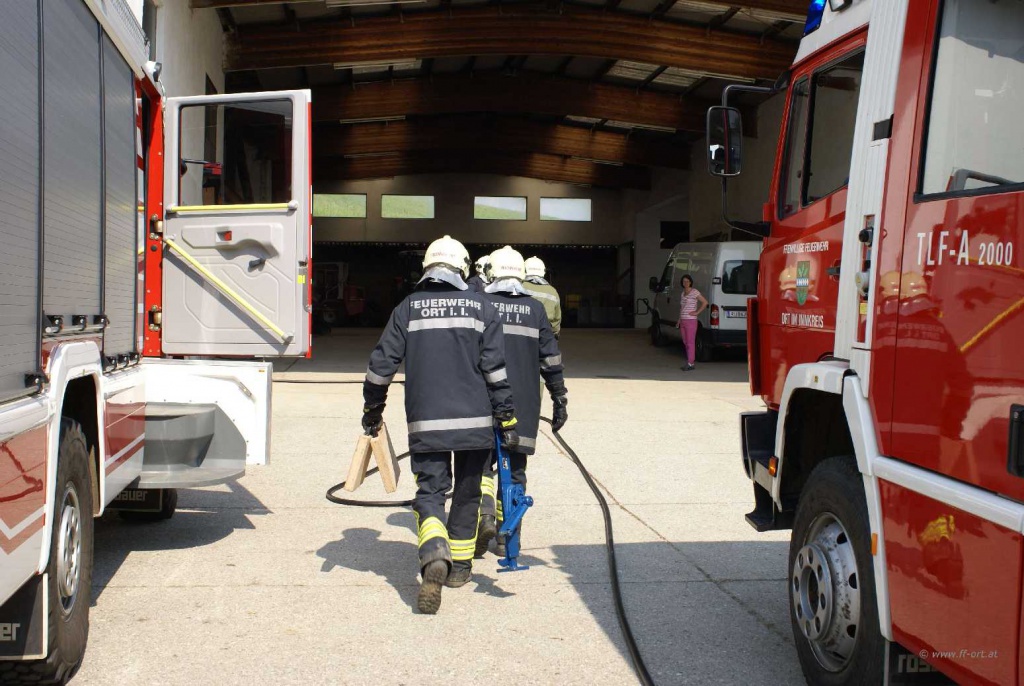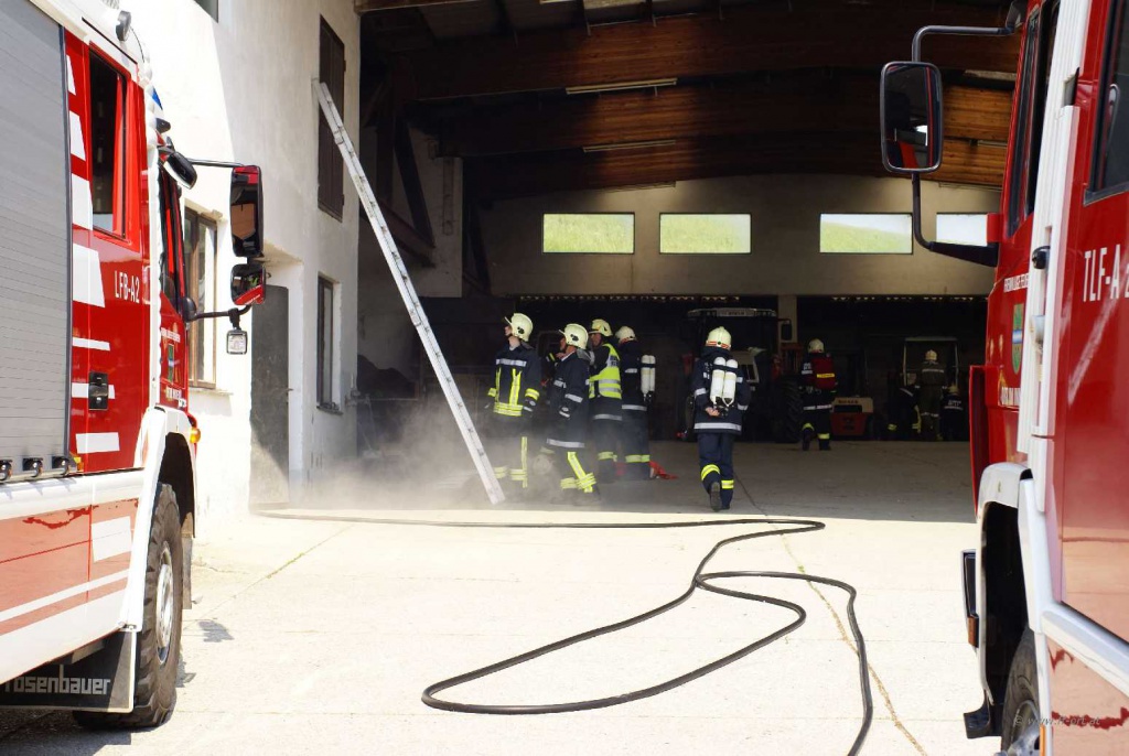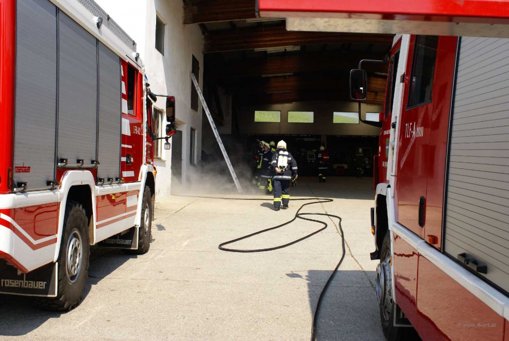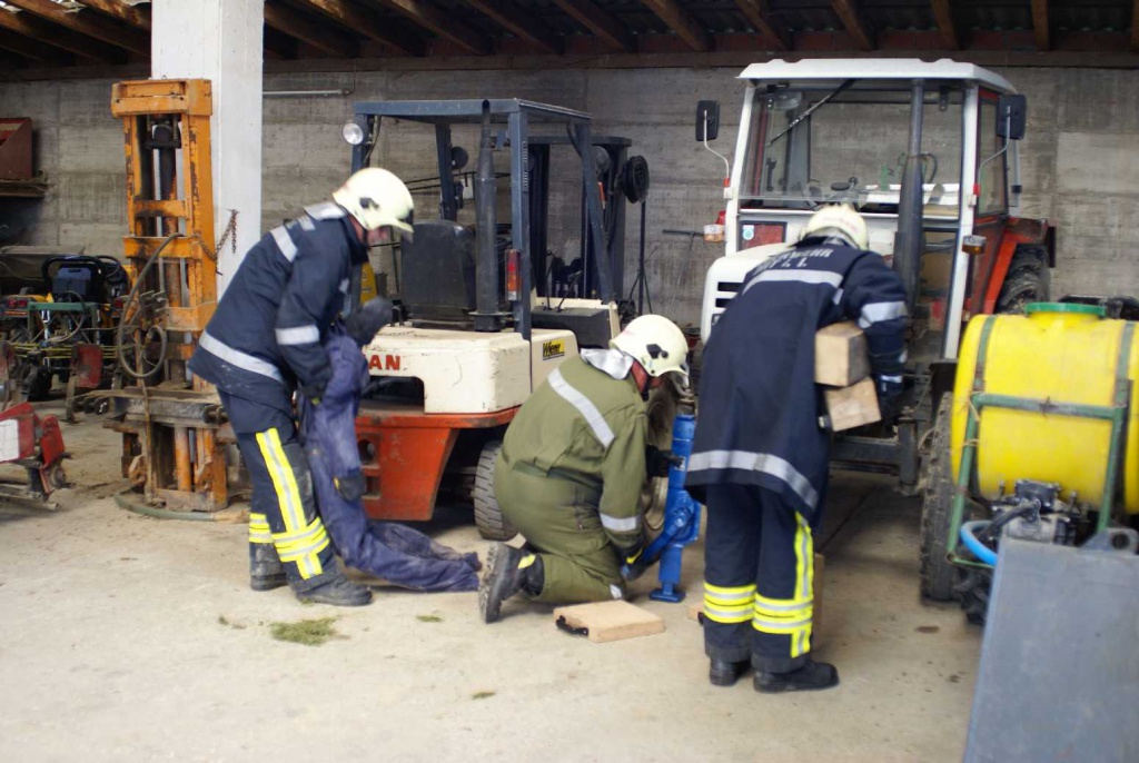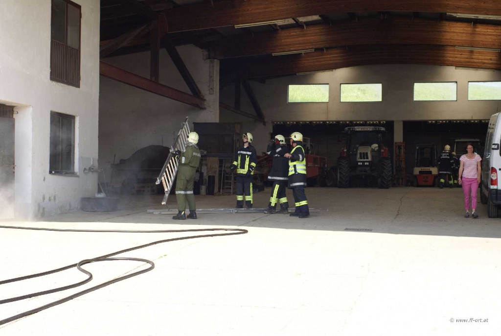 Übungsszenario war ein Brand im Heizraum bei Baumschule Gurtner in Osternach mit vermissten Personen, sowie eine eingeklemmte Person unter landwirtschaftlichen Gerät.