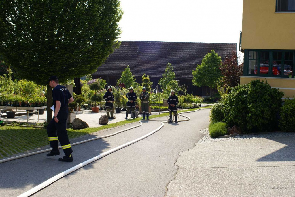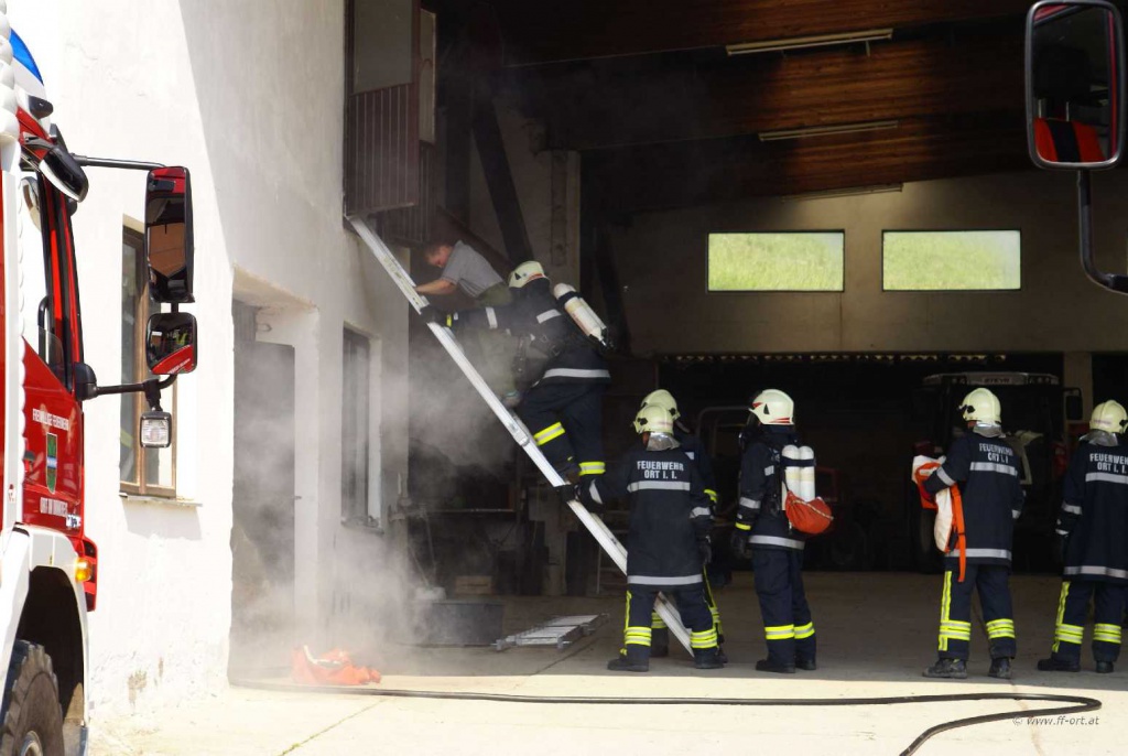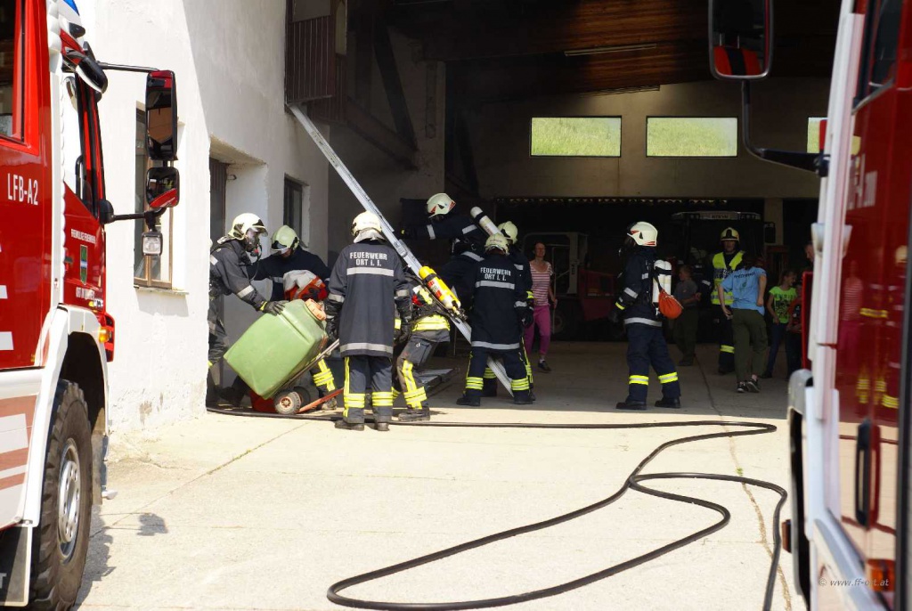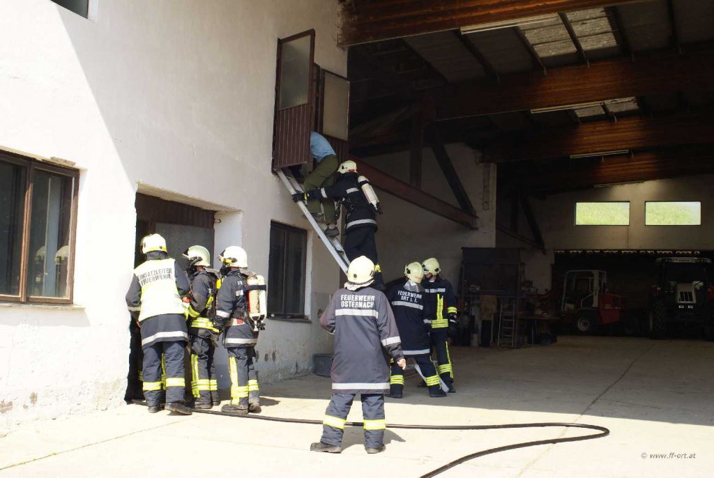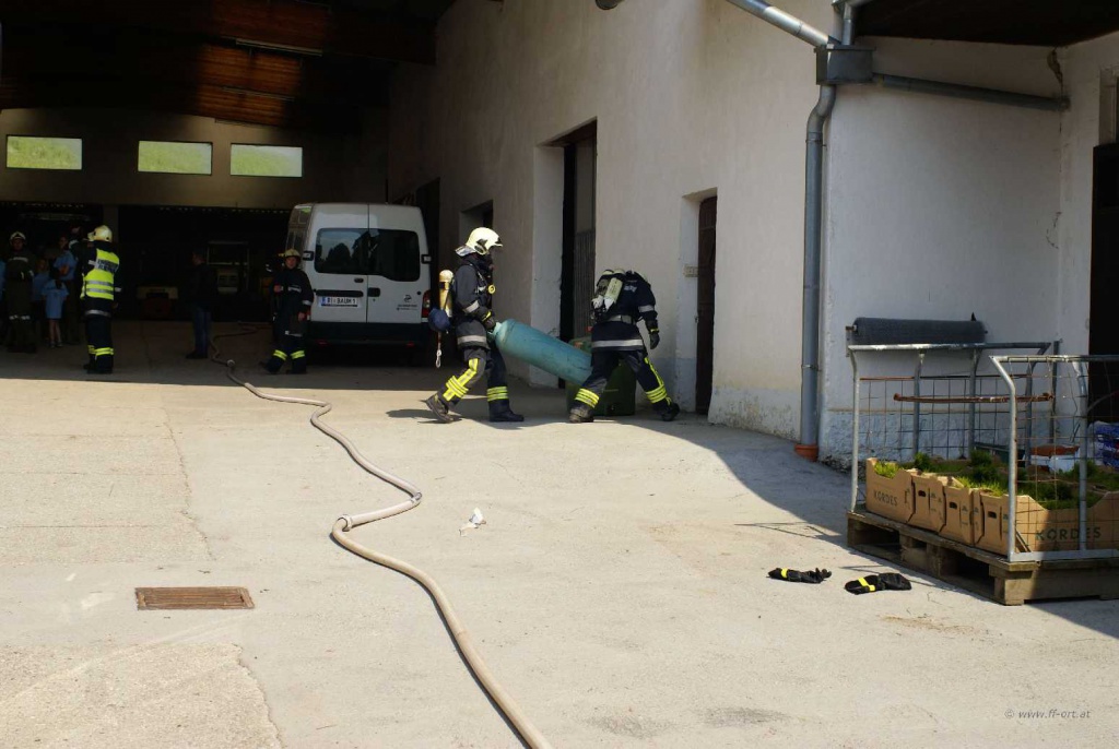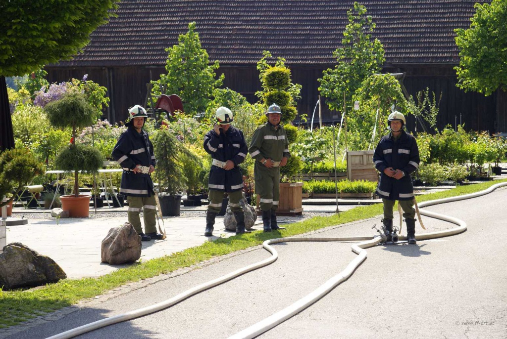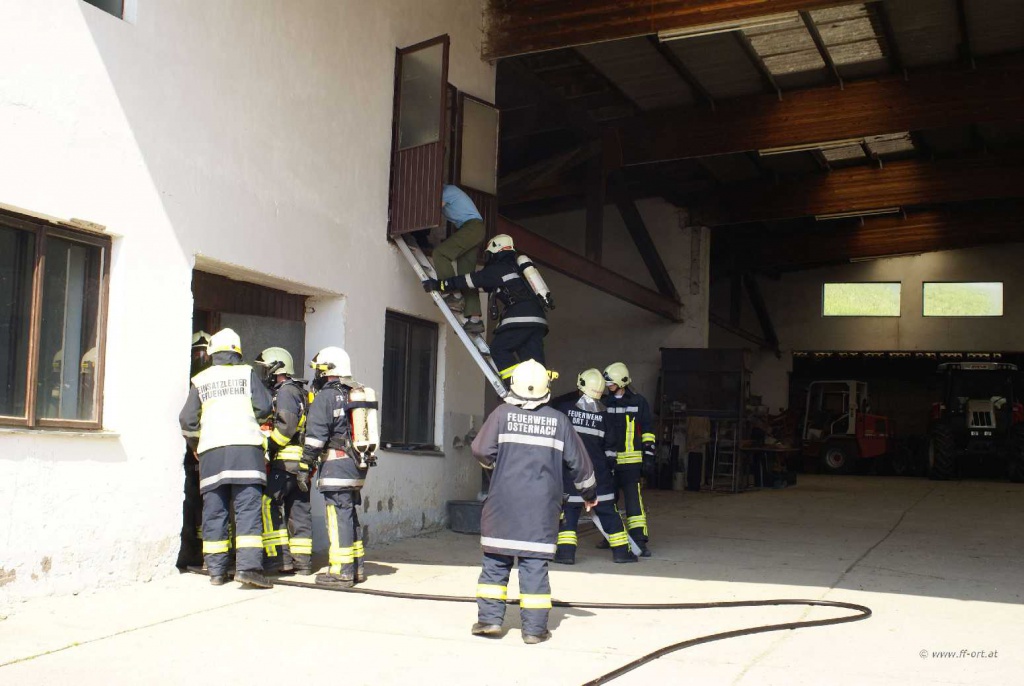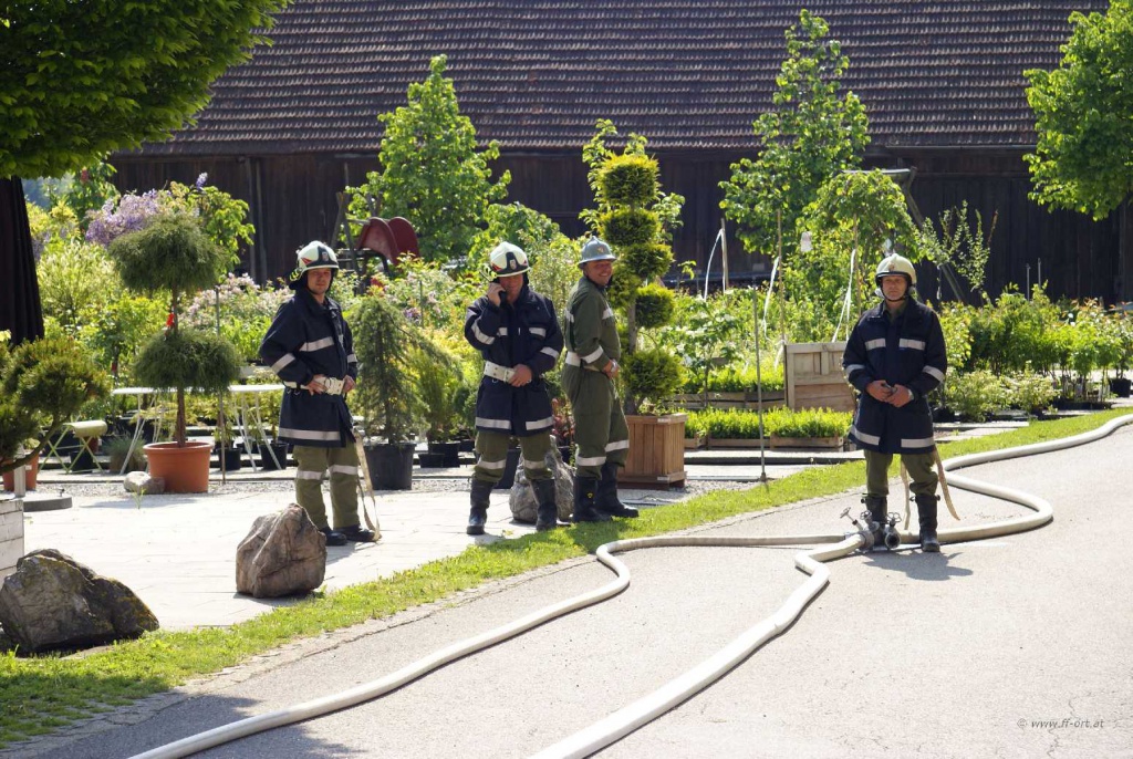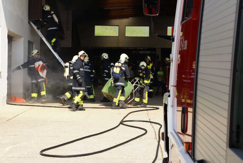 Übungsszenario war ein Brand im Heizraum bei Baumschule Gurtner in Osternach mit vermissten Personen, sowie eine eingeklemmte Person unter landwirtschaftlichen Gerät.