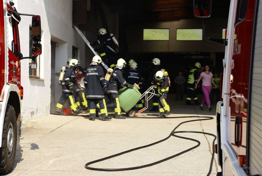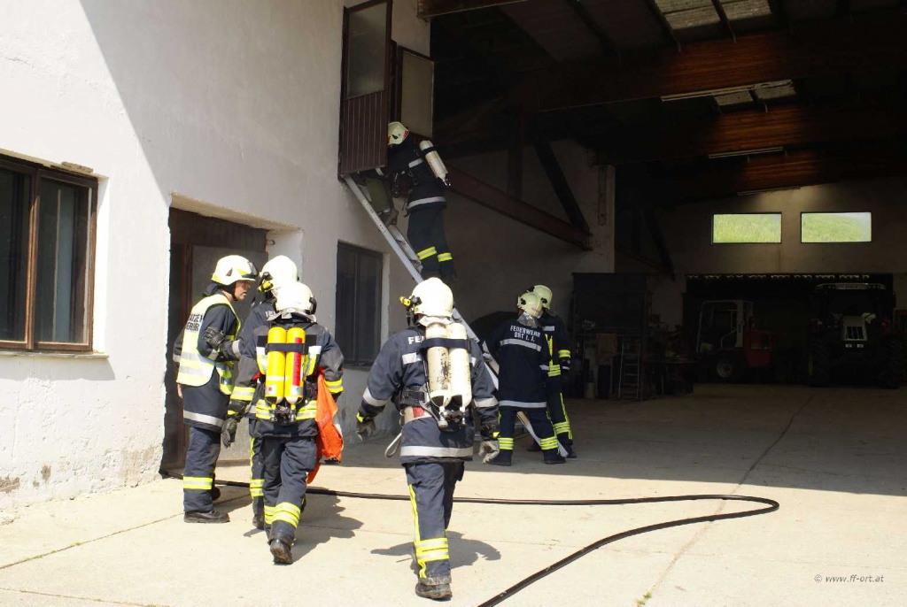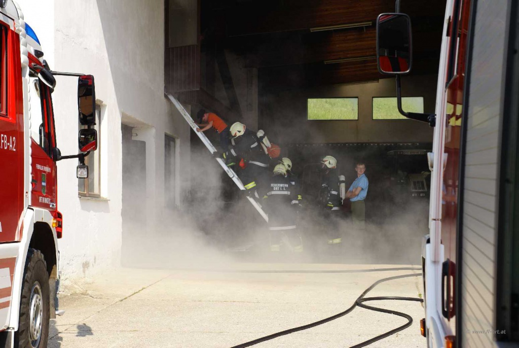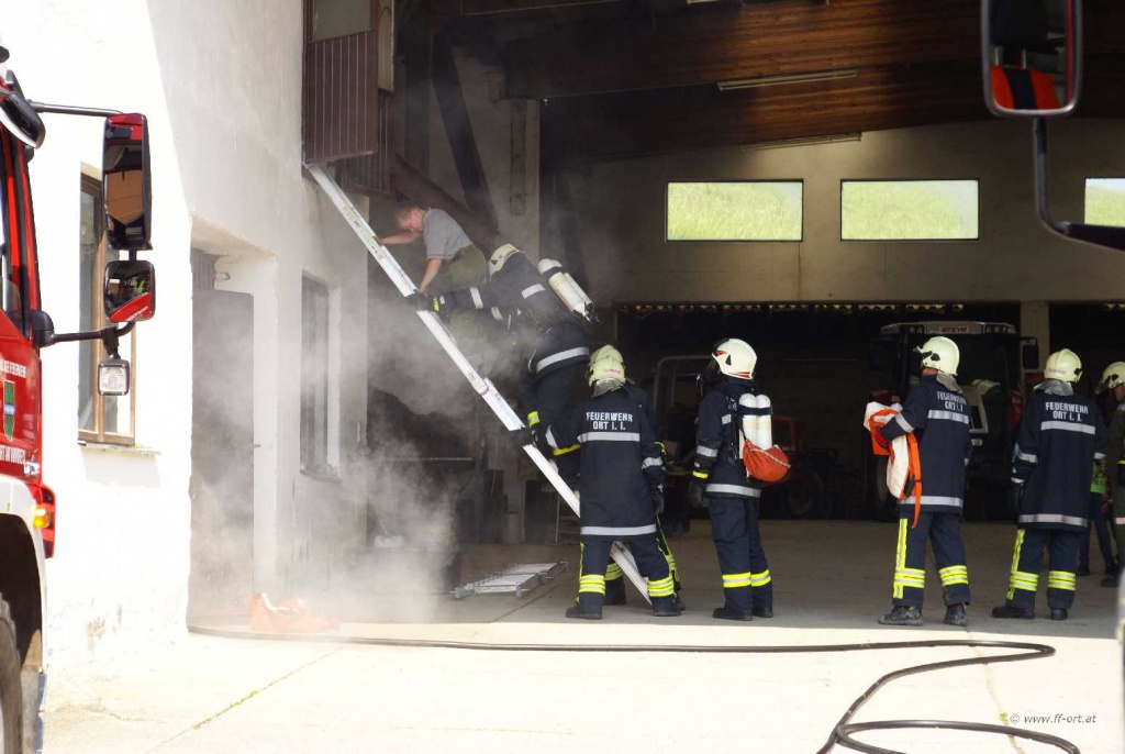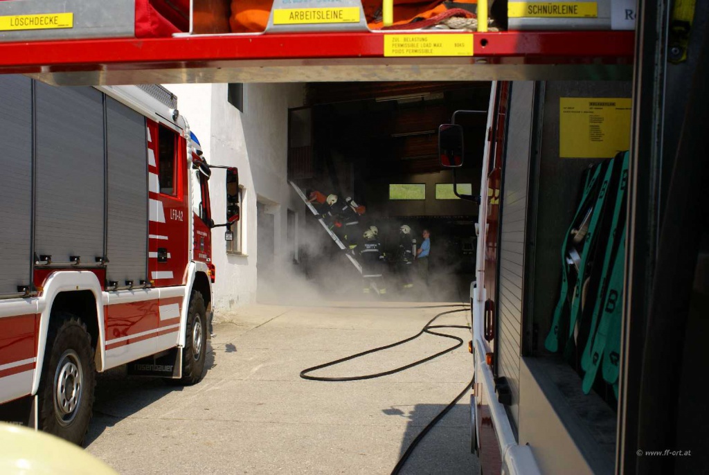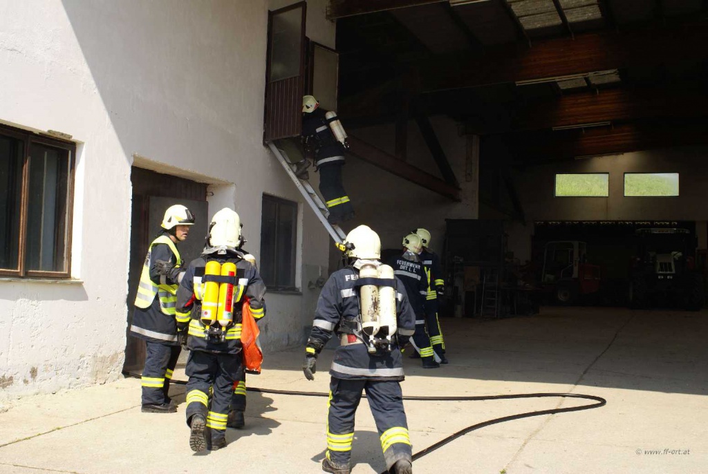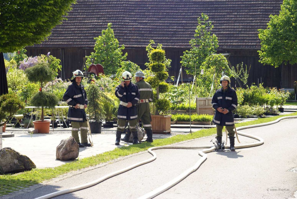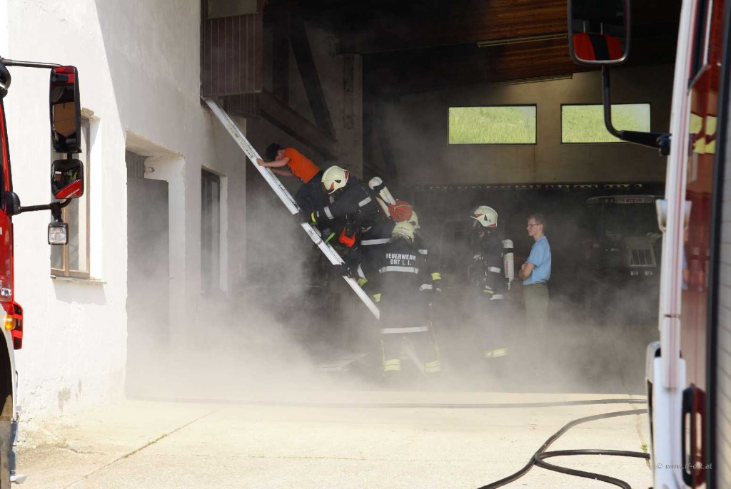 Übungsszenario war ein Brand im Heizraum bei Baumschule Gurtner in Osternach mit vermissten Personen, sowie eine eingeklemmte Person unter landwirtschaftlichen Gerät.