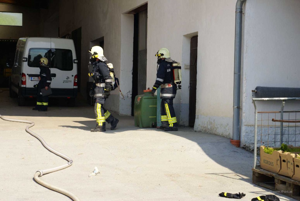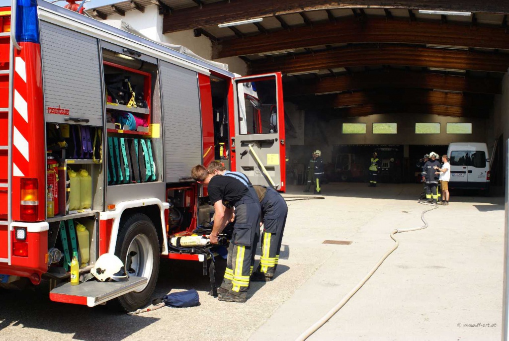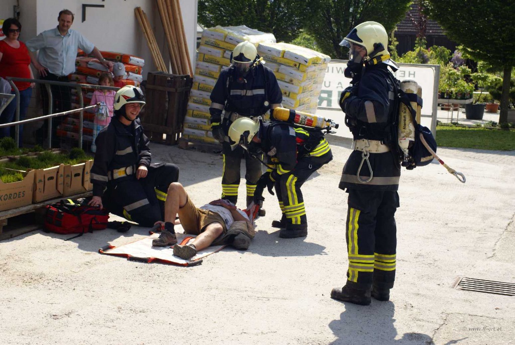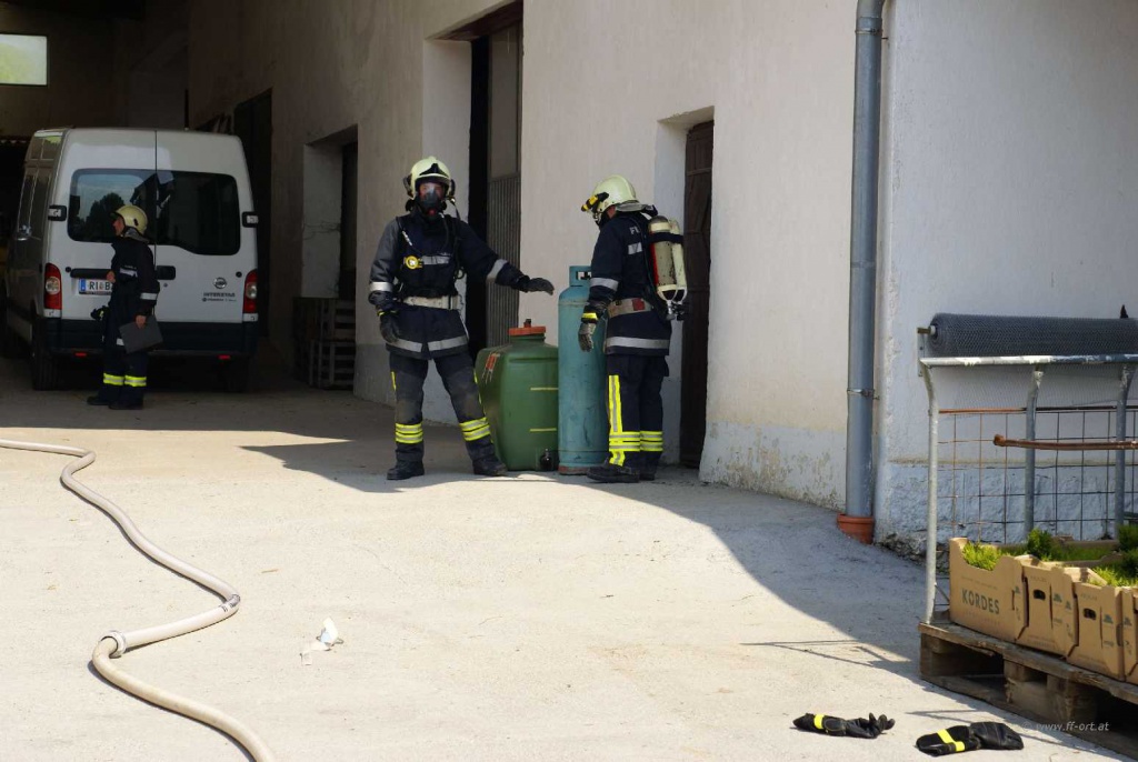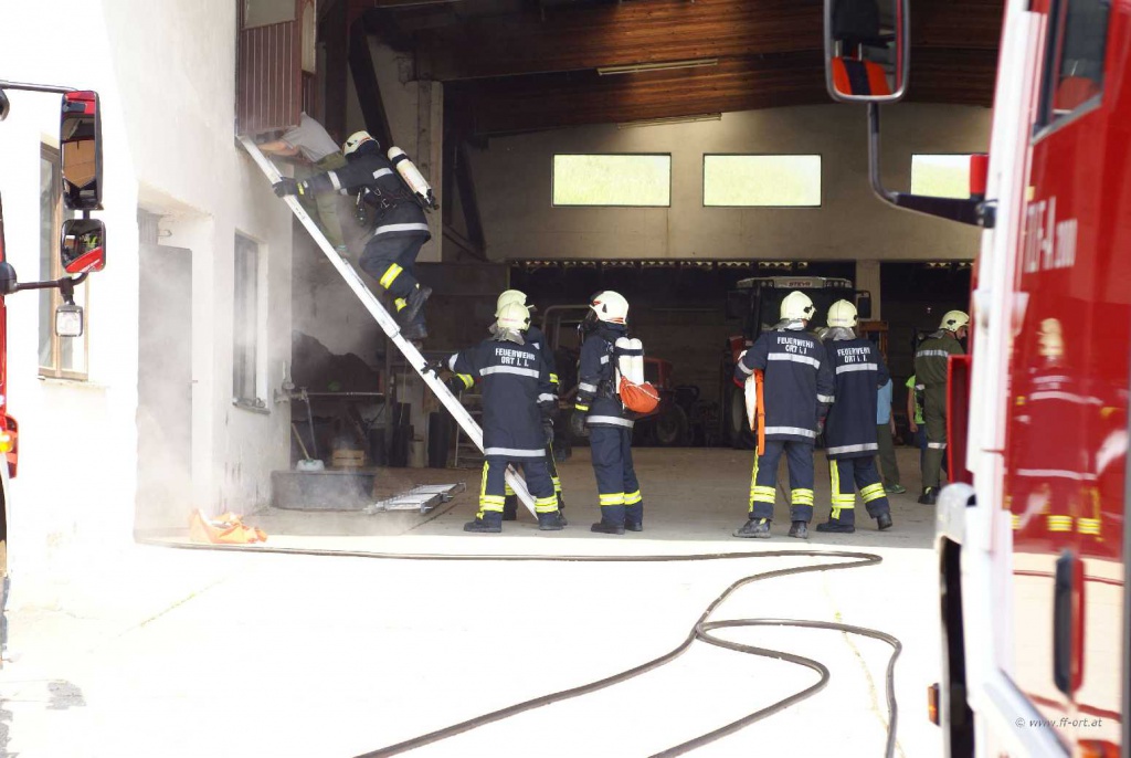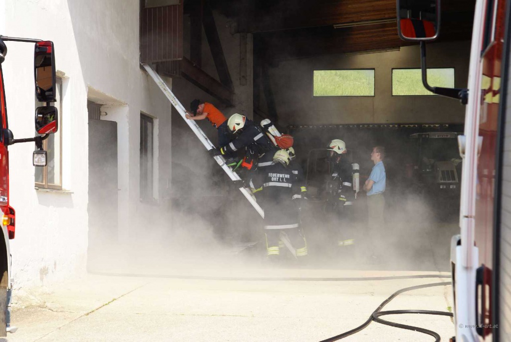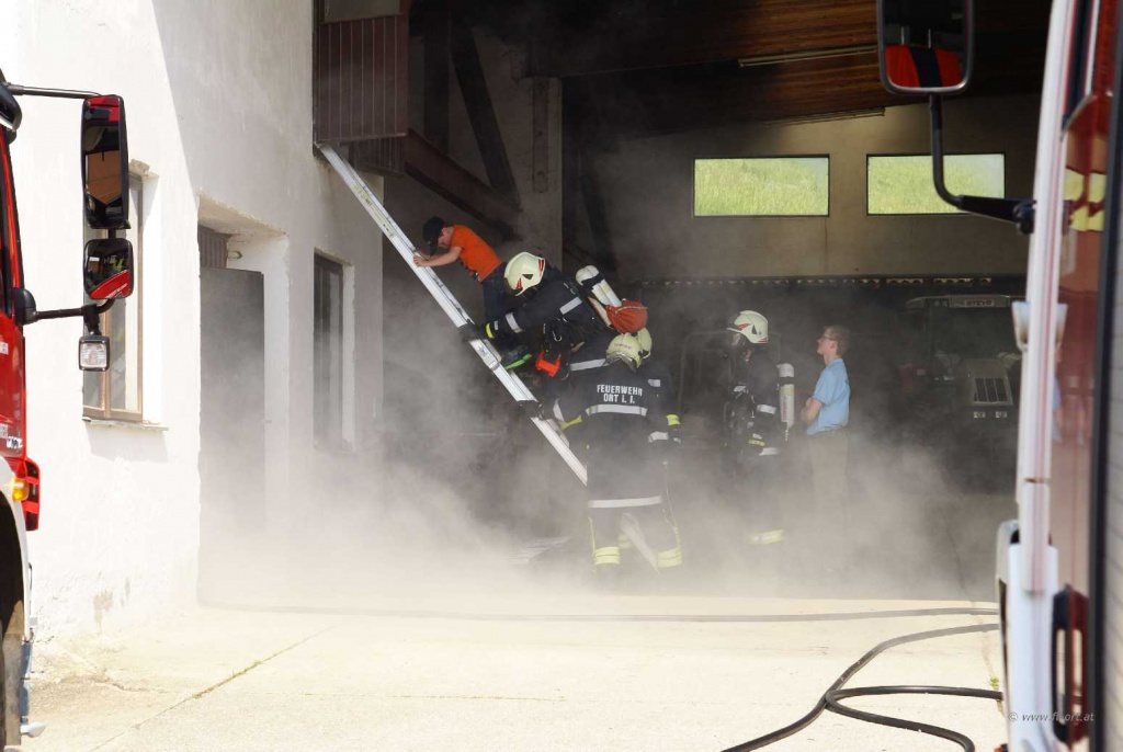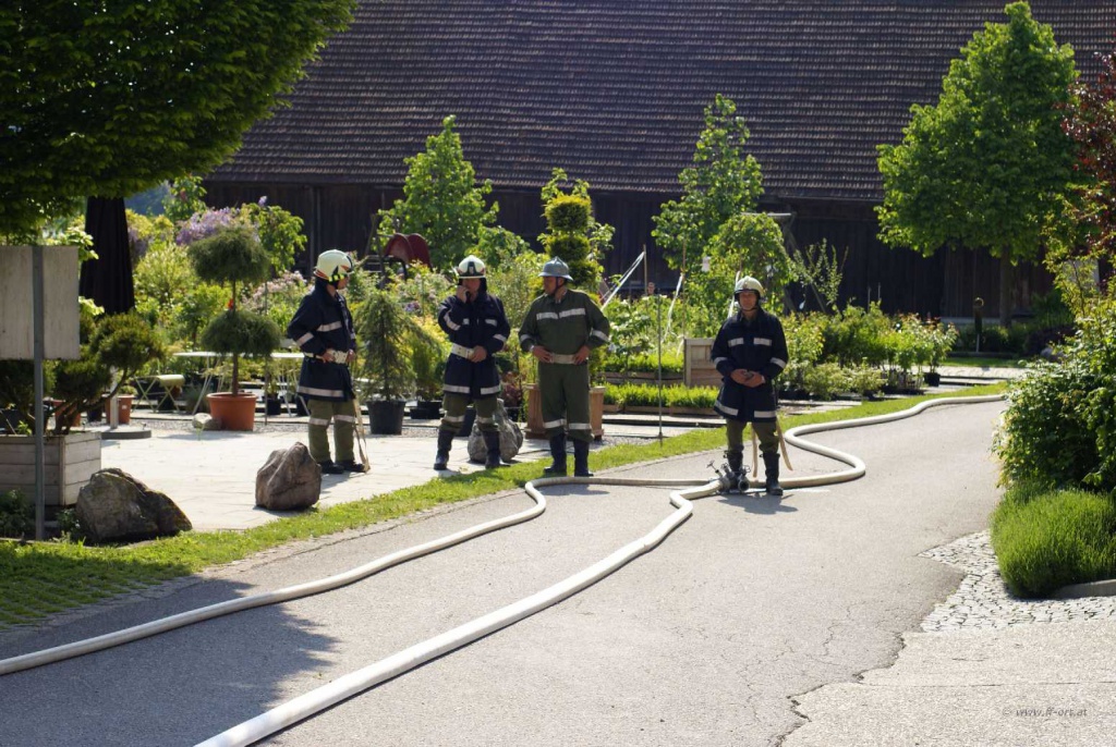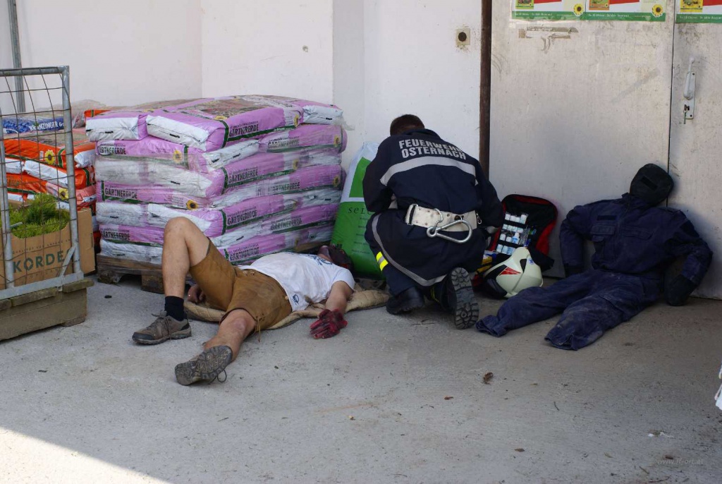 Übungsszenario war ein Brand im Heizraum bei Baumschule Gurtner in Osternach mit vermissten Personen, sowie eine eingeklemmte Person unter landwirtschaftlichen Gerät.
