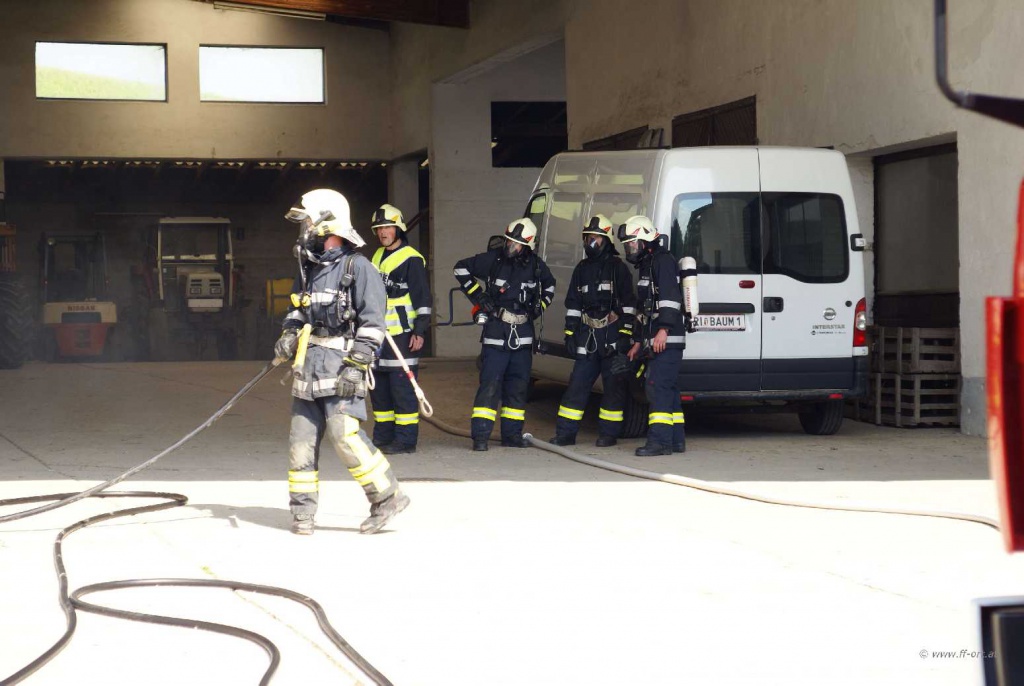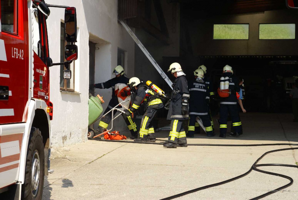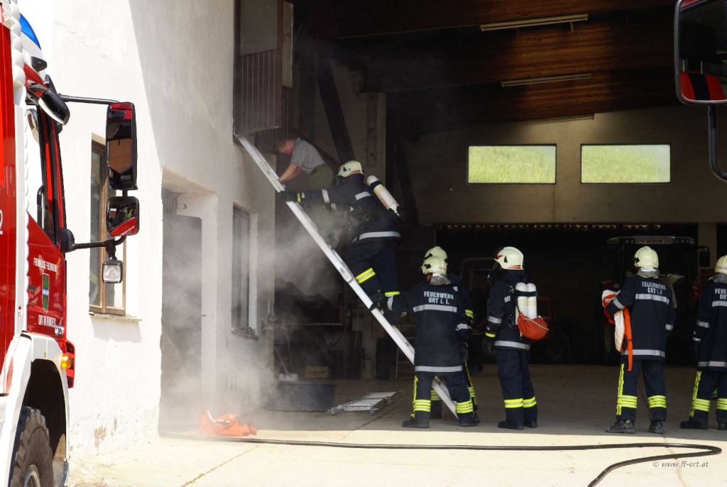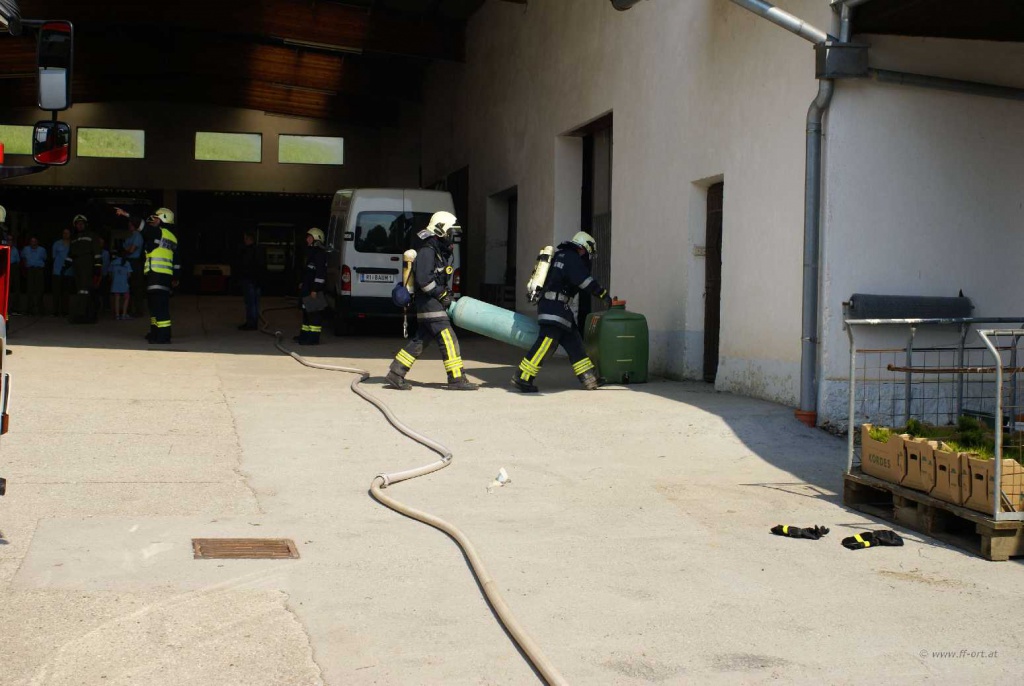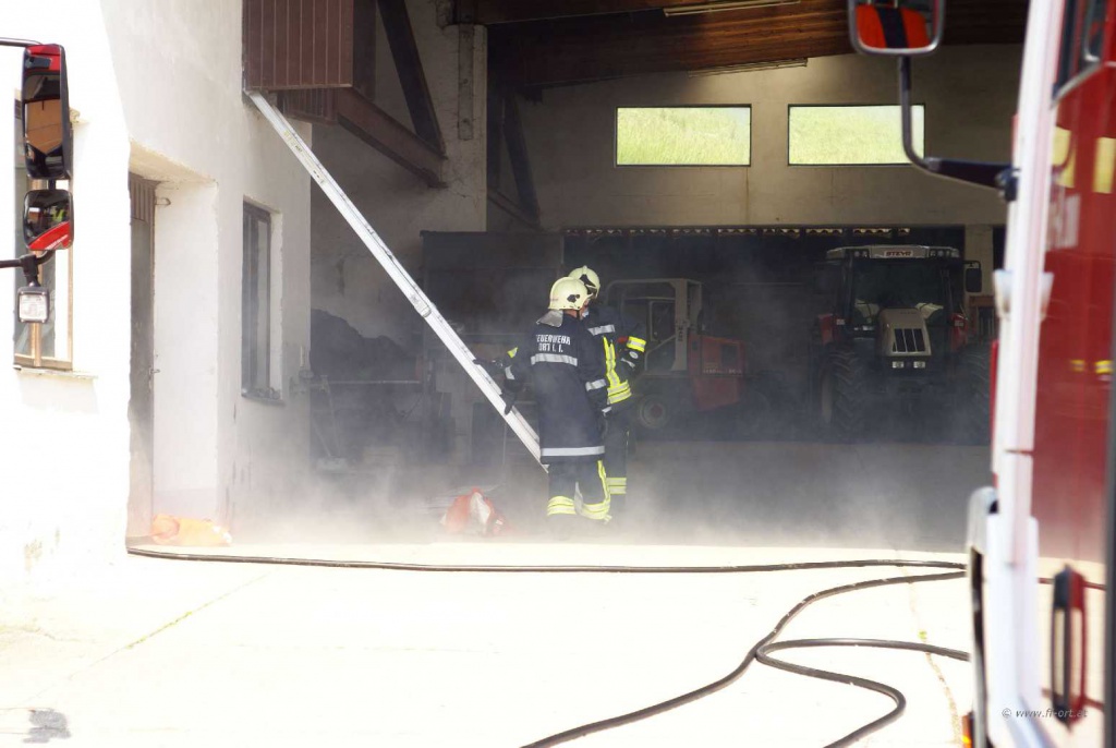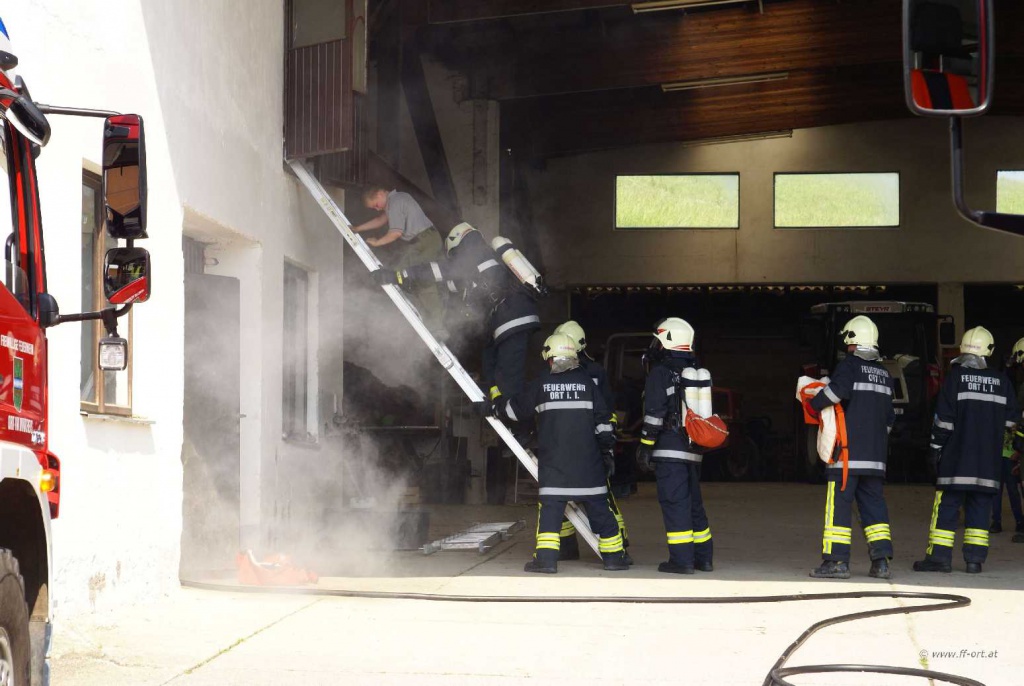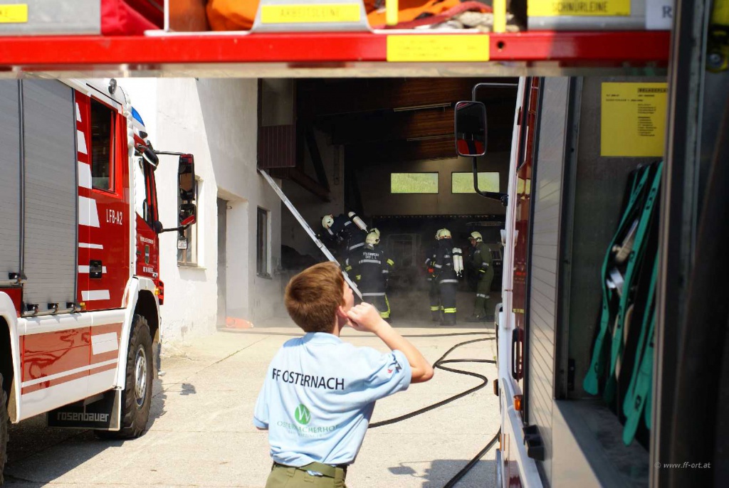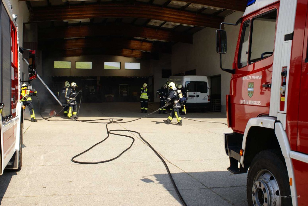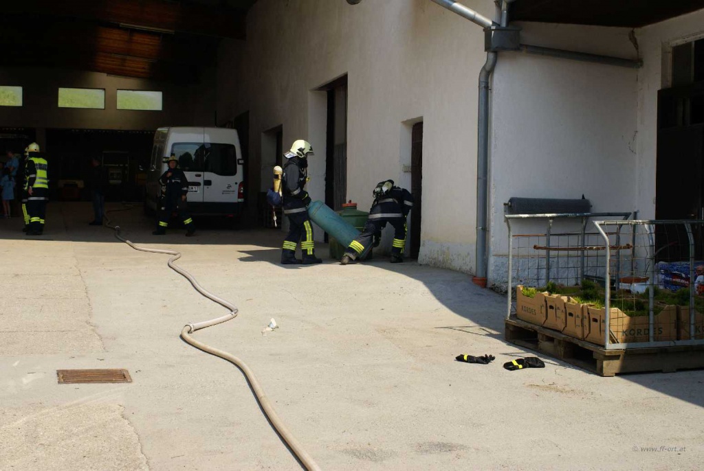 Übungsszenario war ein Brand im Heizraum bei Baumschule Gurtner in Osternach mit vermissten Personen, sowie eine eingeklemmte Person unter landwirtschaftlichen Gerät.