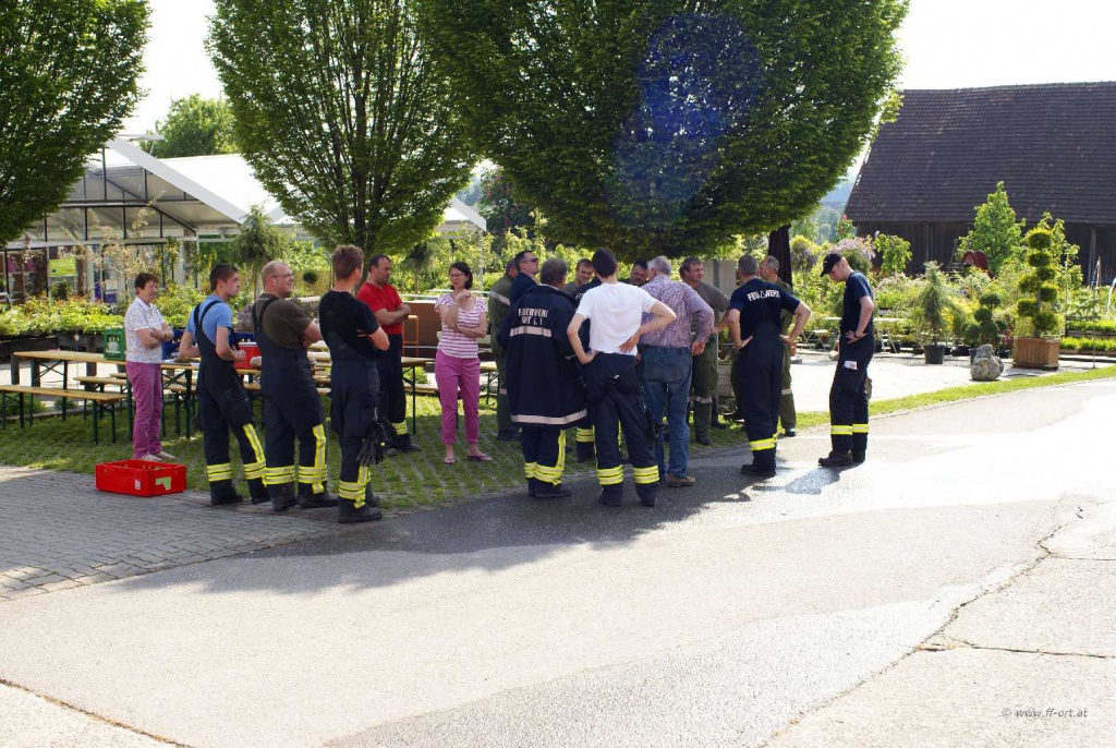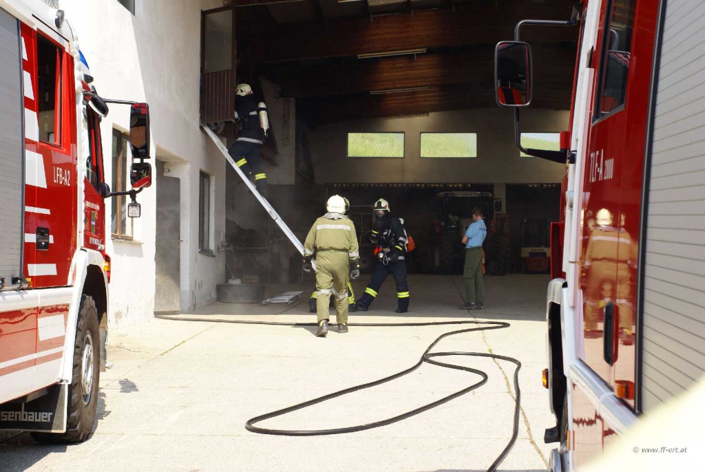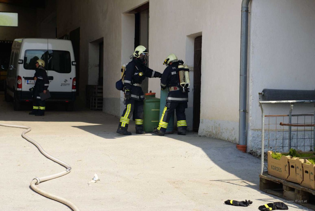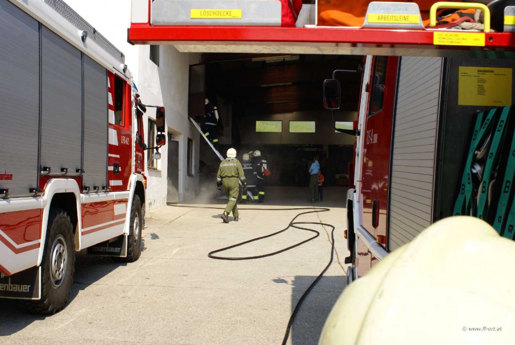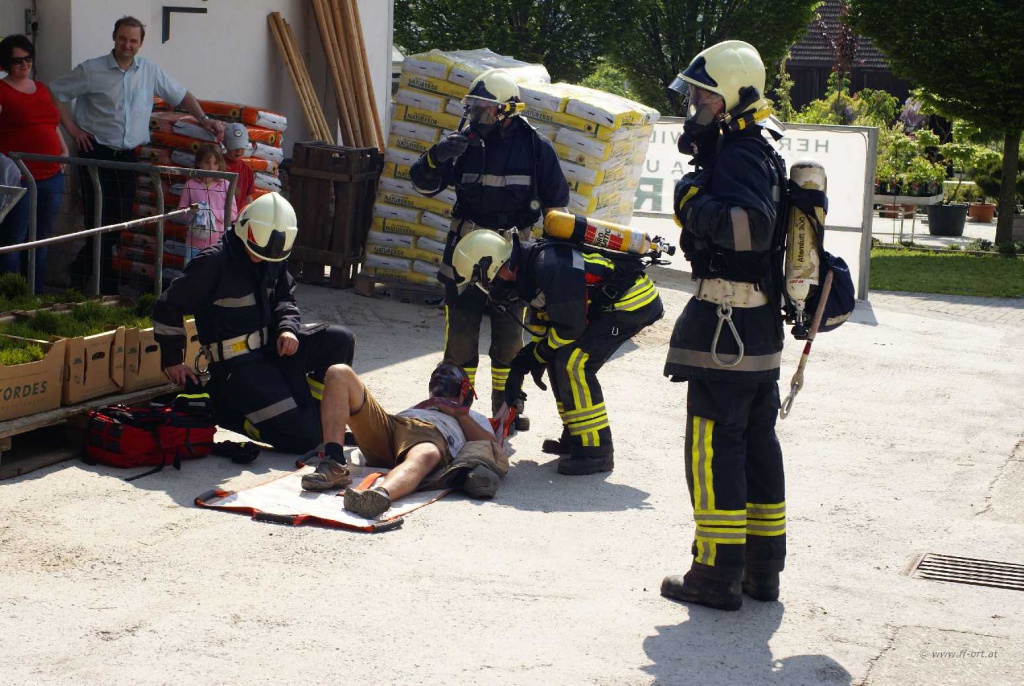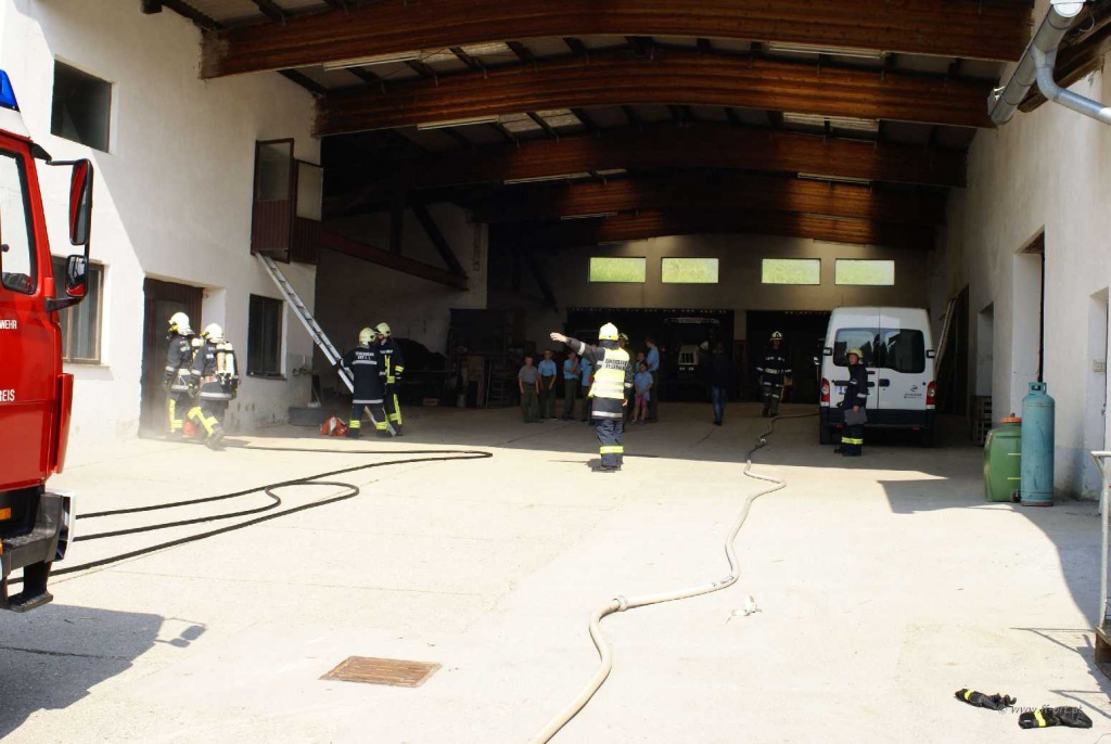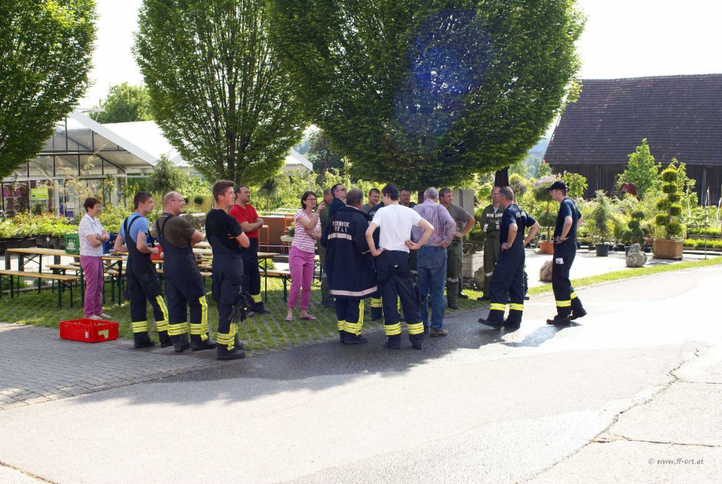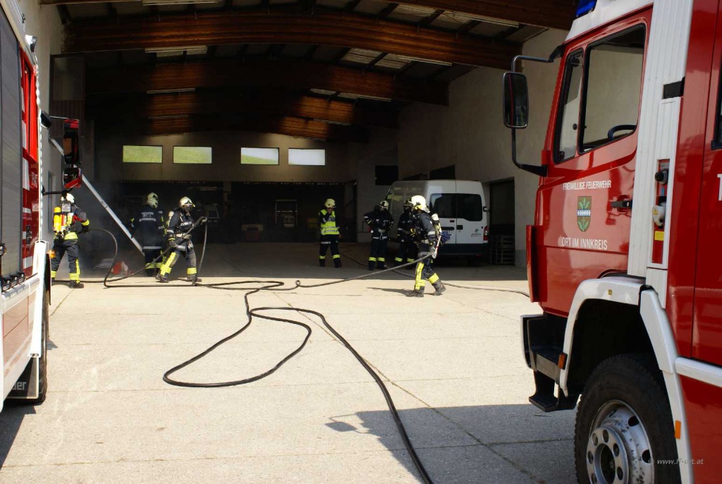 Übungsszenario war ein Brand im Heizraum bei Baumschule Gurtner in Osternach mit vermissten Personen, sowie eine eingeklemmte Person unter landwirtschaftlichen Gerät.