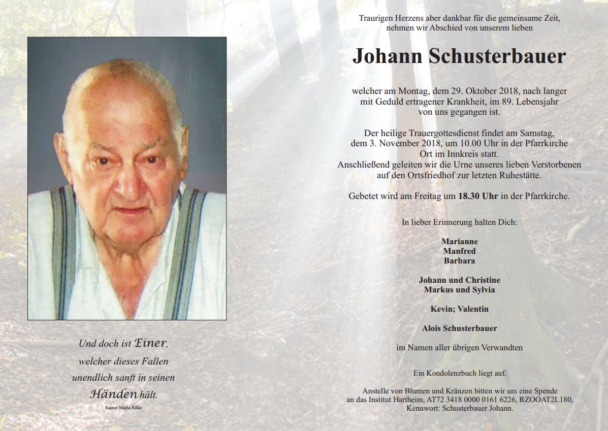 Am 3. November 2018 geleiteten wir unseren Kameraden und Ehrenamtswalter Johann Schusterbauer zu seiner letzten Ruhestätte.Er verstab am 29. Oktober 2018 im 88. Lebensjahr. Er war über 60 Jahre im Dienste der Feuerwehr Ort. Dafür herzlichen Dank.