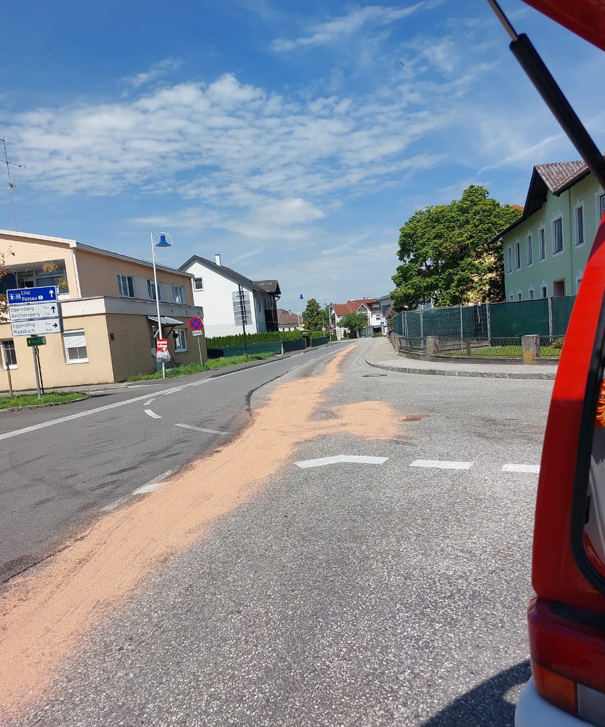 Die sich bis von der Harter Landesstraße bis auf die B148 ausdehnende Fahrbahnverschmutzung, konnte nach 2 Stunden beseitigt werden.