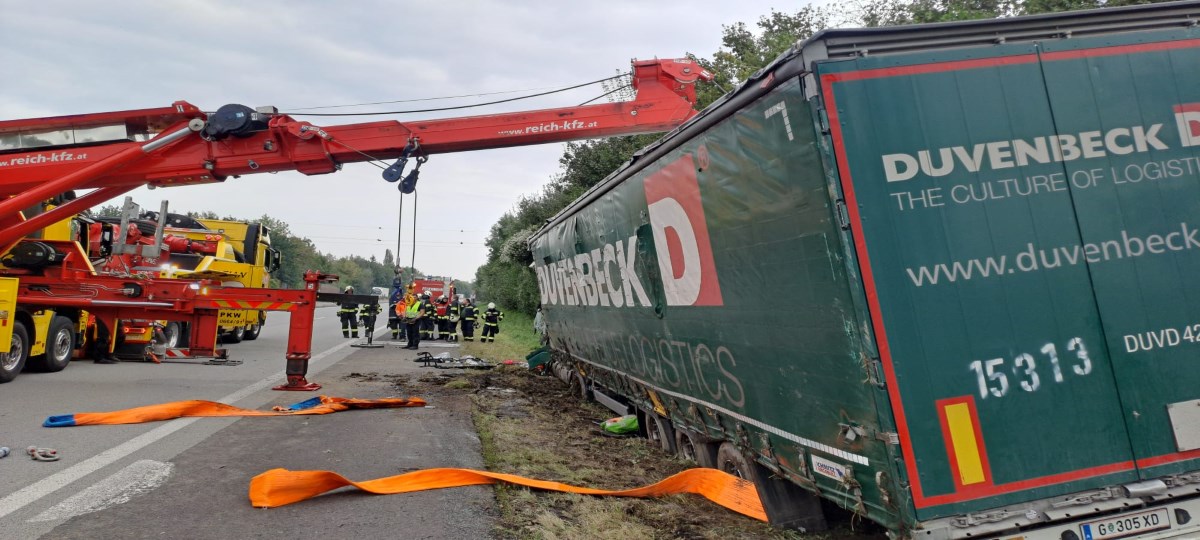 Dabei wurden der Fahrer und sein Beifahrer im Führerhaus eingeklemmt und erlitten schwere Verletzungen.