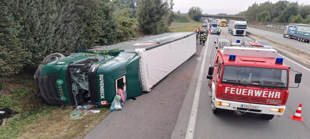 Am 18. September 2024 wurden die Feuerwehren Ort und Antiesenhofen zu einer Personenrettung nach LKW-Unfall auf der A8 alarmiert. Ein mit KFZ-Teilen beladener LKW kam von der Fahrbahn ab und stürzte um.
