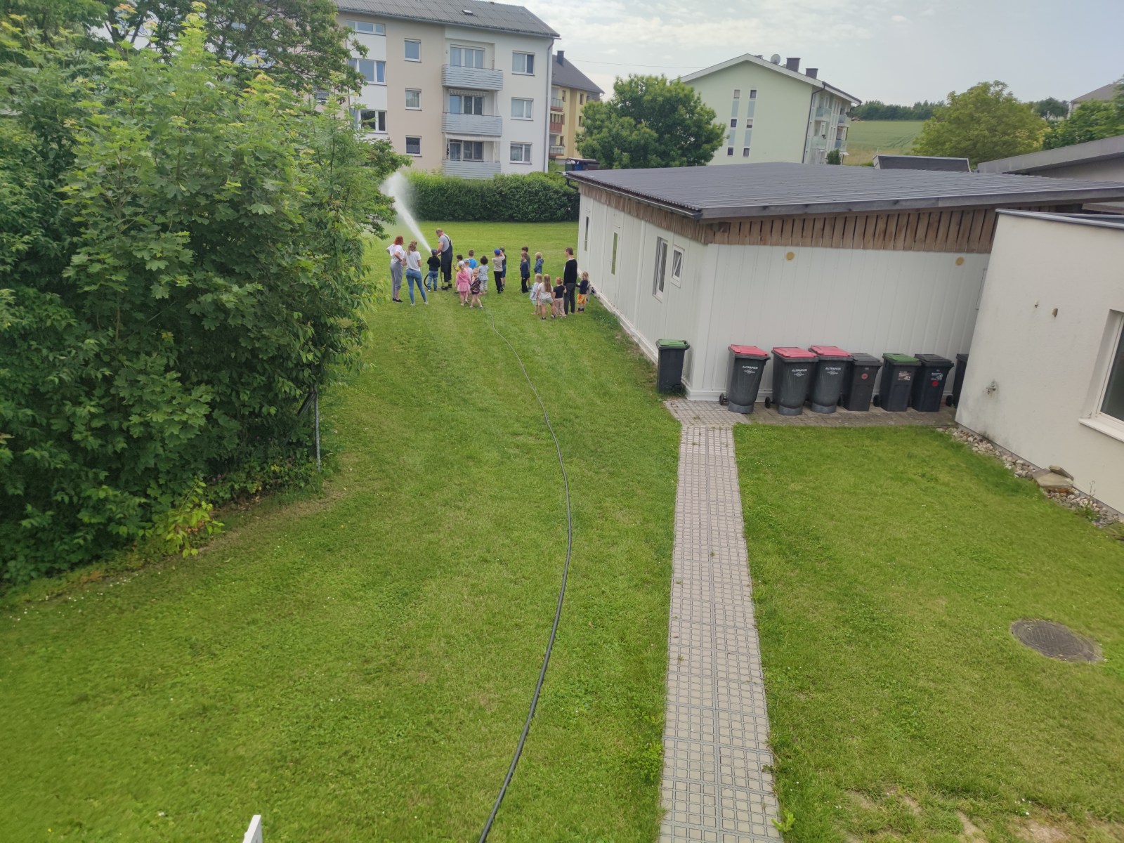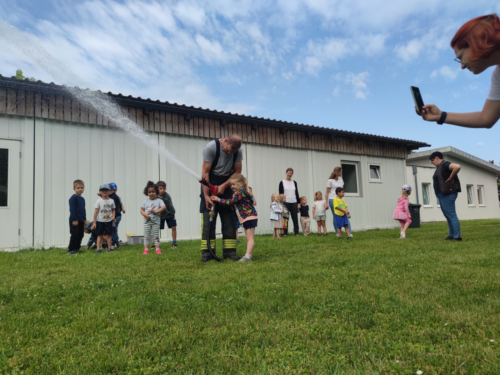 Die Kinder durften spielerisch in die Welt der Feuerwehr eintauchen: Mit großer Begeisterung wurden Wasser gespritzt, Ausrüstung ausprobiert und Feuerwehrfahrzeuge erkundet. Das sonnige Wetter war perfekt für diese Aktion und sorgte für strahlende Kinderaugen.